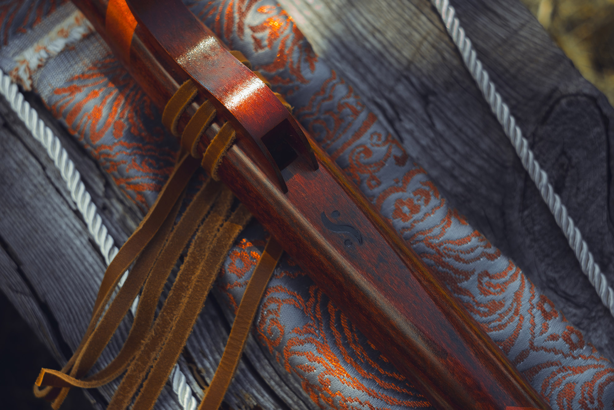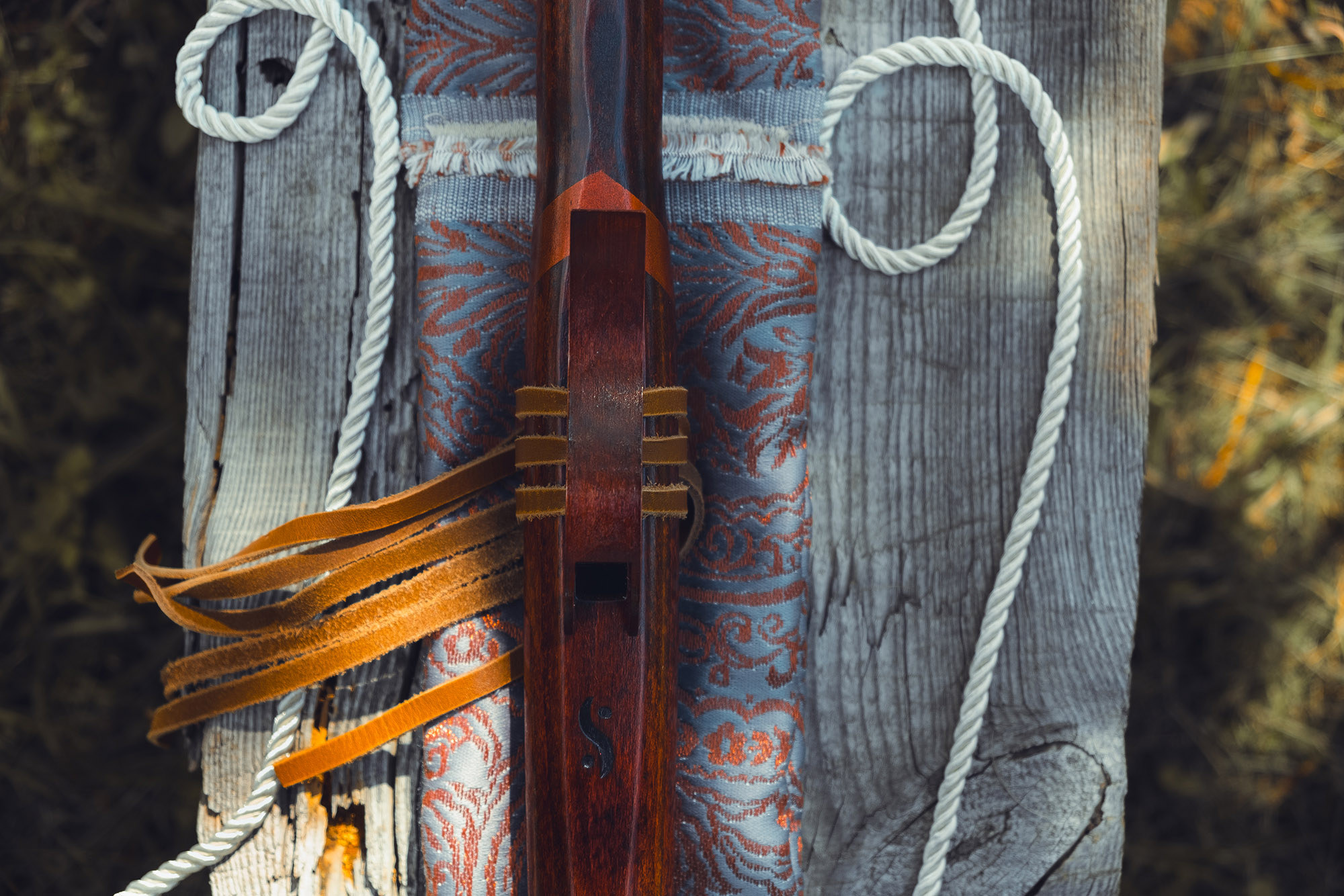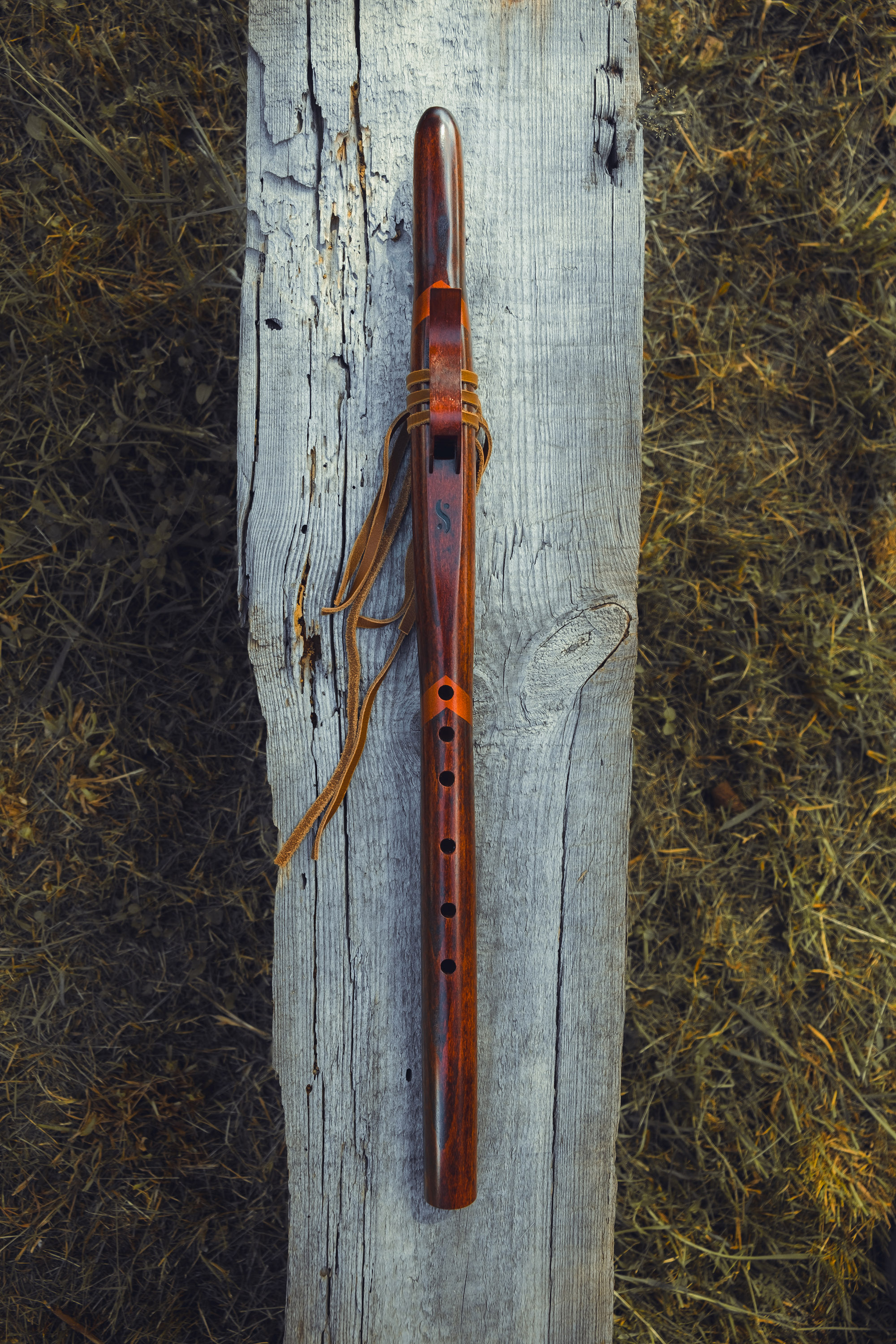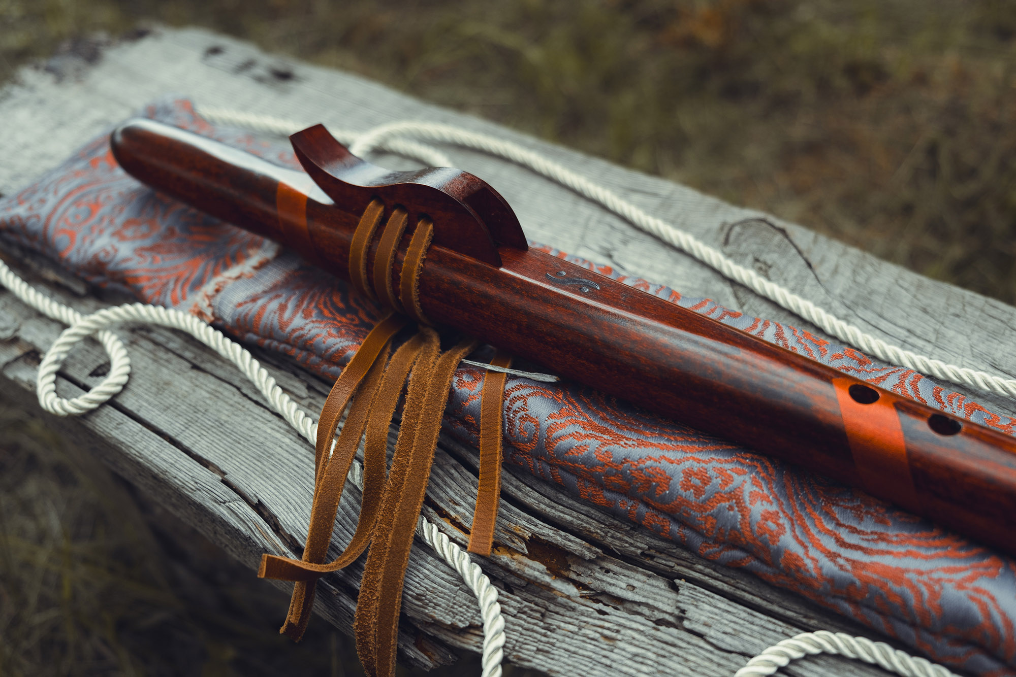Ręcznie wykonany flet z drewna buku zwyczajnego (Fagus sylvatica), pozyskanego z recyklingu, charakteryzuje się ciepłym i bogatym brzmieniem. Flet prosty, 6-otworowy, inspirowany tradycją rdzennych Amerykanów (Native American Style Flute). Skala pentatoniczna i heksatonika molowa zapewniają szeroką ekspresję muzyczną. Flet został zabarwiony na rustykalny mahoń z miedzianymi ornamentami, a wykończenie typu French polishing (Tru-Oil – 6 warstw) zapewnia trwałość i estetykę. Dokumentacja obejmuje konserwację, warunki przechowywania oraz certyfikat autentyczności.