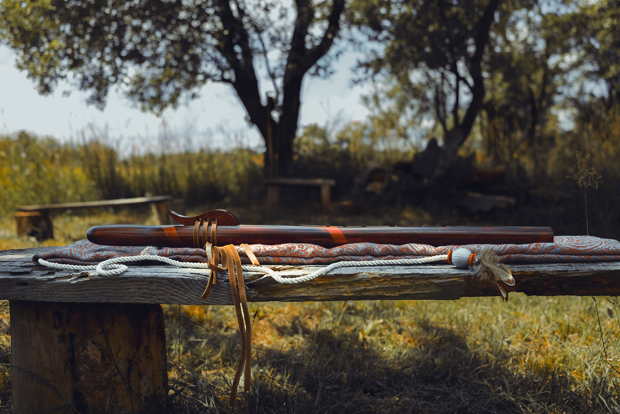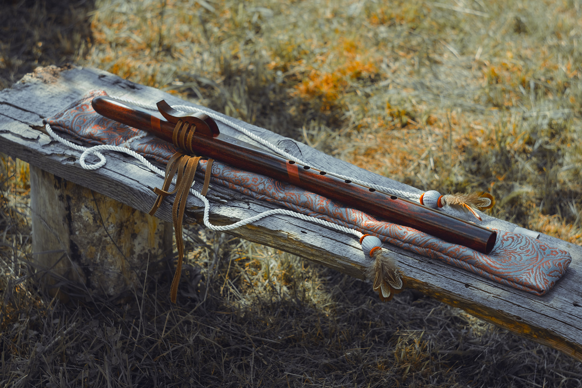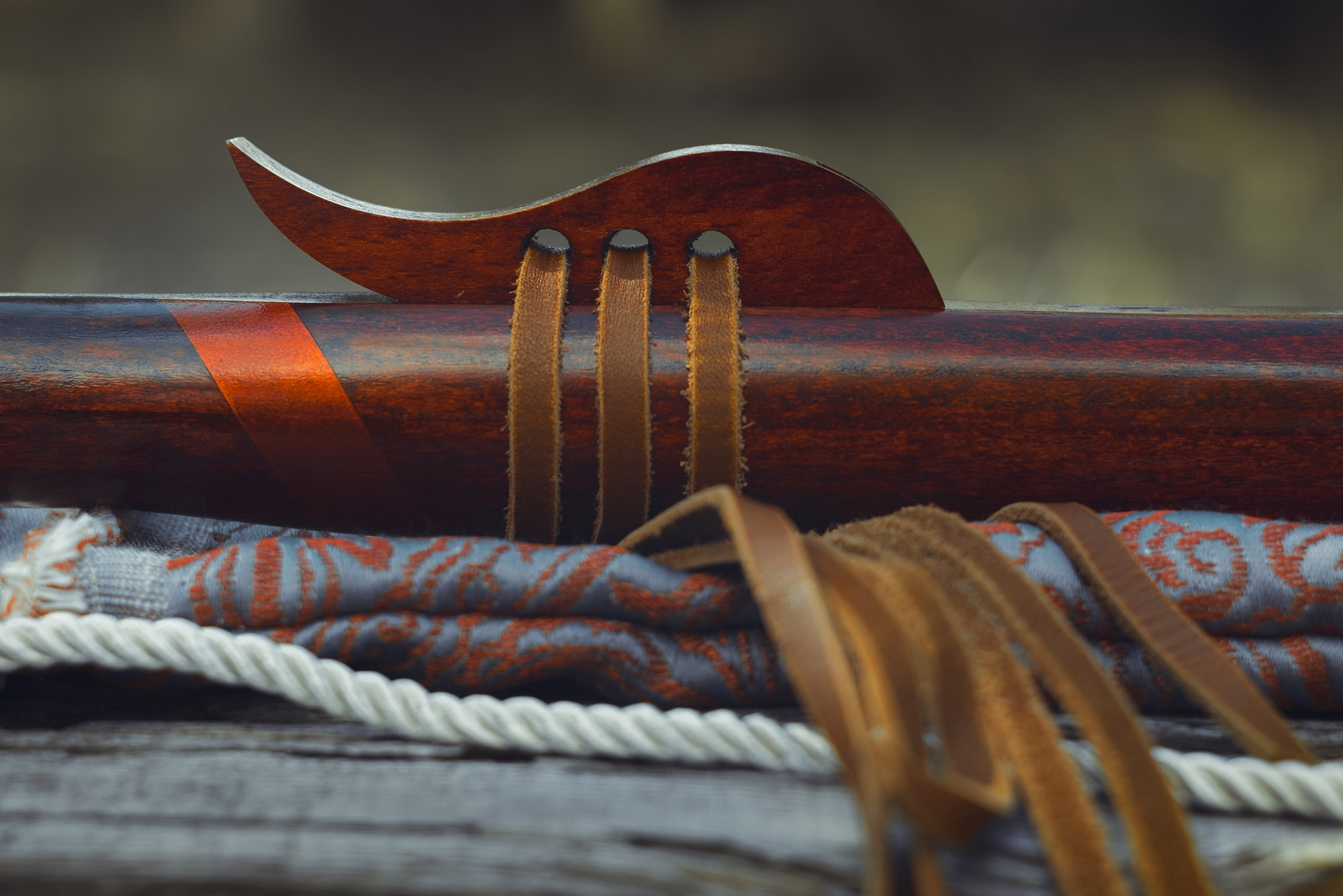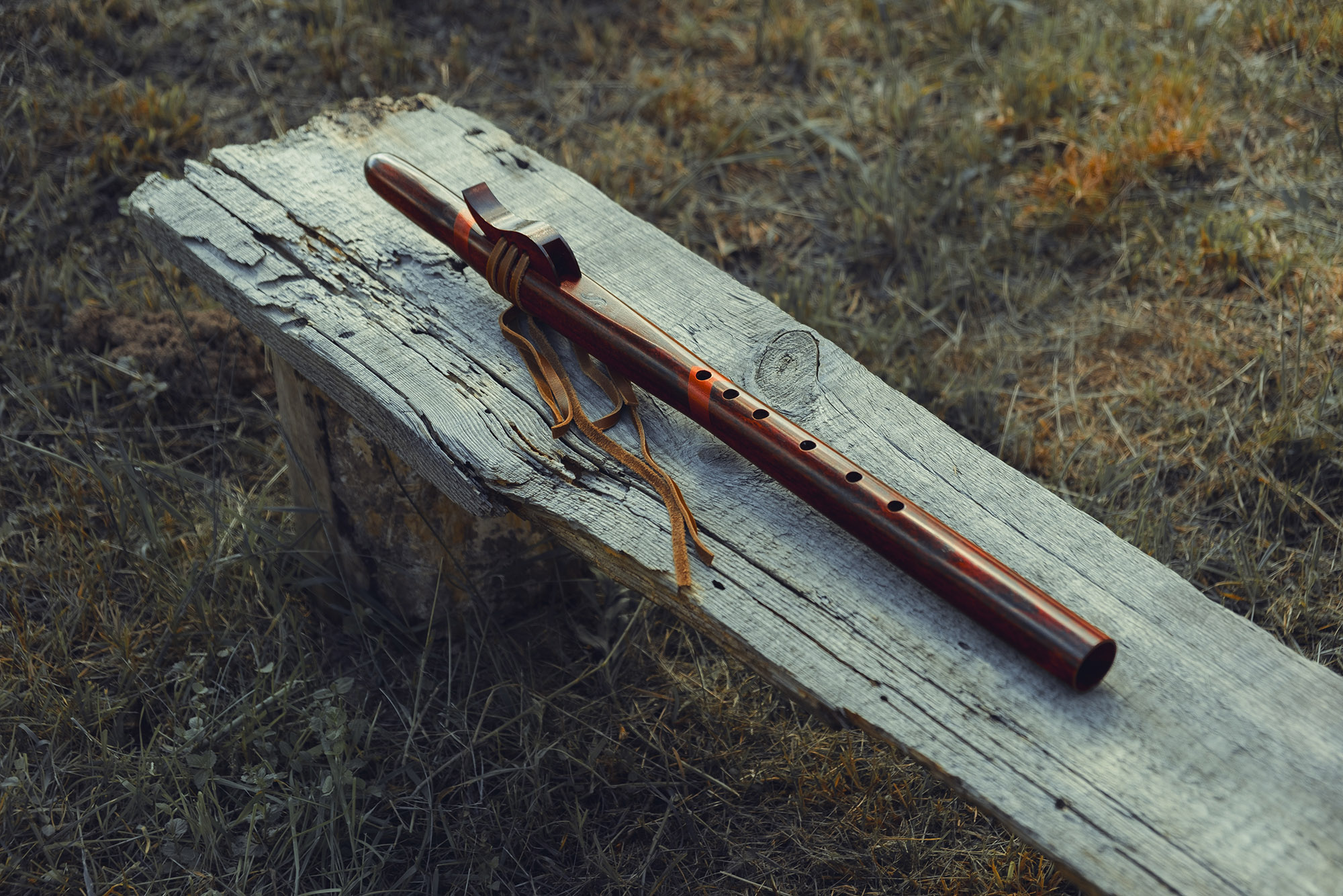Ręcznie wykonany flet z drewna buku zwyczajnego (Fagus sylvatica), pozyskanego z recyklingu, charakteryzuje się ciepłym i bogatym brzmieniem. Flet prosty, 6-otworowy, inspirowany tradycją rdzennych Amerykanów (Native American Style Flute). Skala pentatoniczna i heksatonika molowa zapewniają szeroką ekspresję muzyczną. Flet został zabarwiony na rustykalny mahoń z miedzianymi ornamentami, a wykończenie typu French polishing (Tru-Oil – 6 warstw) zapewnia trwałość i estetykę. Dokumentacja obejmuje konserwację, warunki przechowywania oraz certyfikat autentyczności.