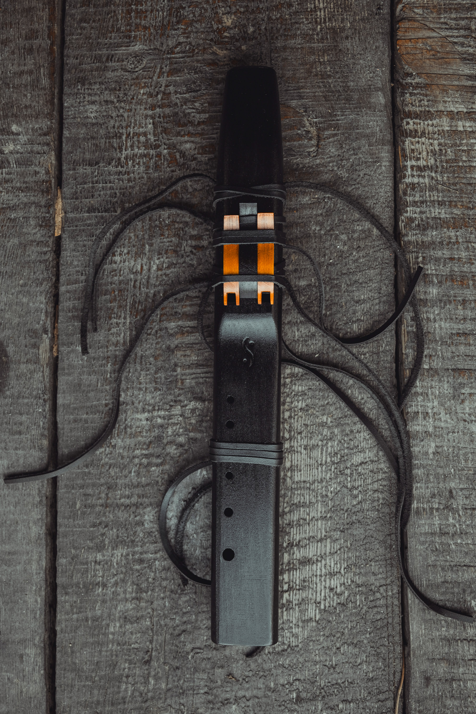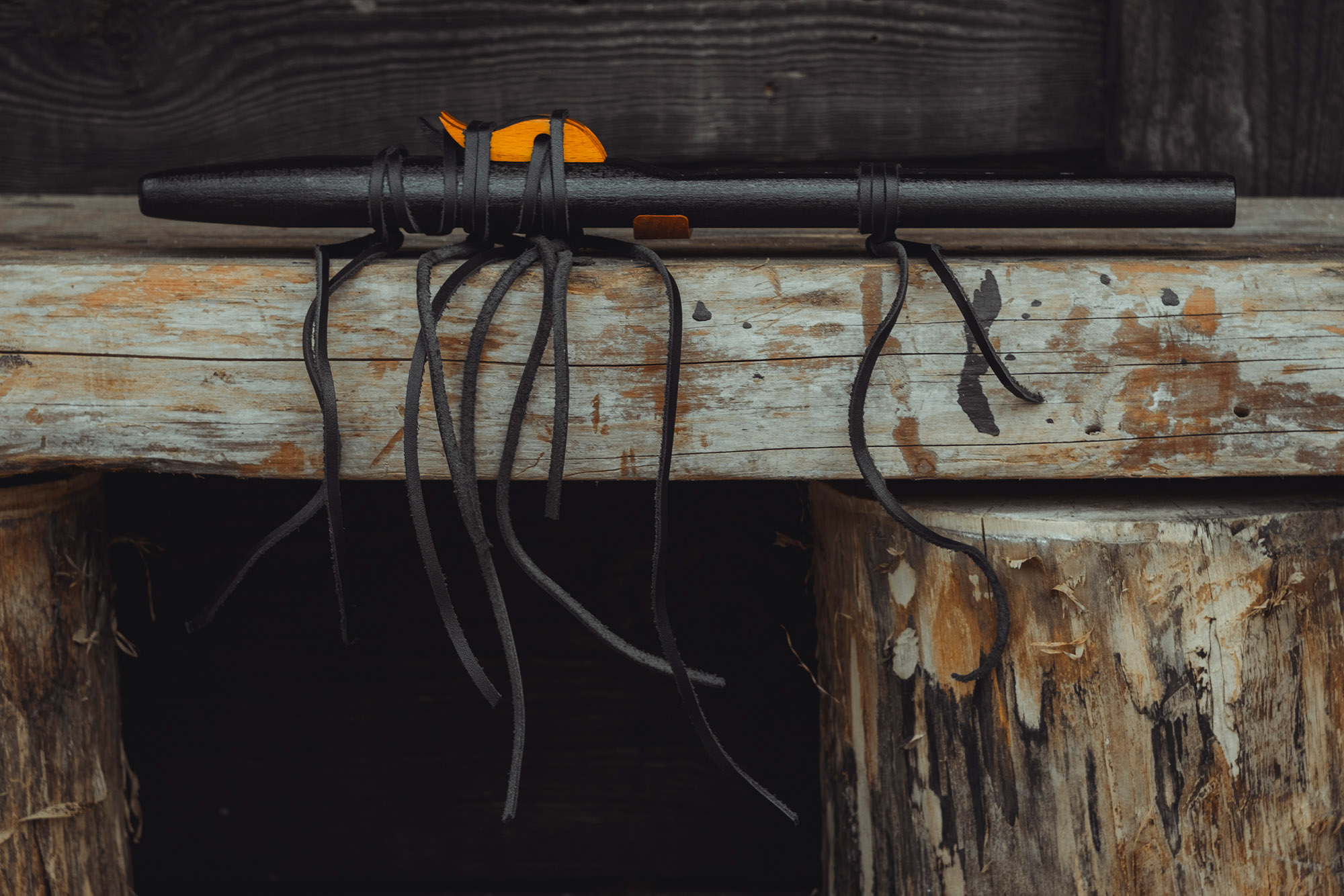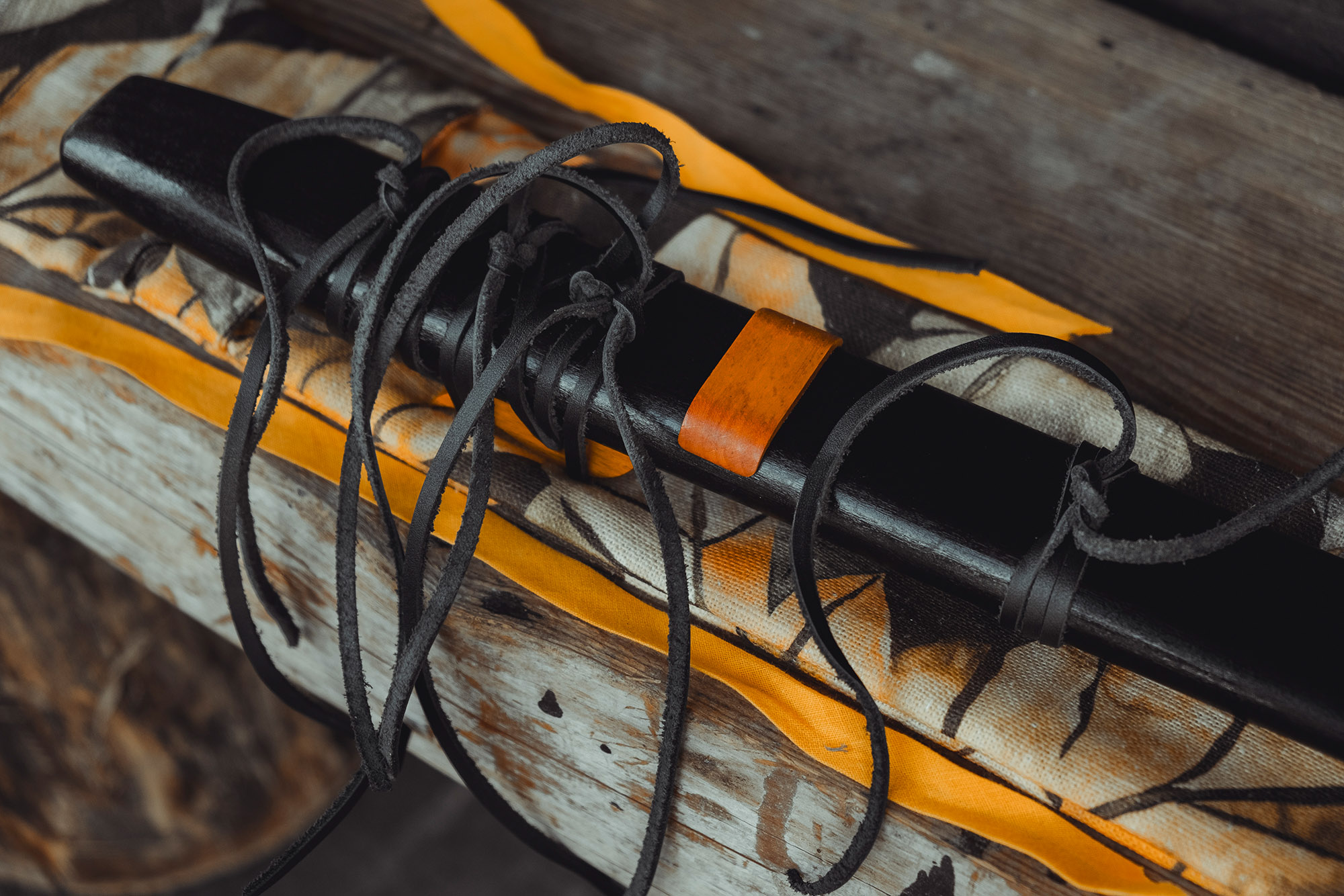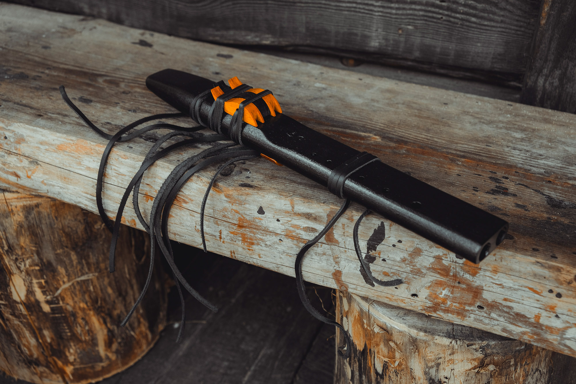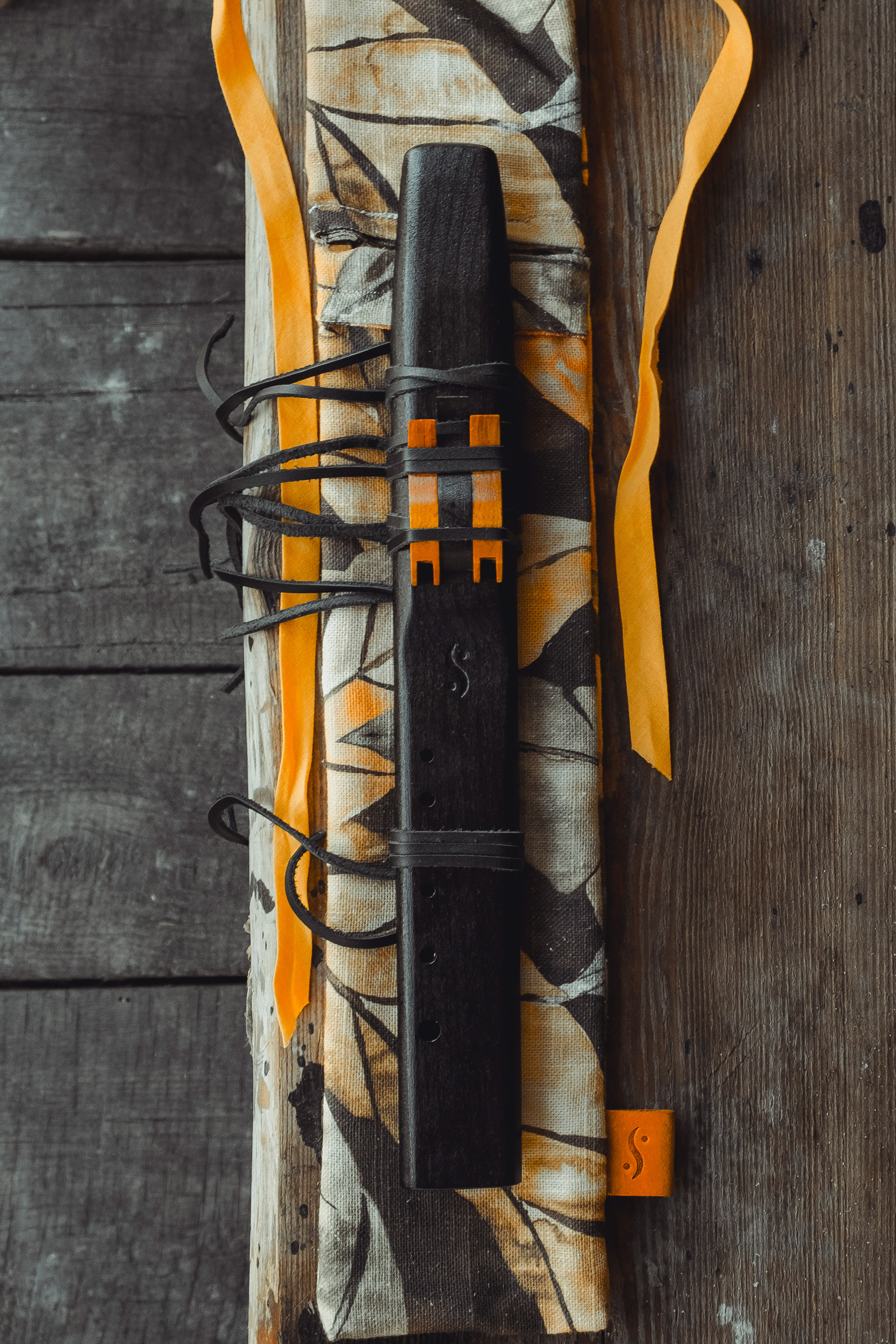 Ręcznie wykonany flet z drewna buku (Fagus sylvatica), pozyskanego z recyklingu. Flet prosty podwójny, 6-otworowy, inspirowany tradycją rdzennych Amerykanów (Native American Style Flute). Charakteryzuje się wysokim, altowym brzmieniem. Skala pentatoniczna i heksatonika molowa pozwalają na szeroką ekspresję muzyczną. Flet został zabarwiony bejcą na rustykalny czarny i żółty kolor, a wykończenie stanowi olejowanie typu French polishing (Tru-Oil – 4 warstwy). Dokumentacja zawiera szczegóły dotyczące konserwacji, przechowywania oraz certyfikat autentyczności.