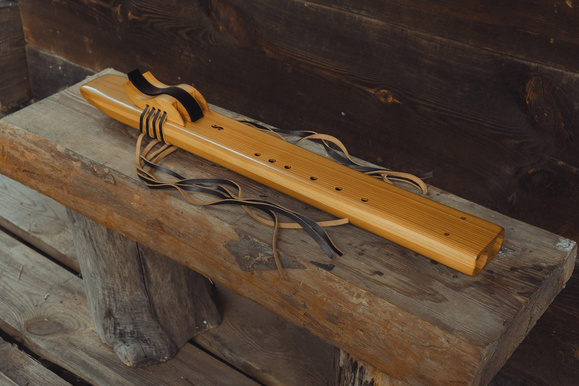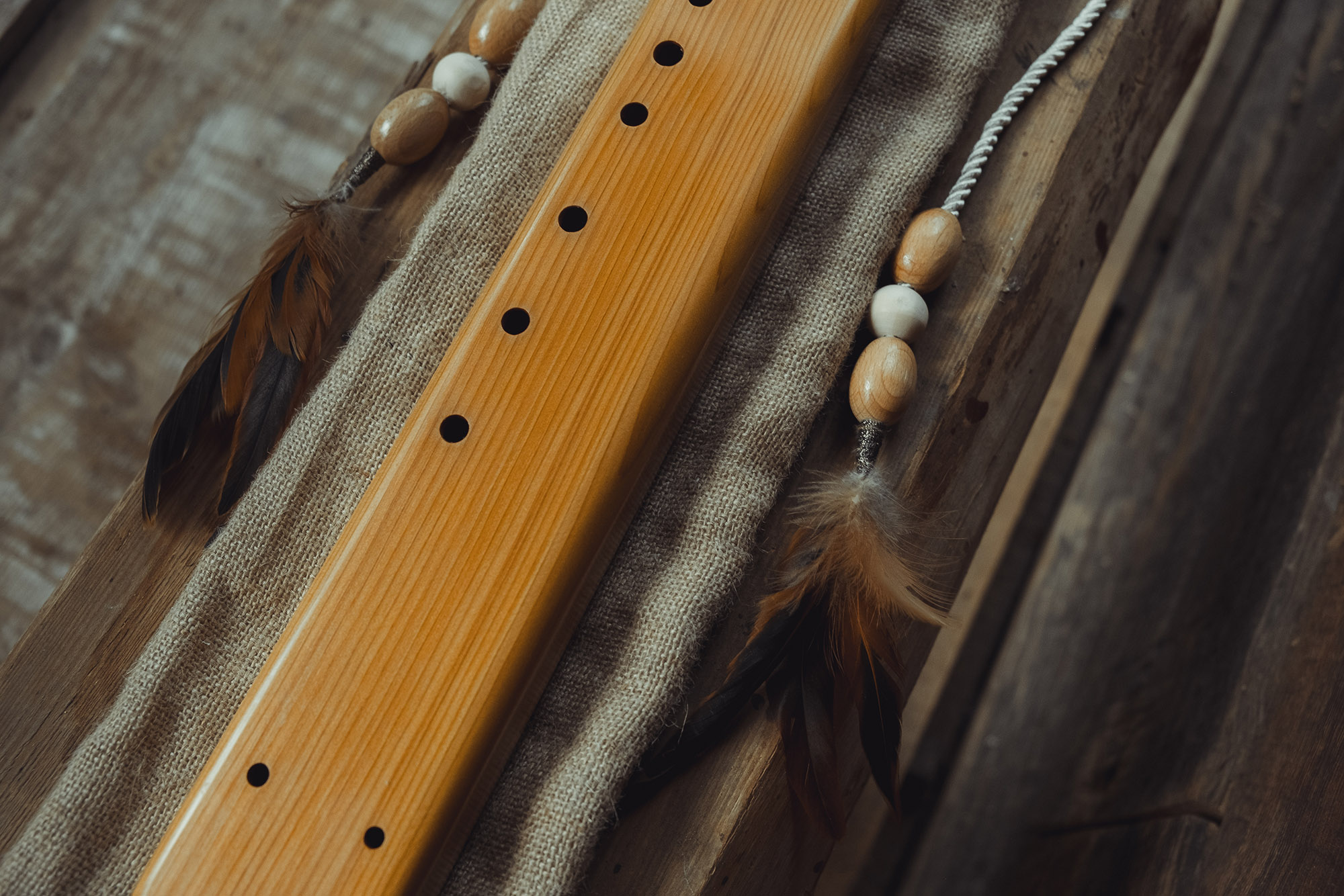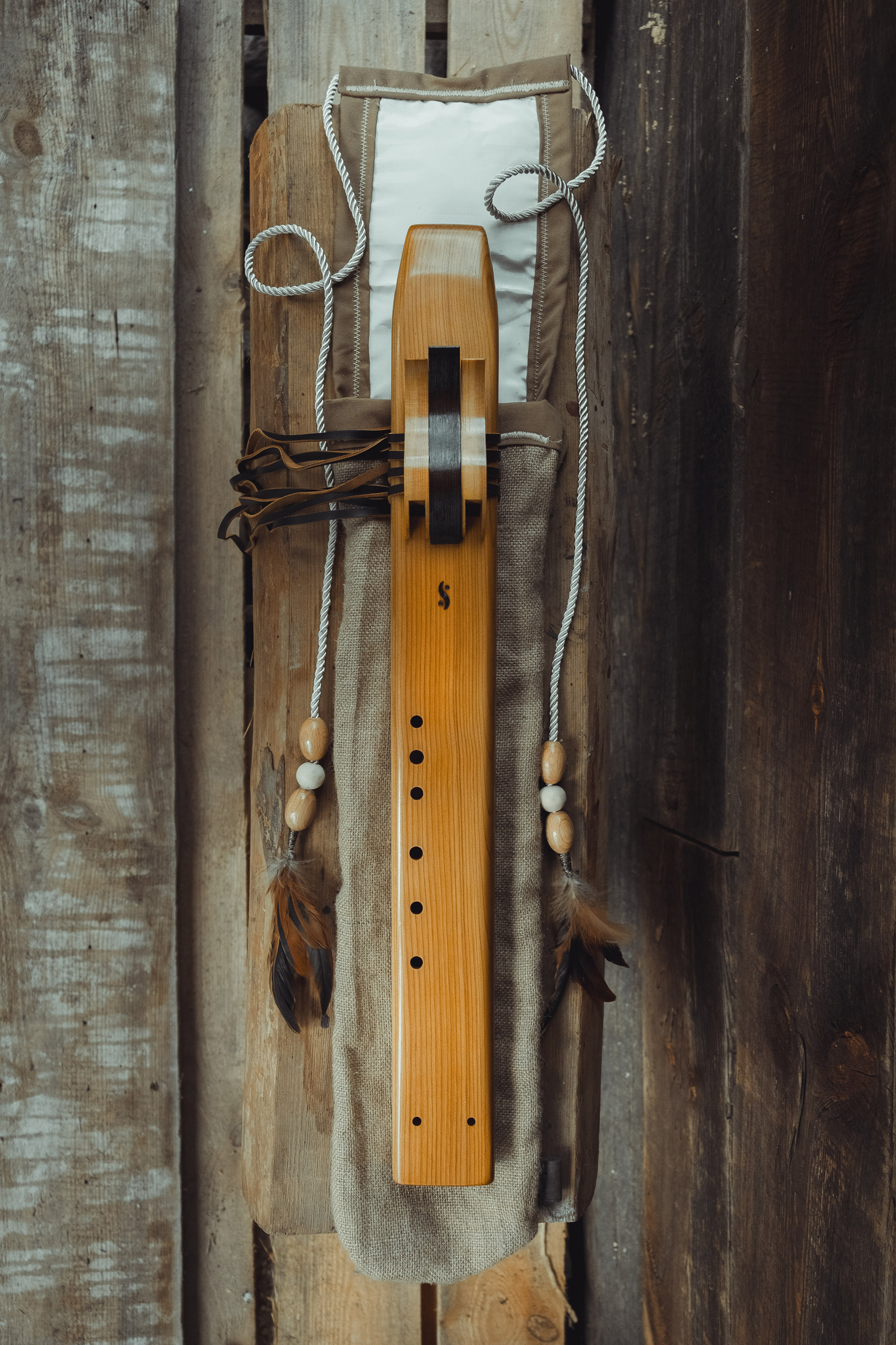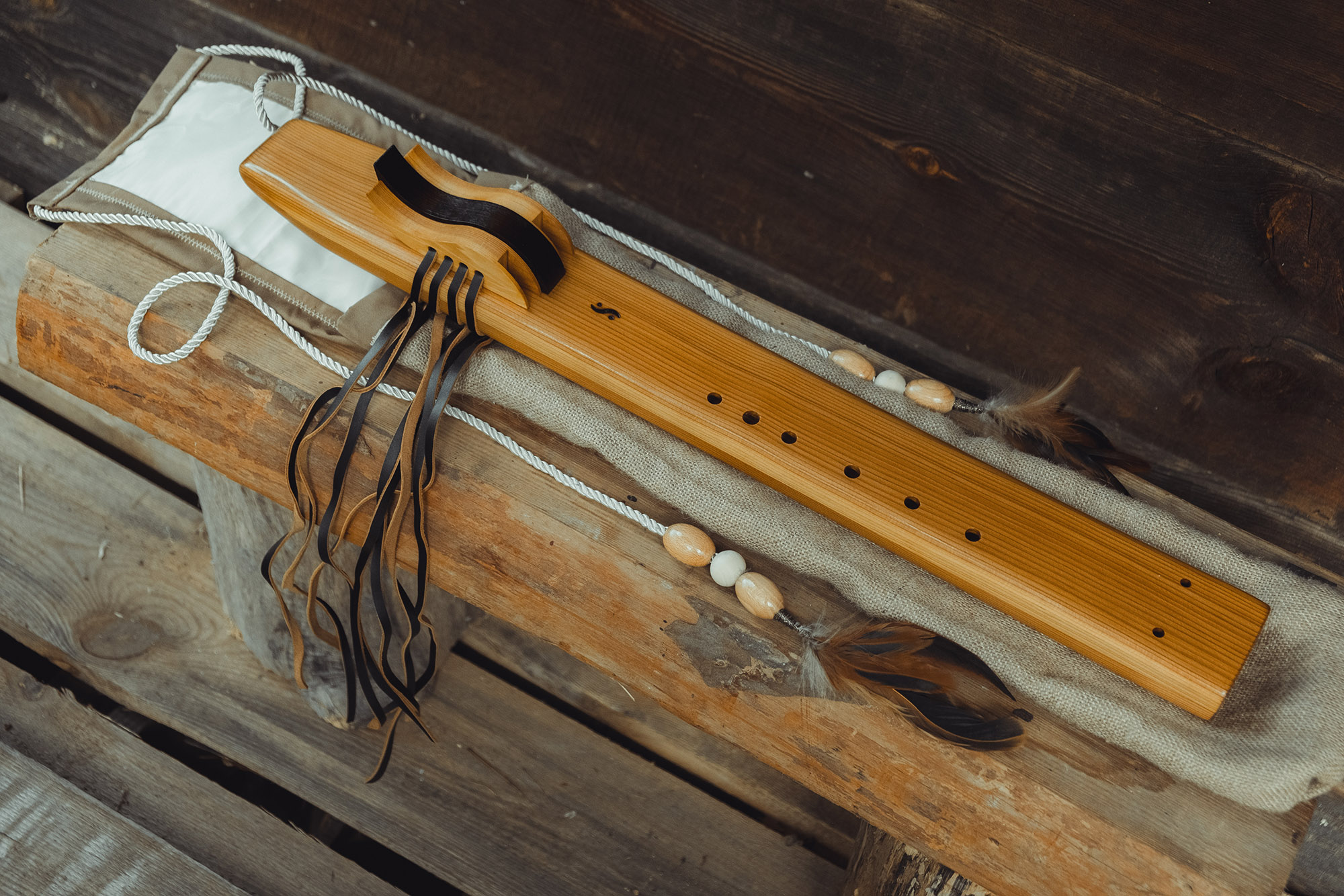 Ręcznie wykonany flet z drewna cedru (Western Red Cedar, Thuja plicata), pozyskanego z Ameryki Północnej. Flet prosty podwójny, 6-otworowy, w stylu rdzennych Amerykanów (Native American Style Flute), charakteryzuje się średnim, ciepłym brzmieniem. Skala pentatoniczna i heksatonika molowa umożliwiają szeroką ekspresję muzyczną. Flet jest zabarwiony na rustykalny palisander i wykończony olejowaniem typu French polishing (Tru-Oil – 6 warstw). Dokumentacja zawiera informacje o konserwacji, przechowywaniu oraz certyfikat autentyczności.
