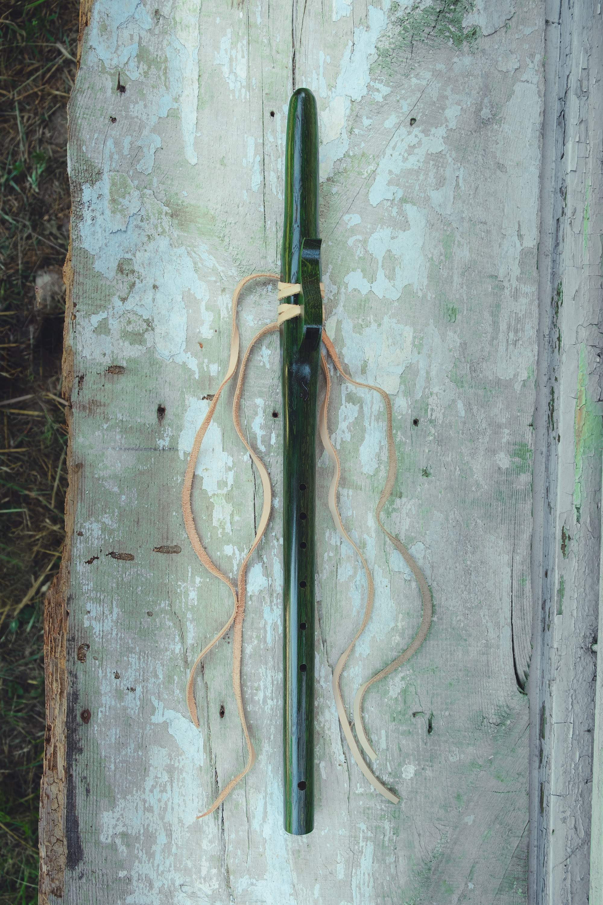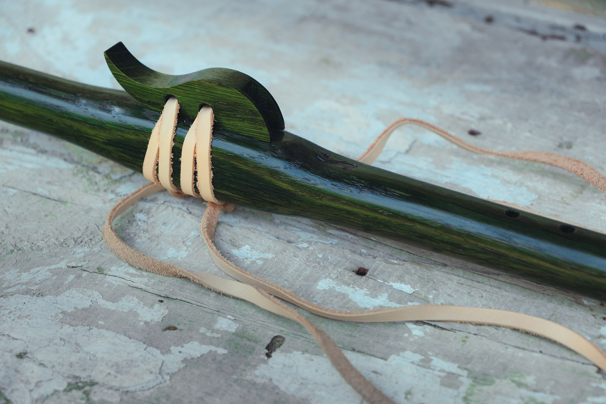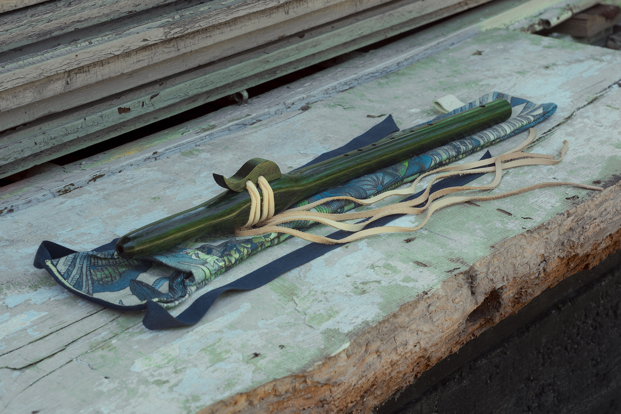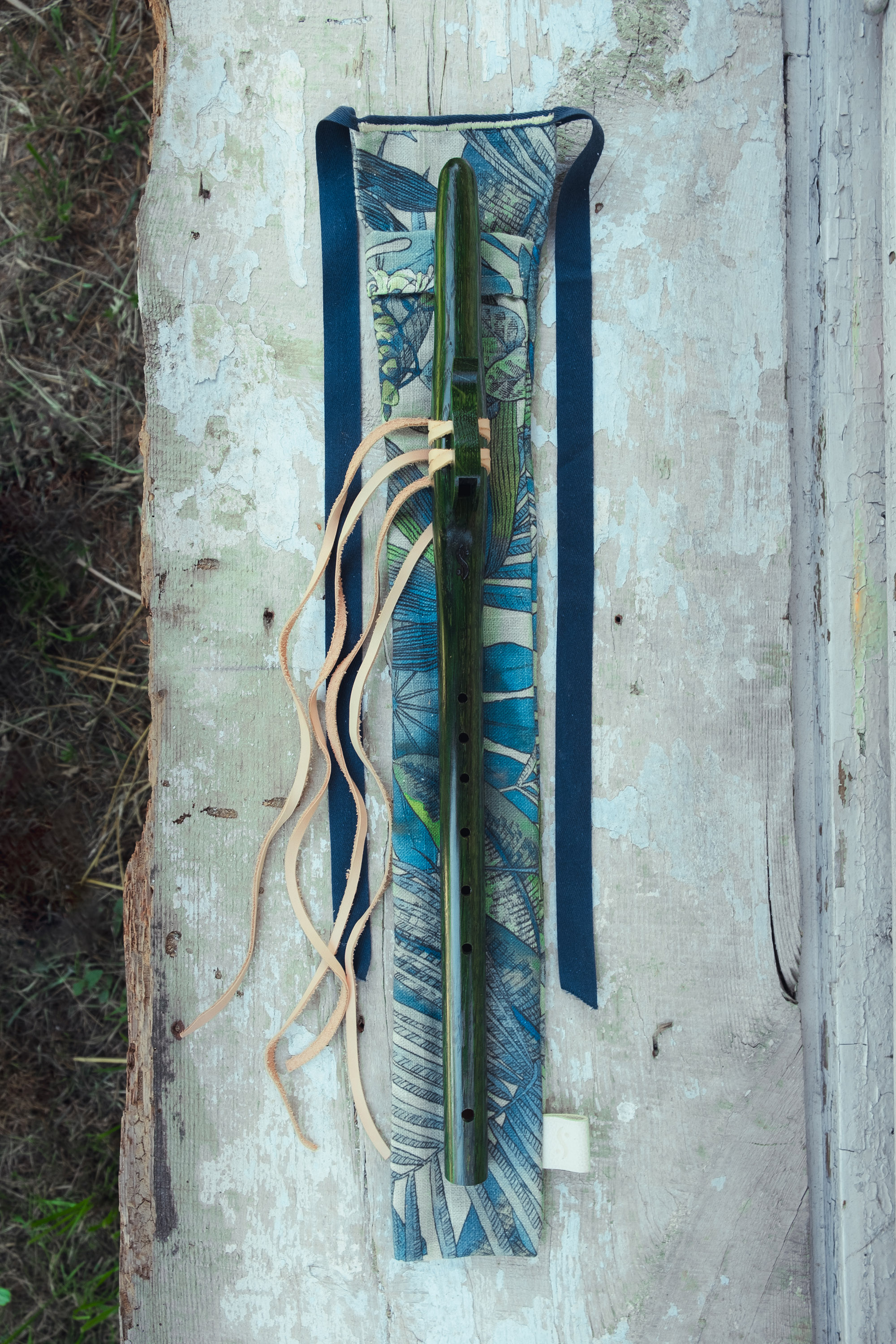 Ręcznie wykonany flet z drewna dębu bezszypułkowego (Quercus petraea), pochodzącego z recyklingu. Flet prosty, 6-otworowy, w stylu rdzennych Amerykanów (Native American Style Flute), charakteryzuje się mocnym, głębokim brzmieniem. Skala pentatoniczna i heksatonika molowa pozwalają na szeroką ekspresję muzyczną. Flet jest zabarwiony na rustykalny zielony kolor i wykończony olejowaniem typu French polishing (Tru-Oil – 6 warstw), co nadaje mu wyjątkowy wygląd i trwałość. Dokumentacja zawiera szczegółowe informacje techniczne, konserwację, warunki przechowywania oraz certyfikat autentyczności.