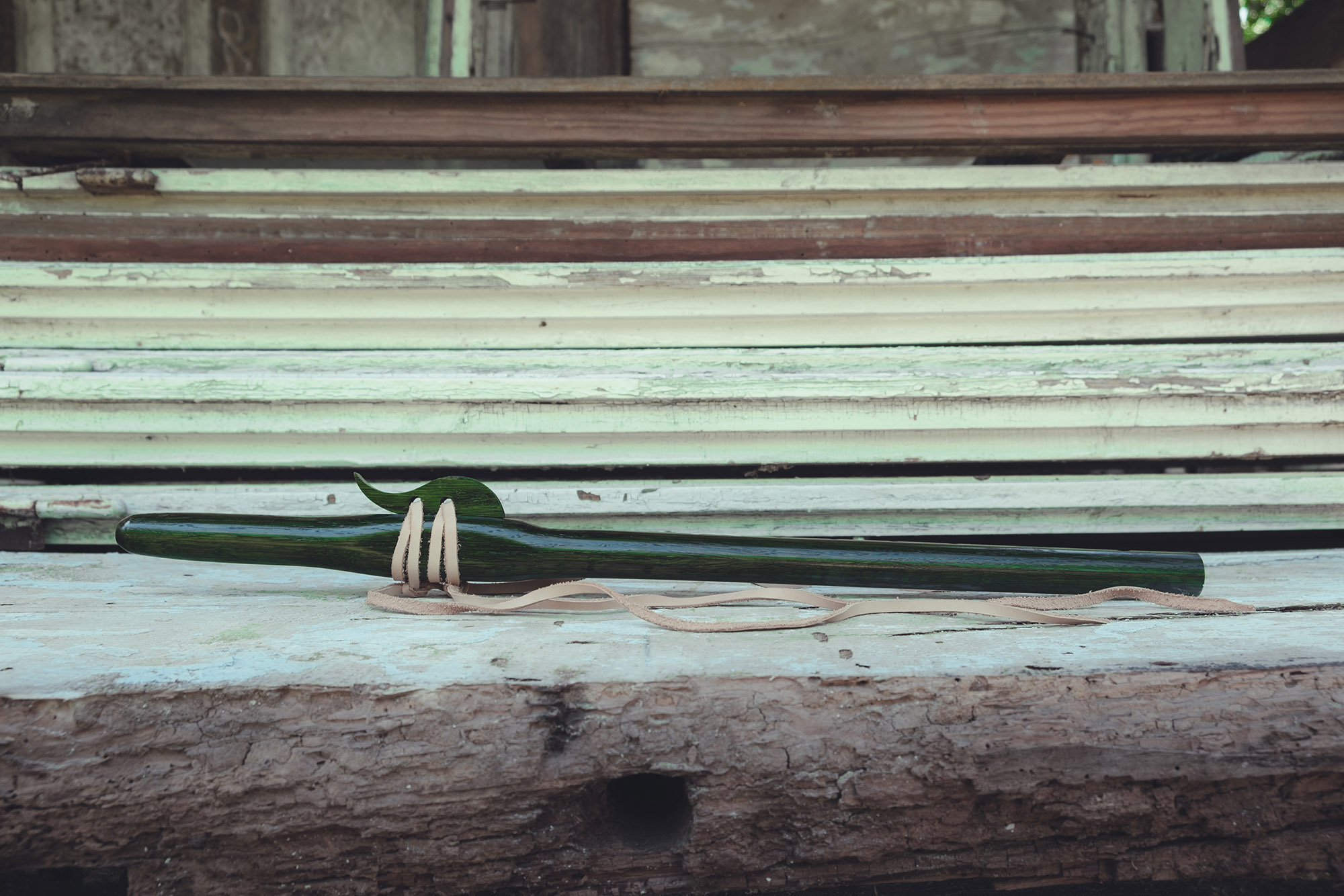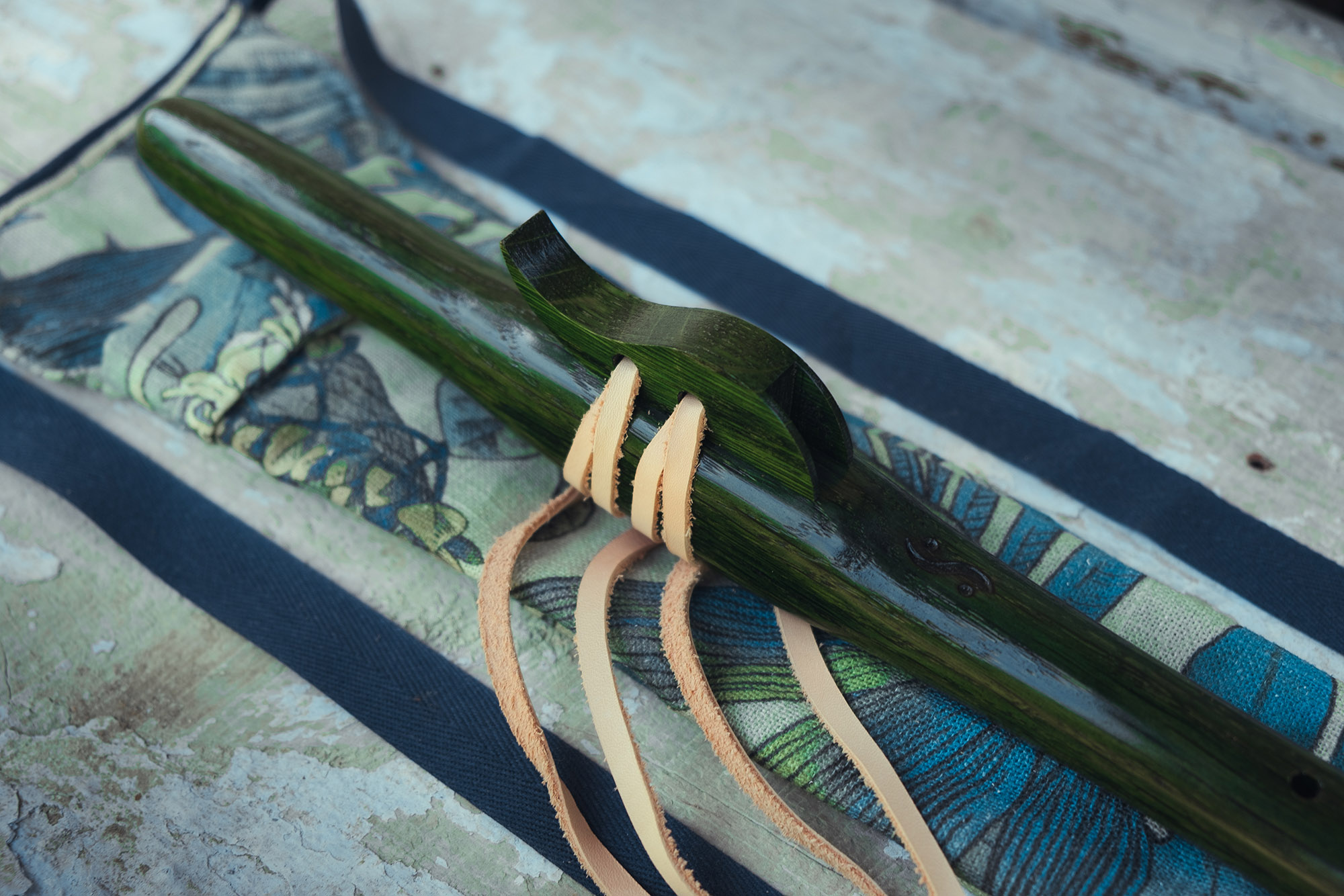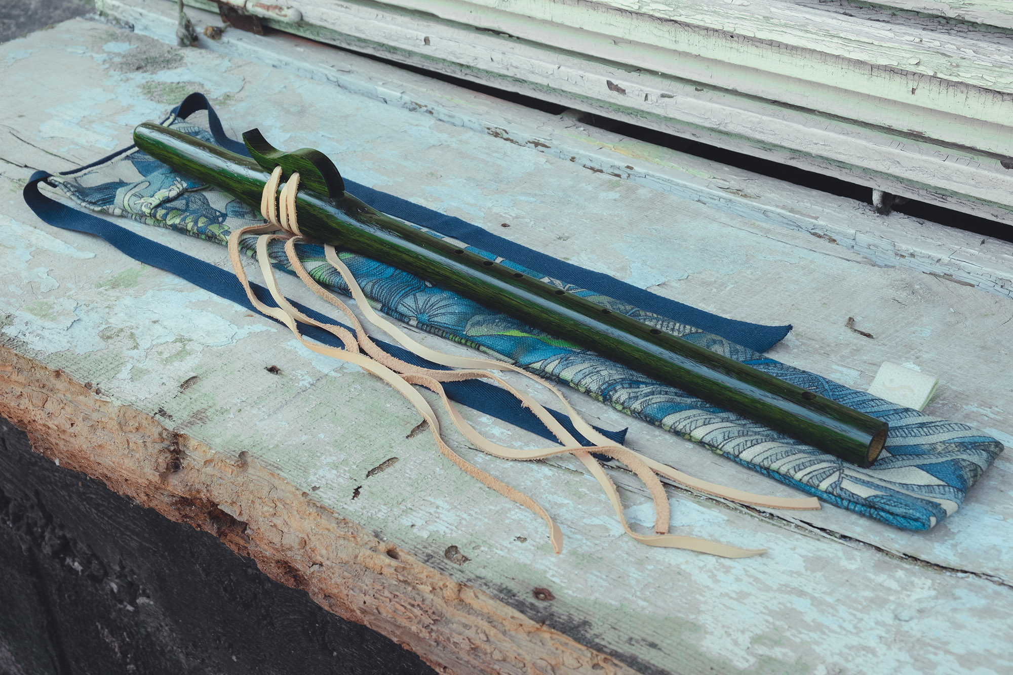 Ręcznie wykonany flet z drewna dębu bezszypułkowego (Quercus petraea), pochodzącego z recyklingu. Flet prosty, 6-otworowy, w stylu rdzennych Amerykanów (Native American Style Flute), charakteryzuje się mocnym, głębokim brzmieniem. Skala pentatoniczna i heksatonika molowa pozwalają na szeroką ekspresję muzyczną. Flet jest zabarwiony na rustykalny zielony kolor i wykończony olejowaniem typu French polishing (Tru-Oil – 6 warstw), co nadaje mu wyjątkowy wygląd i trwałość. Dokumentacja zawiera szczegółowe informacje techniczne, konserwację, warunki przechowywania oraz certyfikat autentyczności.