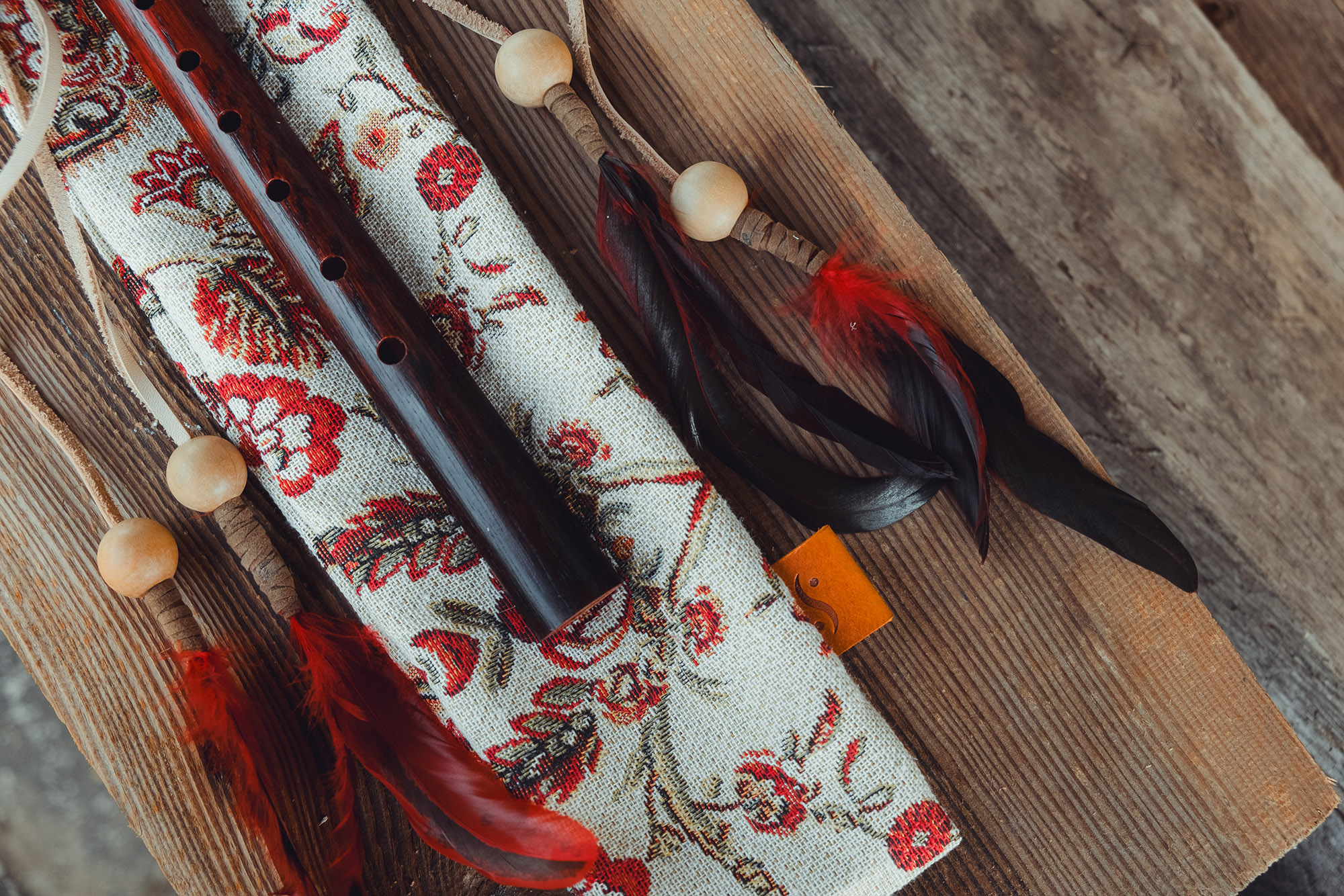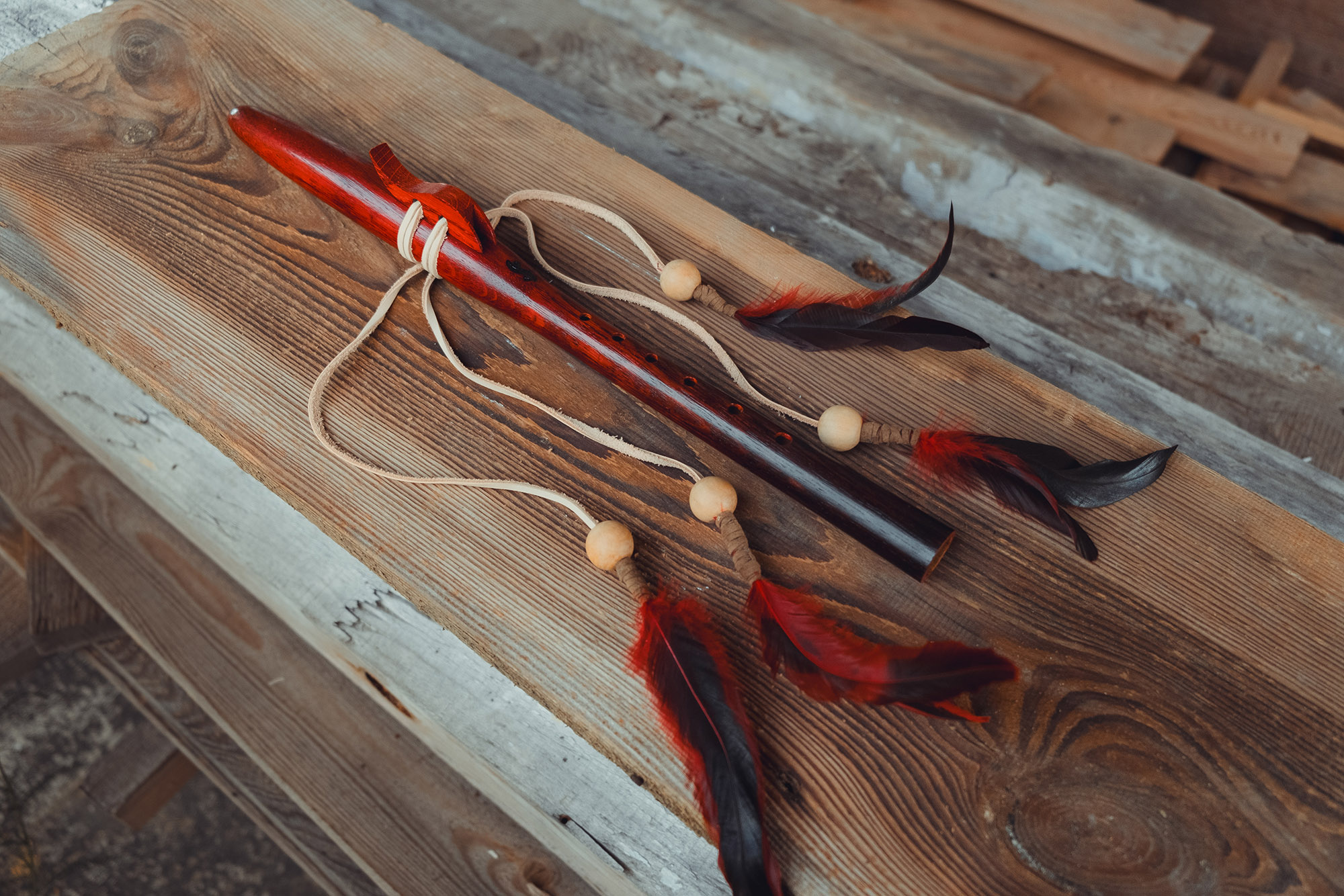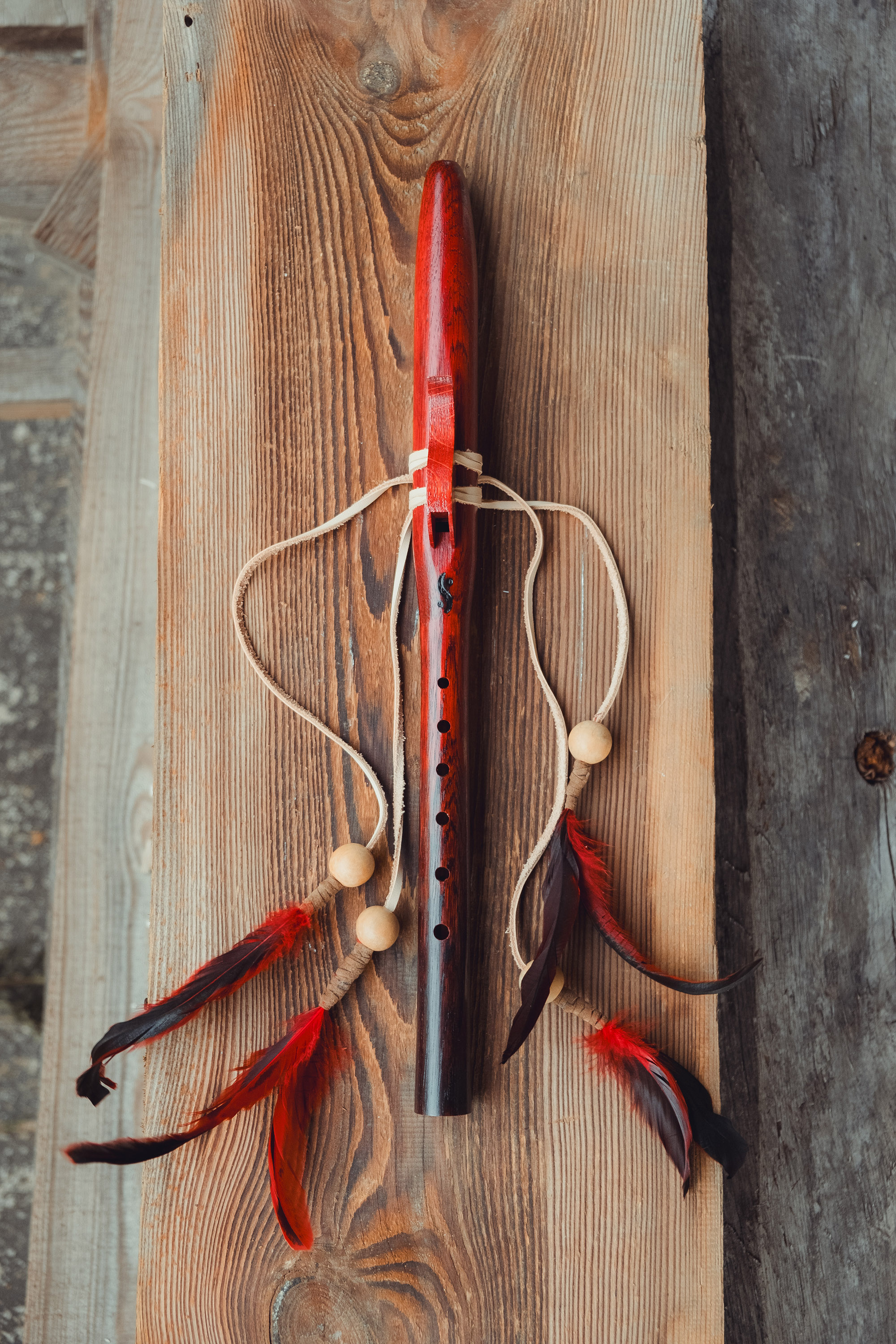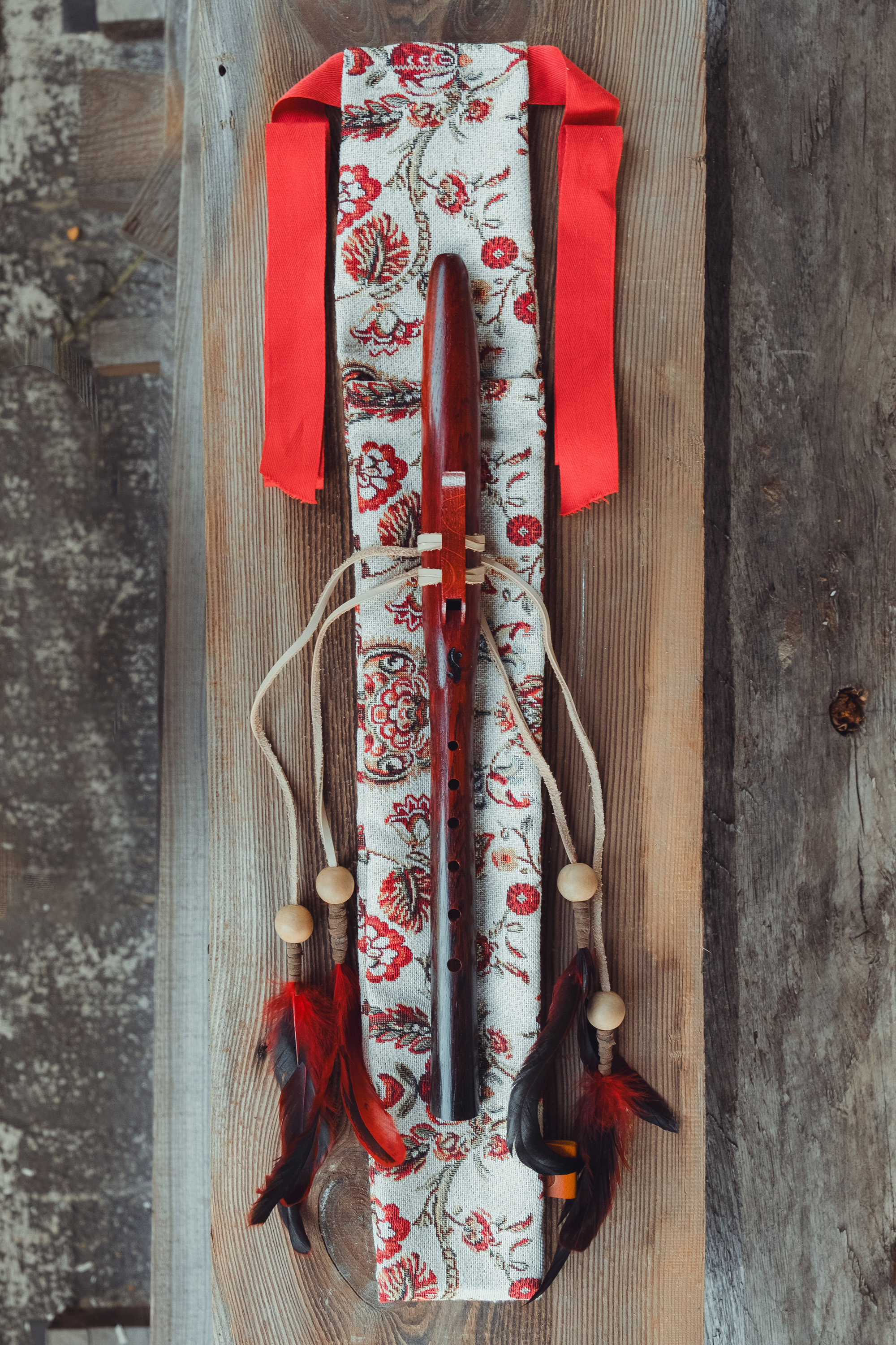 Ręcznie wykonany flet z drewna dębu bezszypułkowego (Quercus petraea), pozyskanego z recyklingu, o ciepłym i donośnym brzmieniu. Flet prosty, 6-otworowy, inspirowany tradycją rdzennych Amerykanów (Native American Style Flute). Skala pentatoniczna i heksatonika molowa umożliwiają szeroką ekspresję muzyczną. Flet jest zabarwiony na rustykalny czerwony kolor z czarnymi akcentami, ubytki wypełniono ekologiczną żywicą epoksydową z barwnikiem perłowym. Wykończenie typu French polishing (Tru-Oil – 6 warstw) zapewnia estetykę i trwałość. Dokumentacja zawiera informacje o konserwacji, przechowywaniu i certyfikat autentyczności.