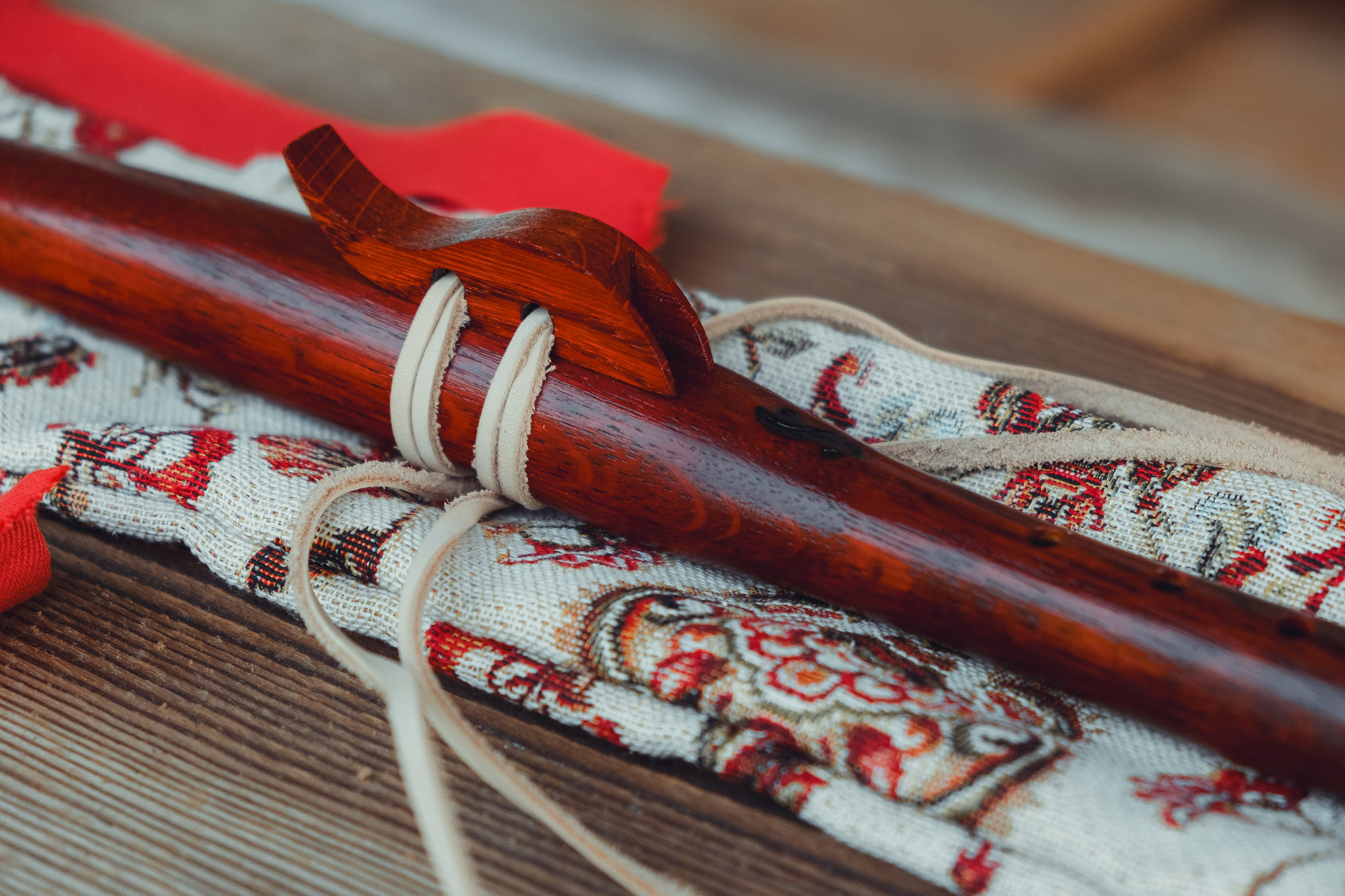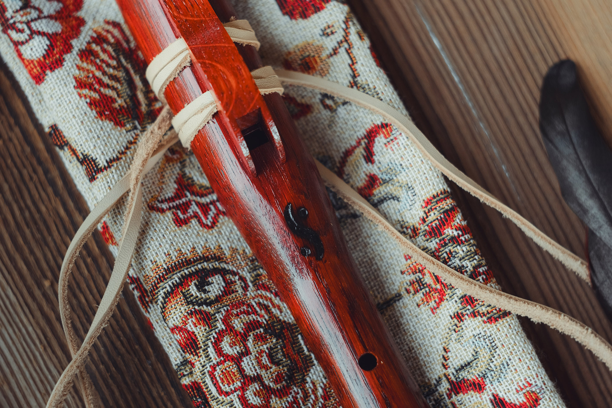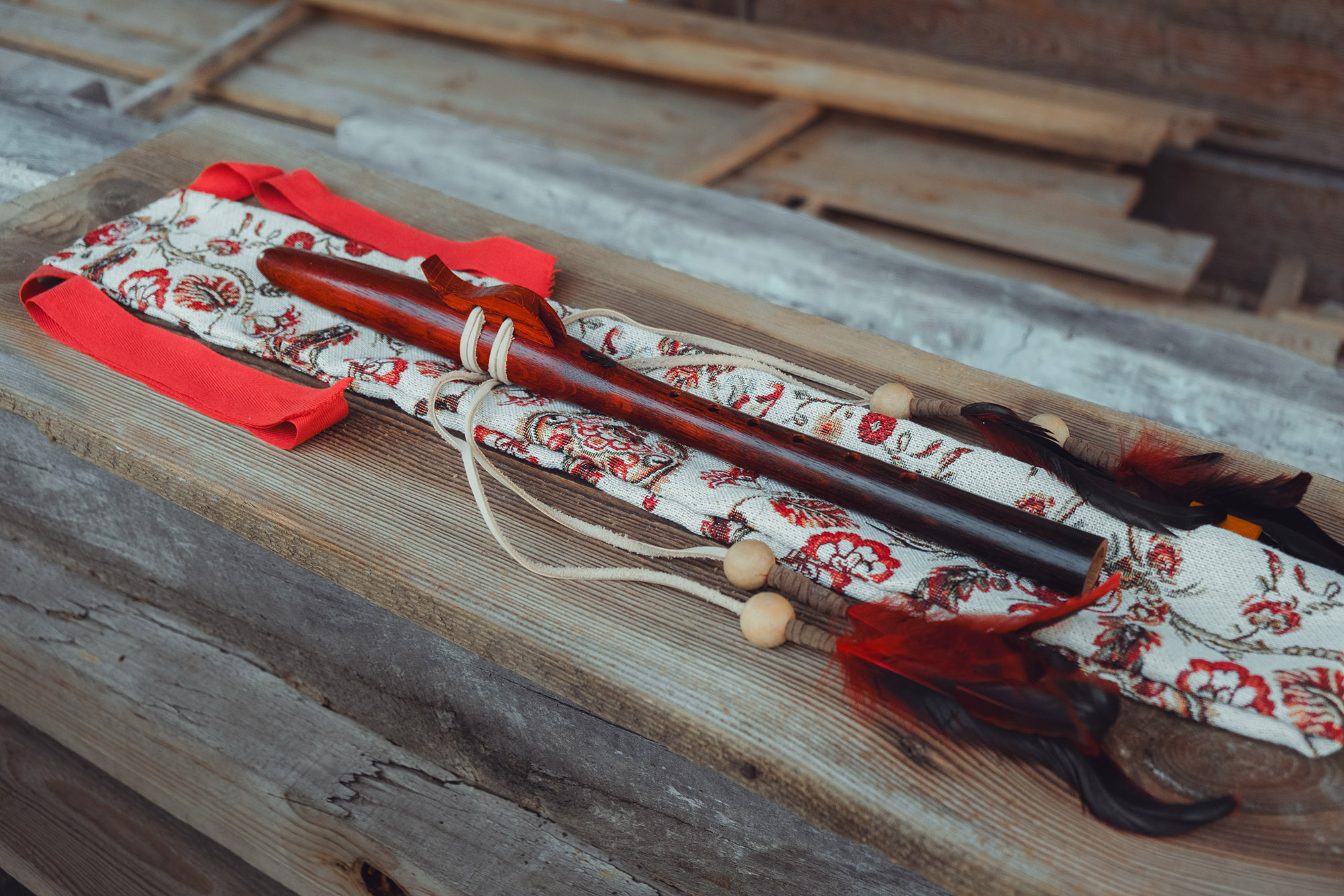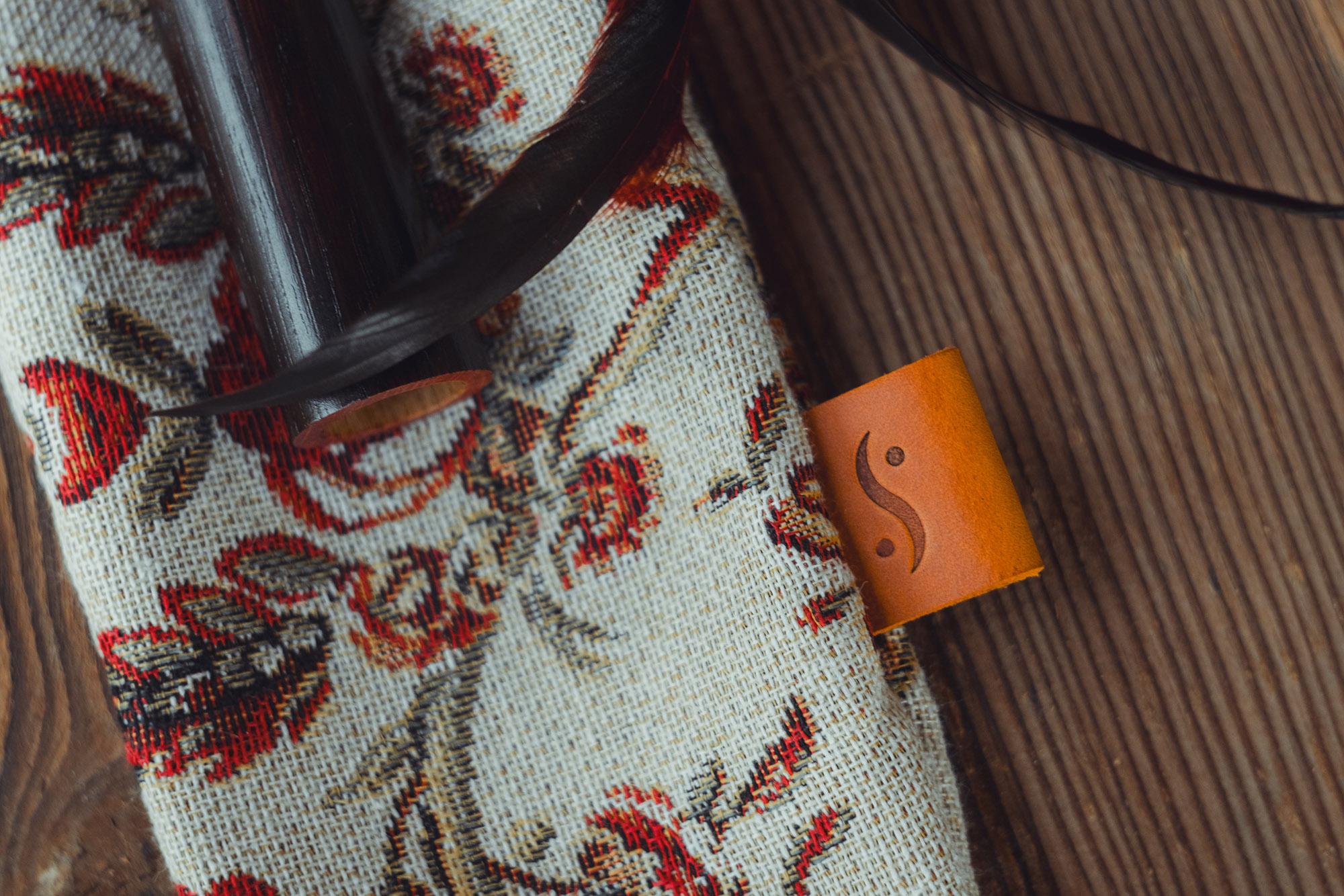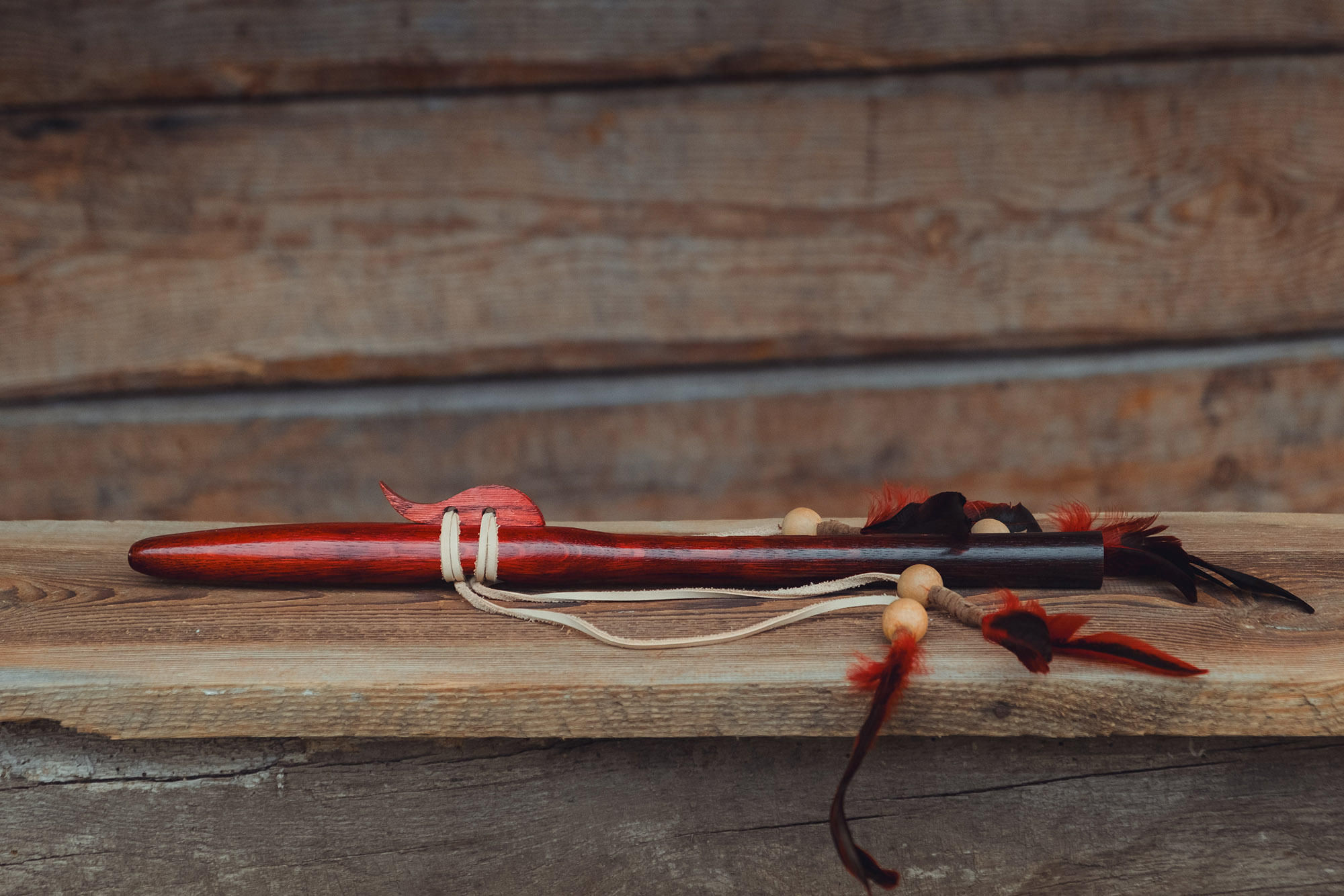 Ręcznie wykonany flet z drewna dębu bezszypułkowego (Quercus petraea), pozyskanego z recyklingu, o ciepłym i donośnym brzmieniu. Flet prosty, 6-otworowy, inspirowany tradycją rdzennych Amerykanów (Native American Style Flute). Skala pentatoniczna i heksatonika molowa umożliwiają szeroką ekspresję muzyczną. Flet jest zabarwiony na rustykalny czerwony kolor z czarnymi akcentami, ubytki wypełniono ekologiczną żywicą epoksydową z barwnikiem perłowym. Wykończenie typu French polishing (Tru-Oil – 6 warstw) zapewnia estetykę i trwałość. Dokumentacja zawiera informacje o konserwacji, przechowywaniu i certyfikat autentyczności.