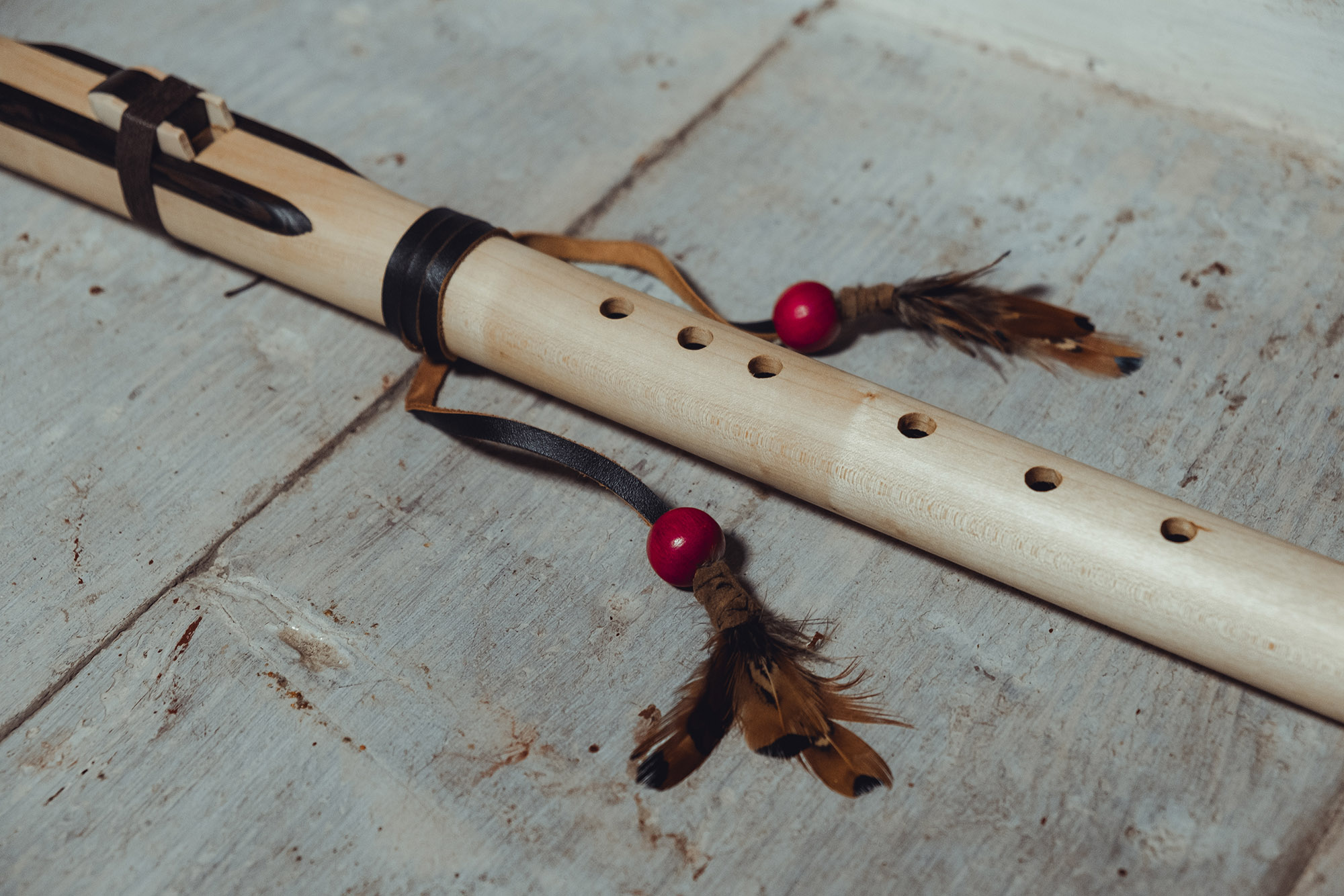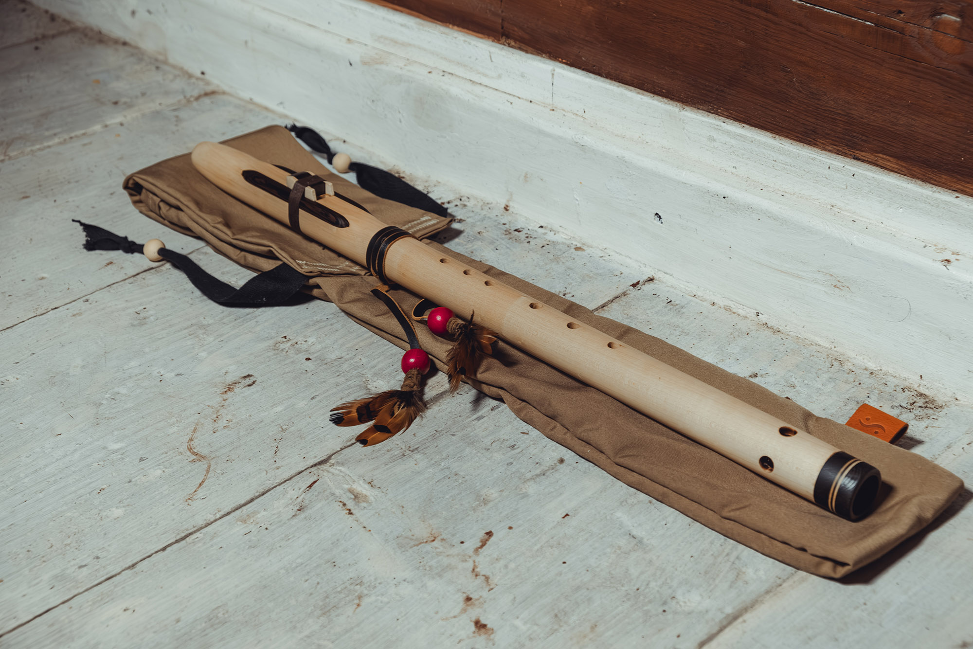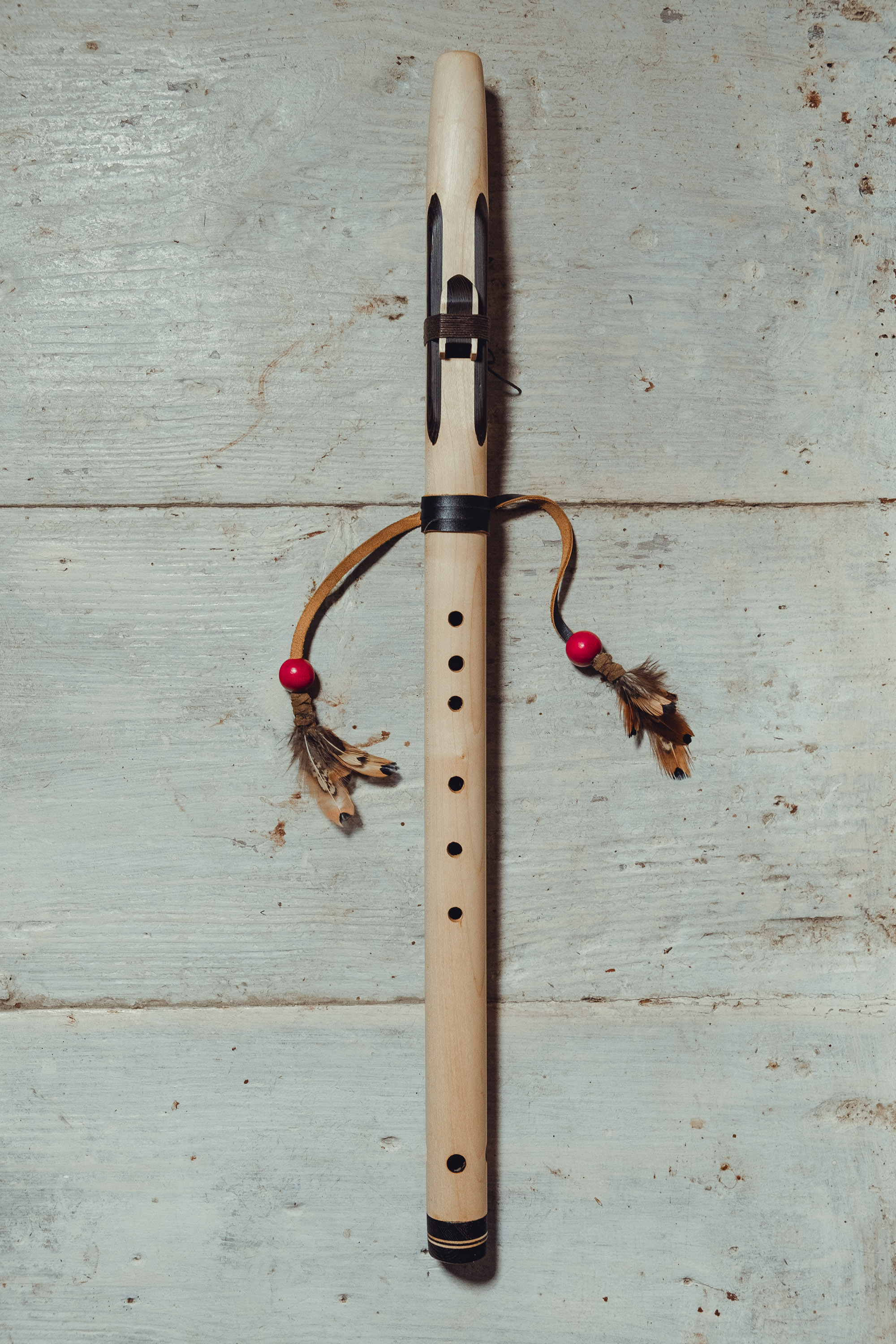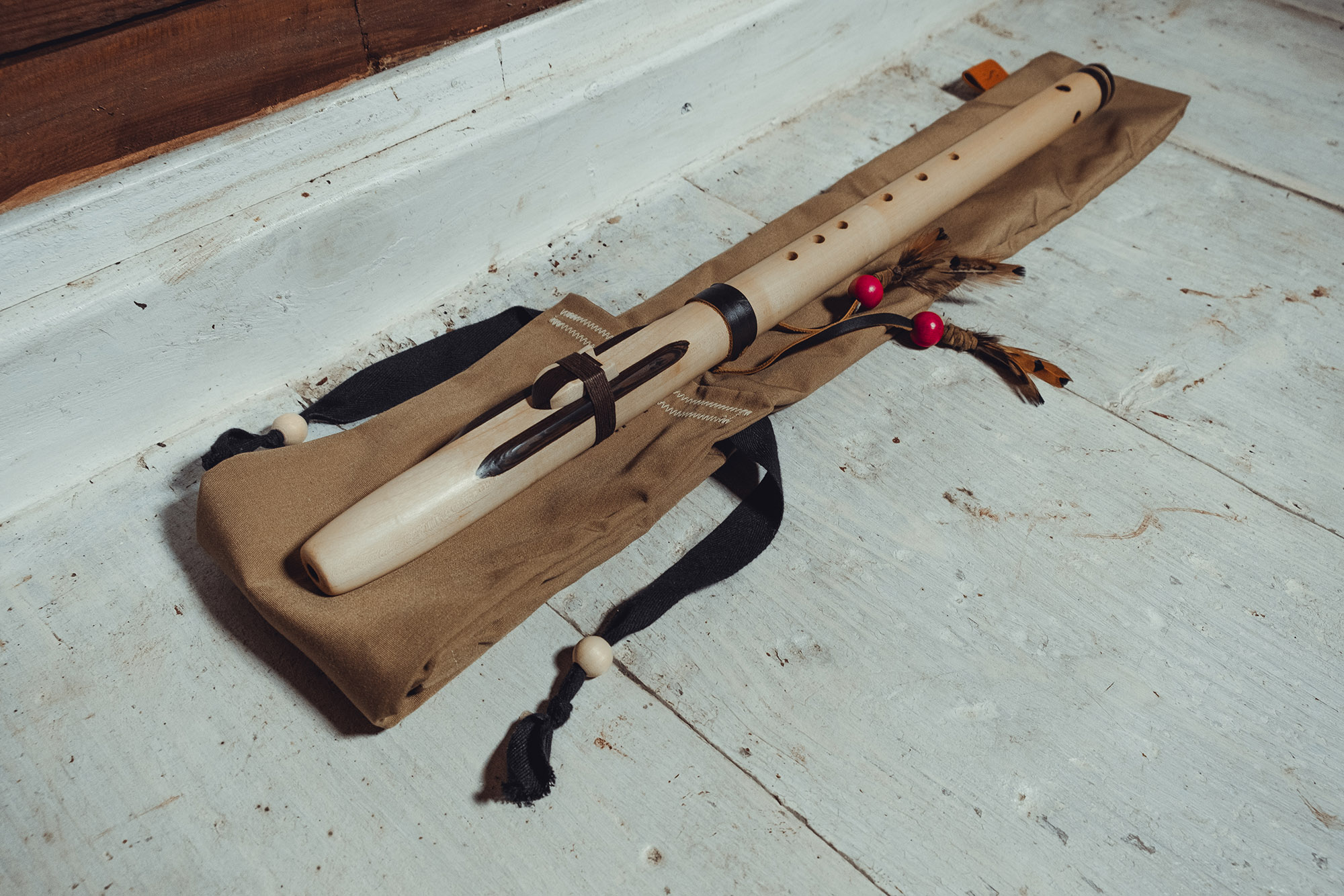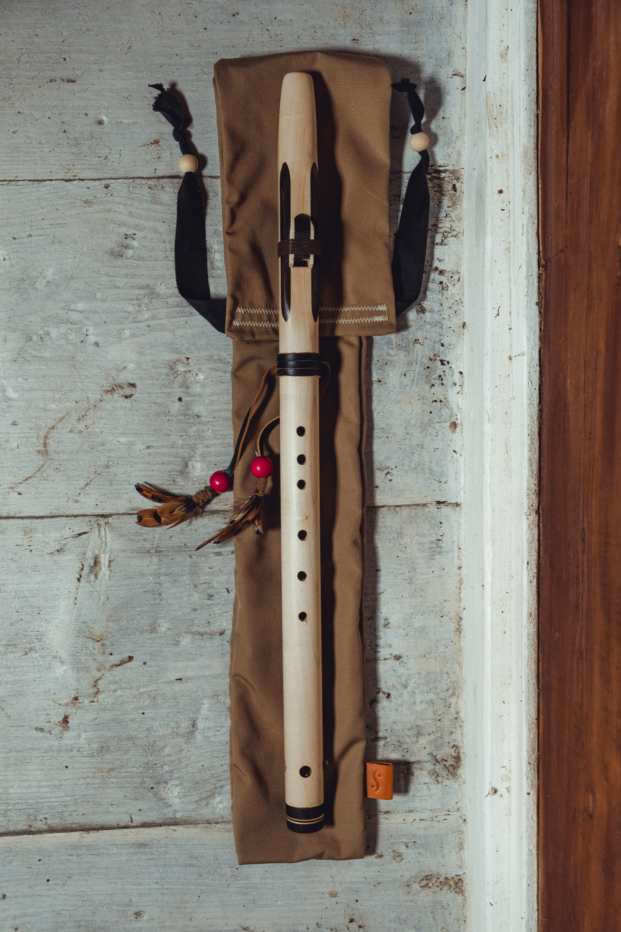 Ręcznie wykonany flet z drewna klonu (Acer pseudoplatanus), pozyskanego z terenów leśnych oraz z drewna z recyklingu, z dodatkowymi elementami wykonanymi z wenge (Millettia laurentii). Flet prosty, 6-otworowy, inspirowany tradycją rdzennych Amerykanów (Native American Style Flute), charakteryzuje się ciepłym, średnim brzmieniem. Skala pentatoniczna i heksatonika molowa zapewniają szeroką ekspresję muzyczną. Flet został zabarwiony naturalnie, a stopa komory dźwiękowej oraz totem zdobione są drewnem wenge. Wykończenie wykonano olejem tungowym, olejem lnianym i naturalnymi woskami. Dokumentacja zawiera informacje o konserwacji, przechowywaniu oraz certyfikat autentyczności.