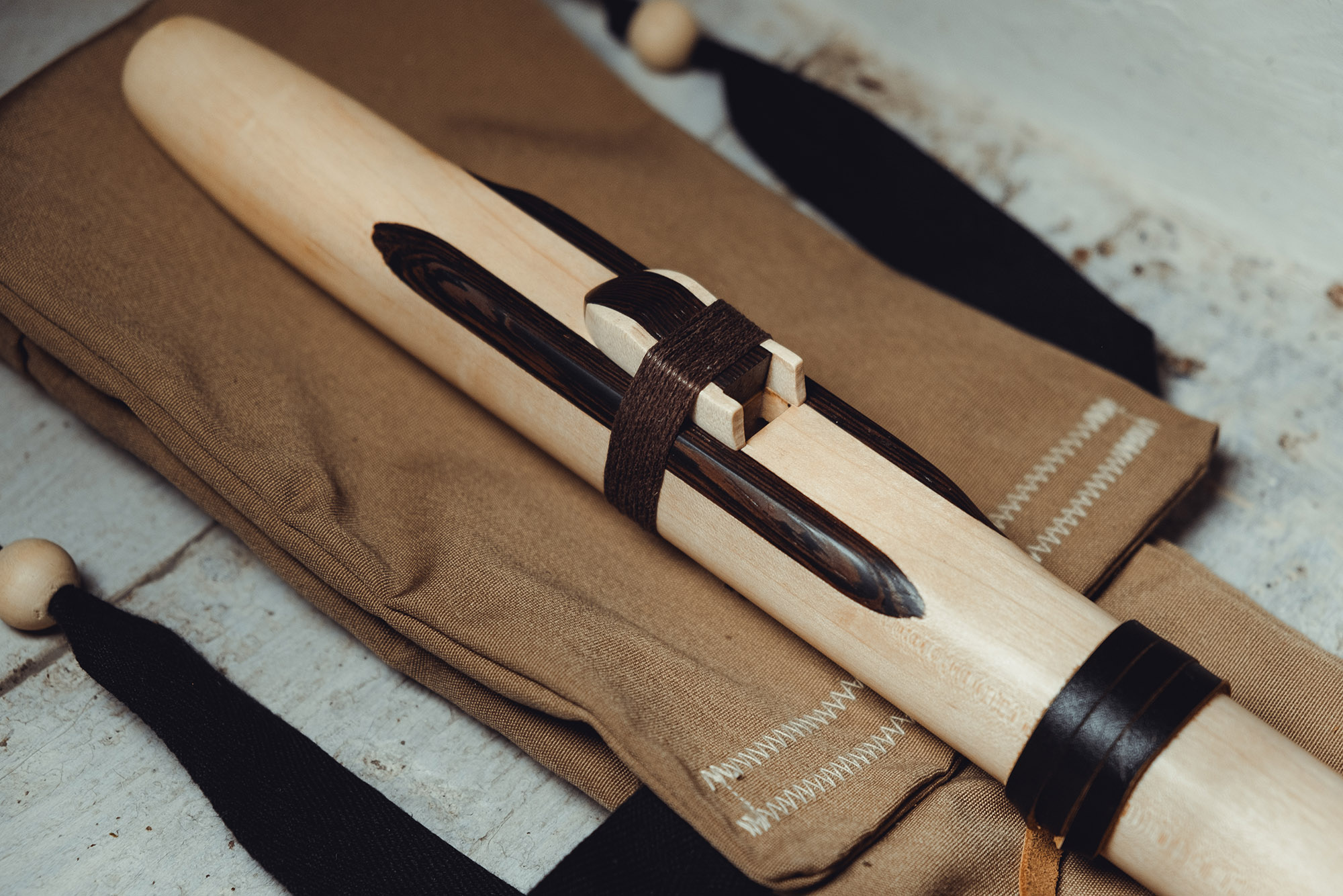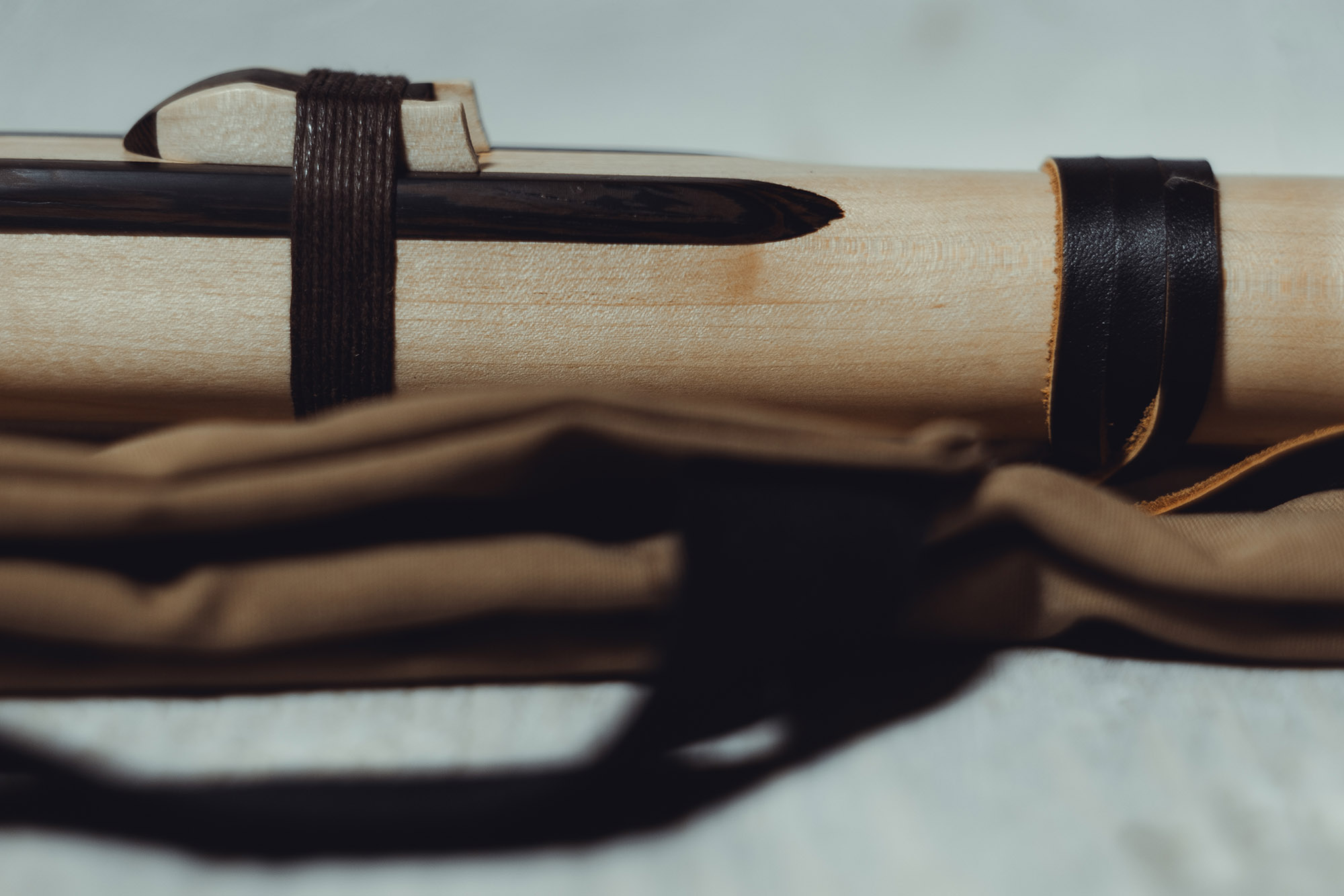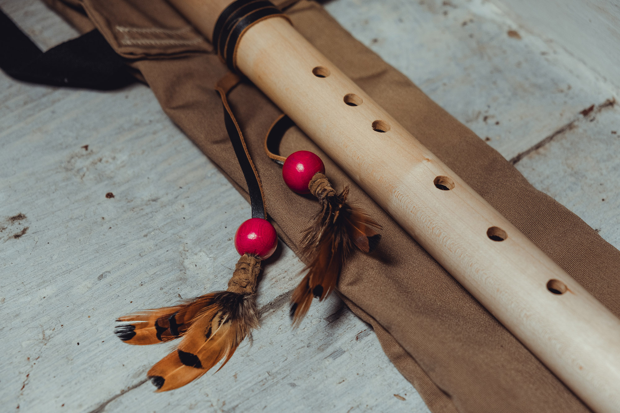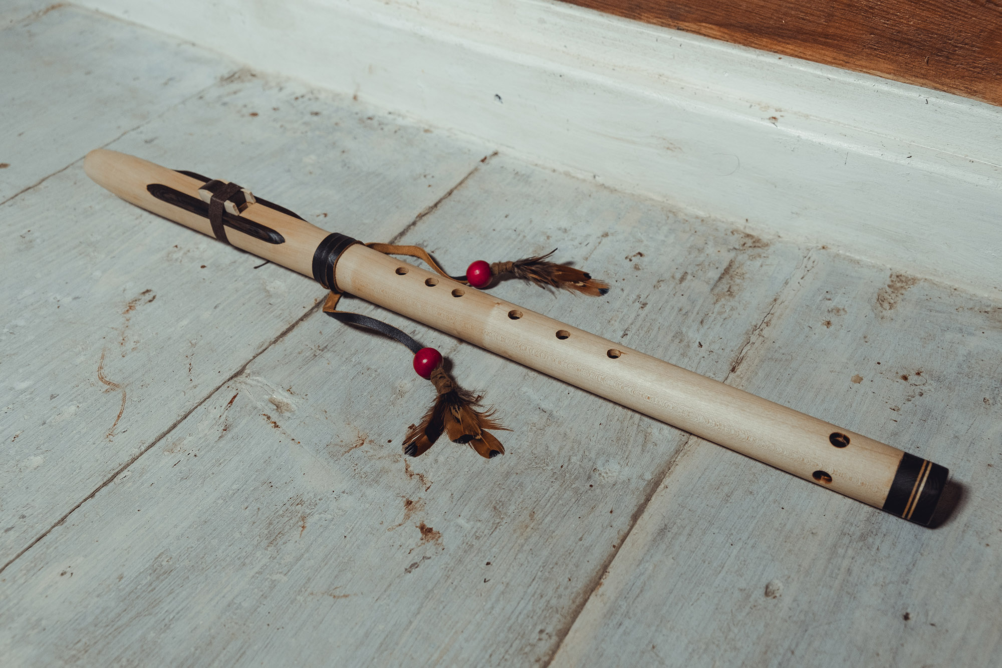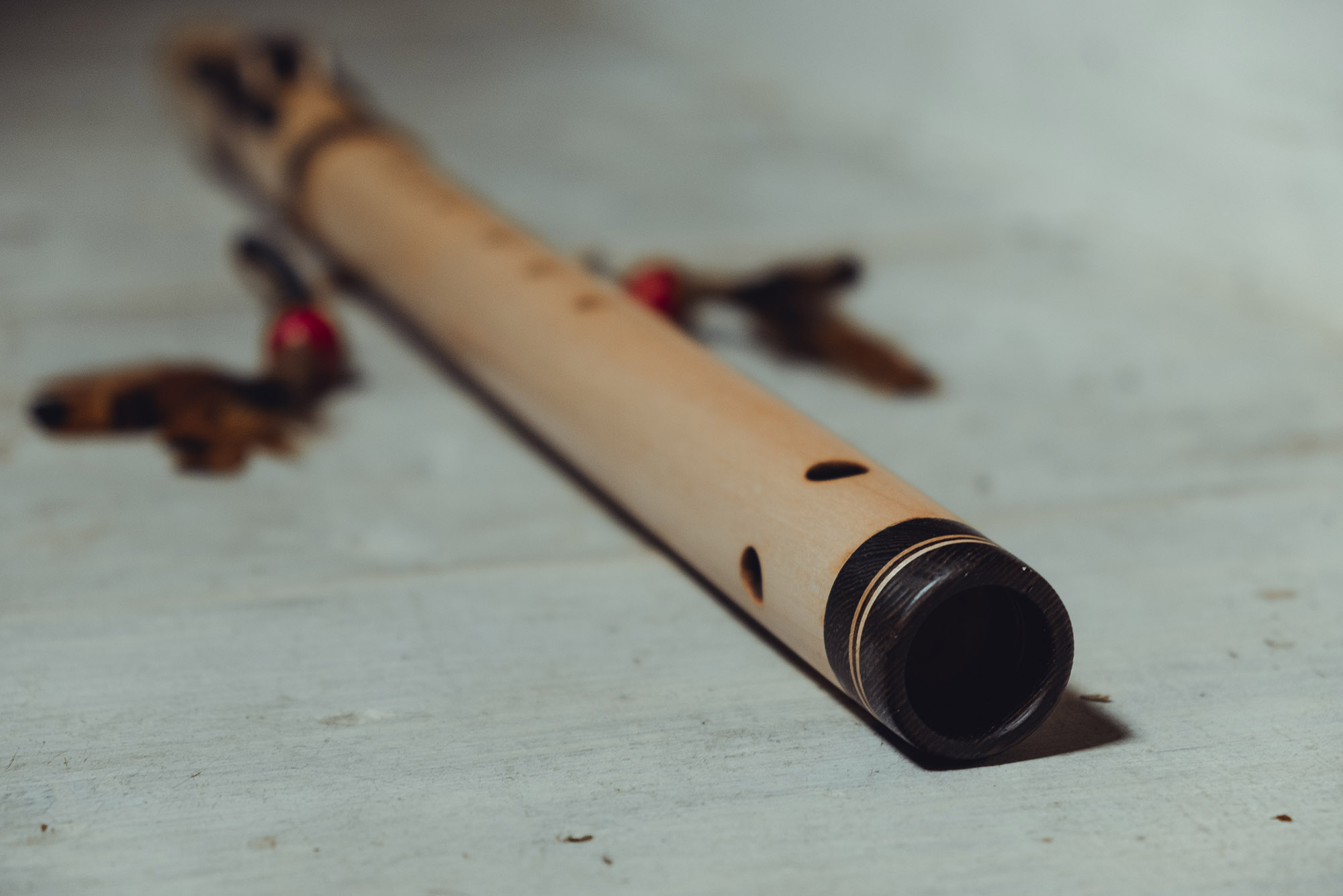 Ręcznie wykonany flet z drewna klonu (Acer pseudoplatanus), pozyskanego z terenów leśnych oraz z drewna z recyklingu, z dodatkowymi elementami wykonanymi z wenge (Millettia laurentii). Flet prosty, 6-otworowy, inspirowany tradycją rdzennych Amerykanów (Native American Style Flute), charakteryzuje się ciepłym, średnim brzmieniem. Skala pentatoniczna i heksatonika molowa zapewniają szeroką ekspresję muzyczną. Flet został zabarwiony naturalnie, a stopa komory dźwiękowej oraz totem zdobione są drewnem wenge. Wykończenie wykonano olejem tungowym, olejem lnianym i naturalnymi woskami. Dokumentacja zawiera informacje o konserwacji, przechowywaniu oraz certyfikat autentyczności.
