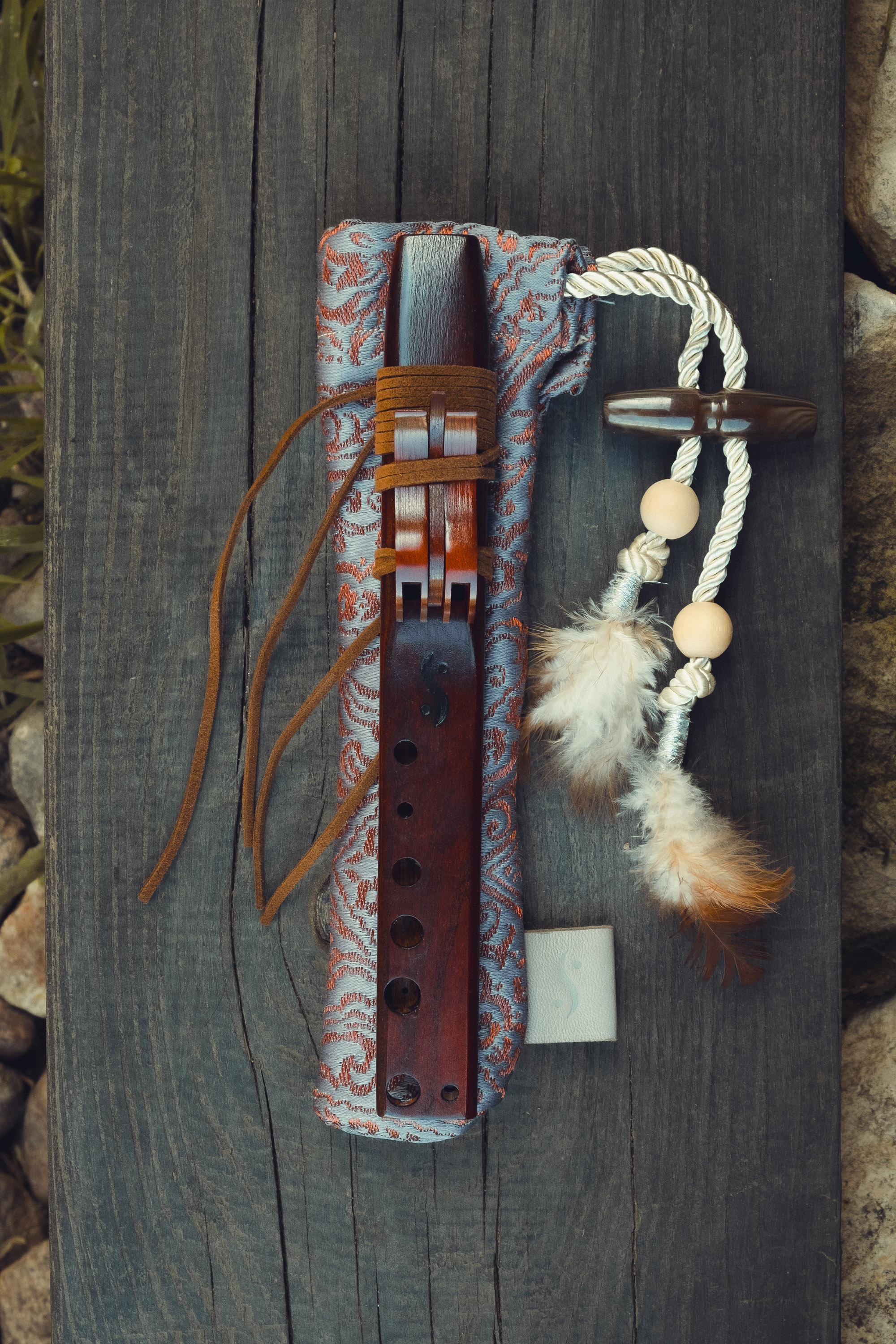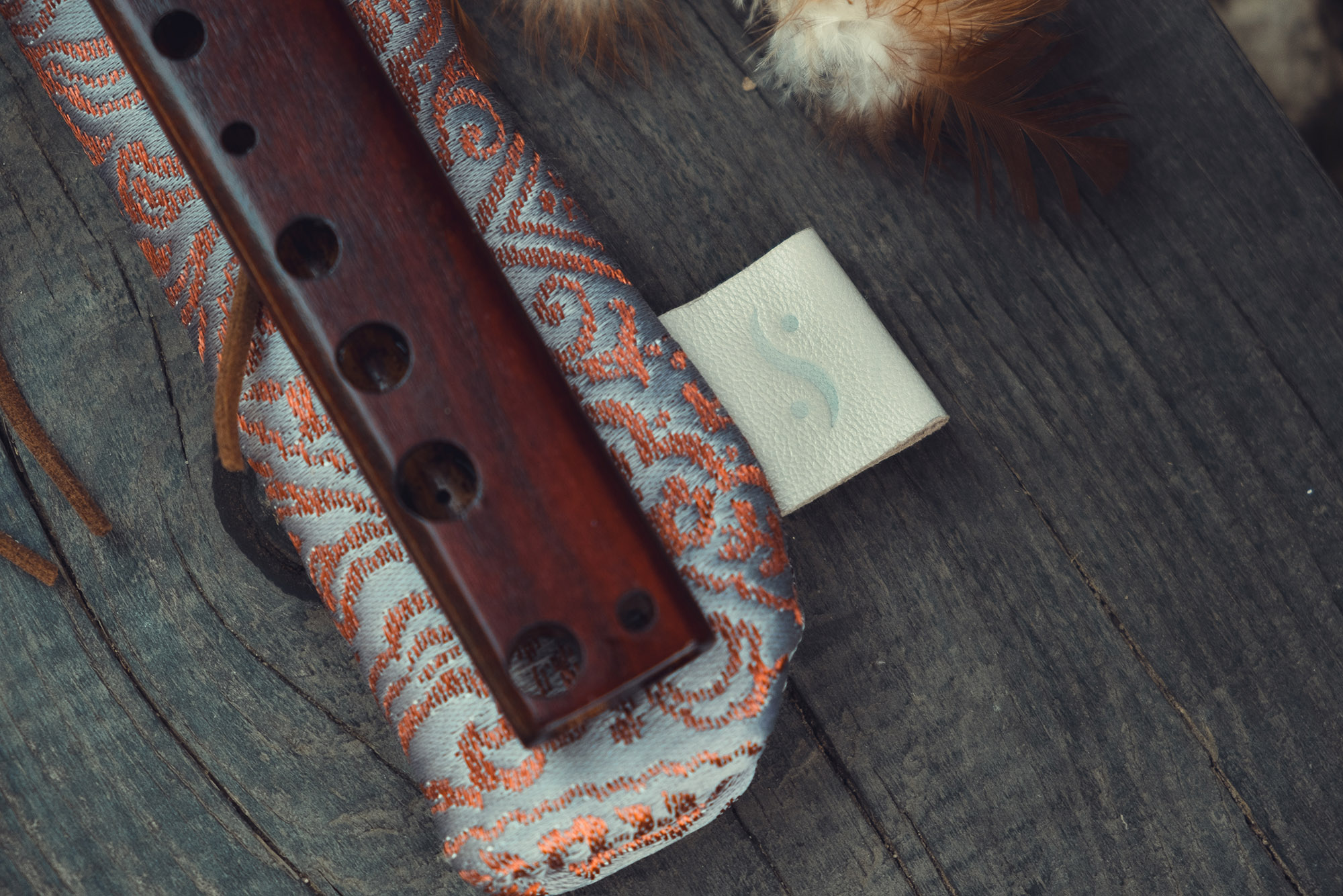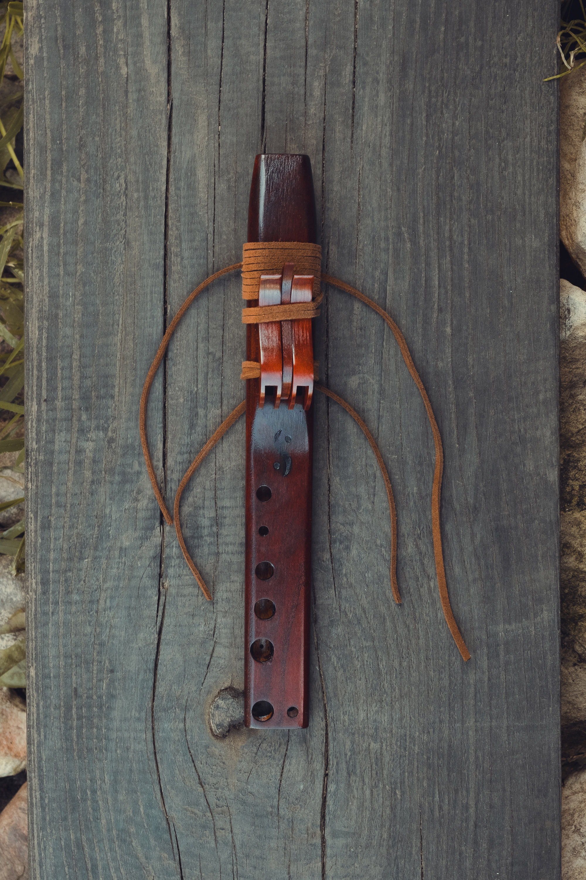 Ręcznie wykonany flet z drewna moreli (Prunus armeniaca), pozyskanego z sadu owocowego. Flet prosty podwójny, 5-otworowy, inspirowany tradycją rdzennych Amerykanów (Native American Style Flute). Charakteryzuje się jasnym, sopranowym brzmieniem. Skala pentatoniczna molowa umożliwia szeroką ekspresję muzyczną. Flet jest zabarwiony na rustykalny kolor mahoniowy i wykończony olejowaniem typu French polishing (Tru-Oil – 6 warstw), co zapewnia trwałość i estetykę. Dokumentacja obejmuje konserwację, warunki przechowywania oraz certyfikat autentyczności.