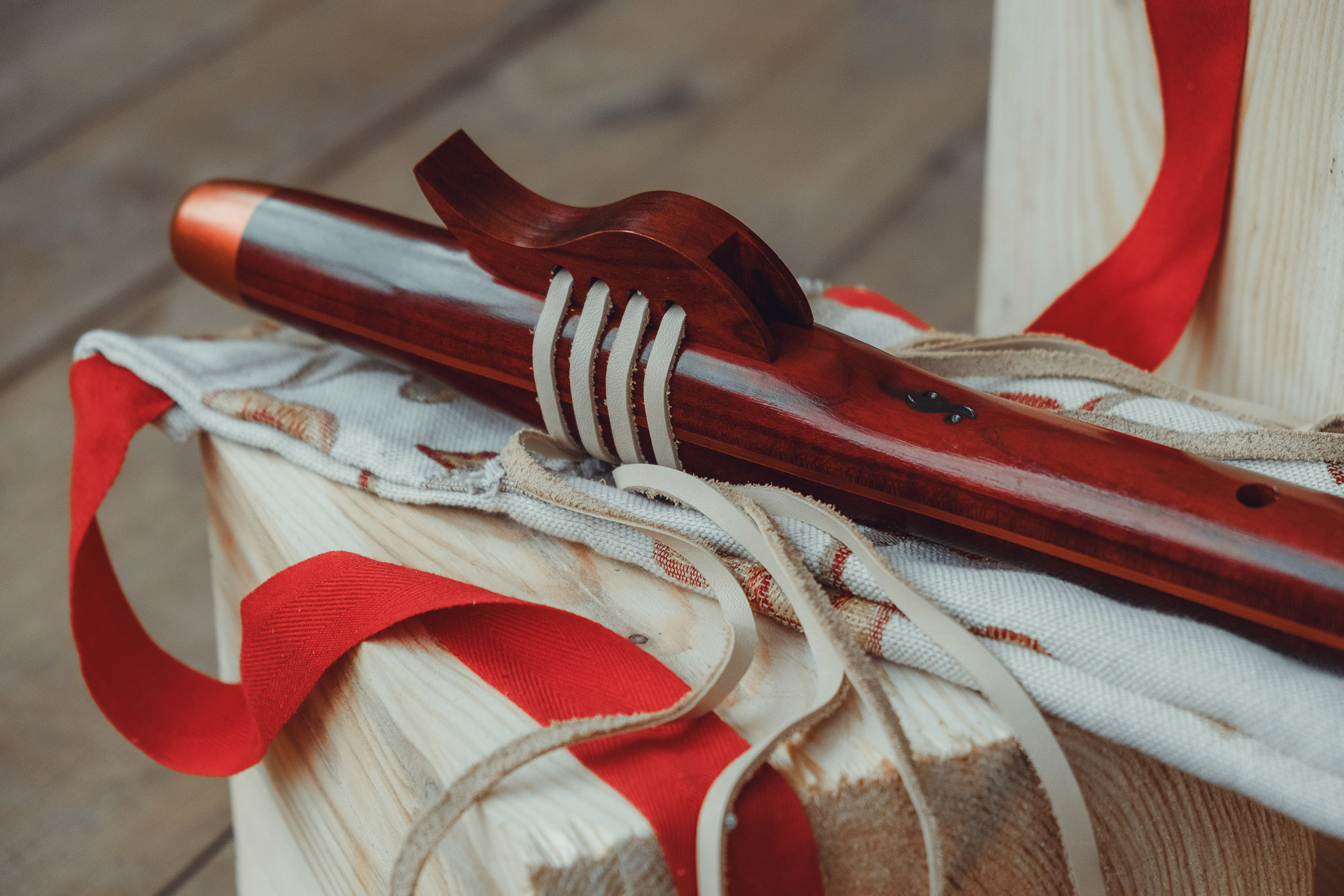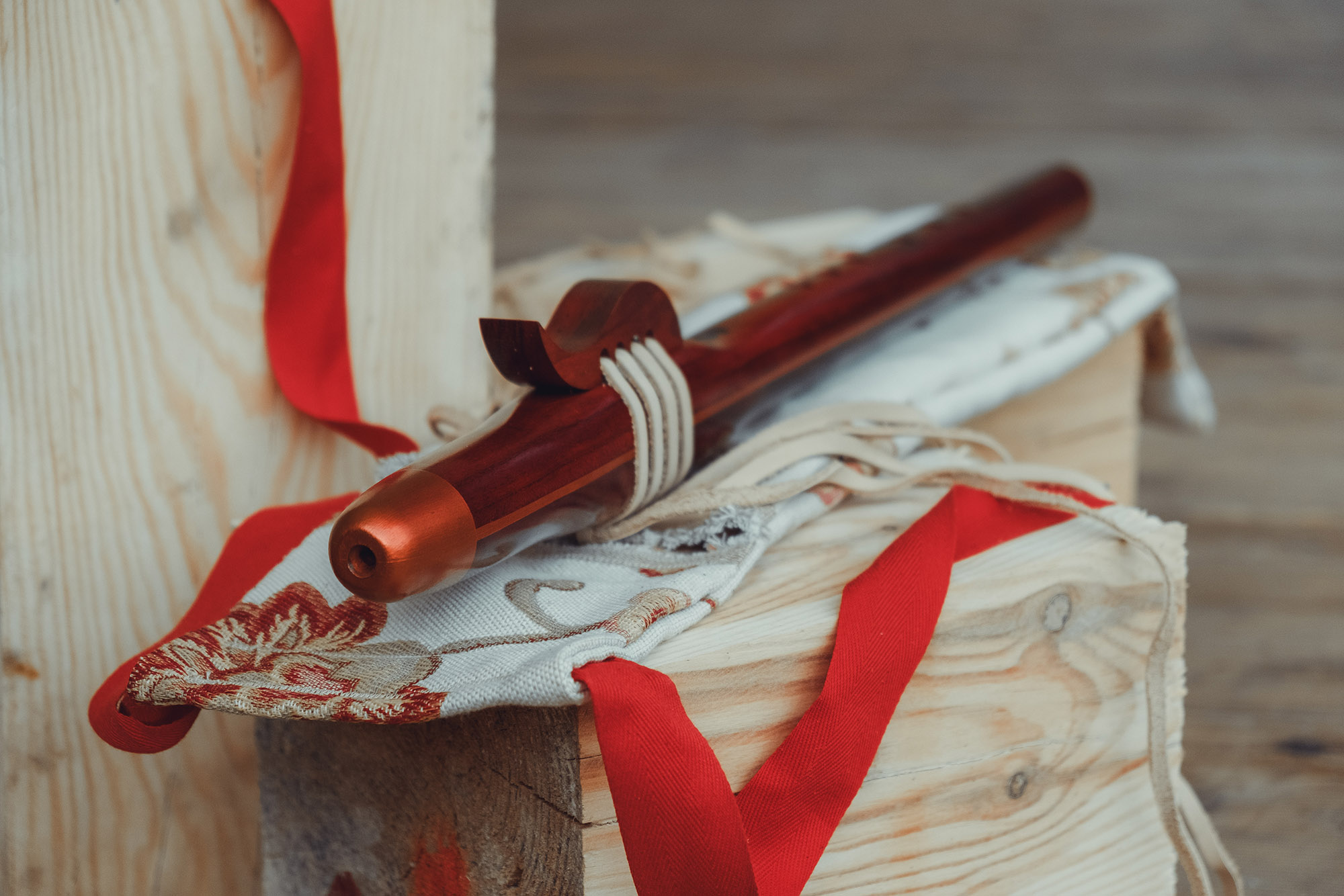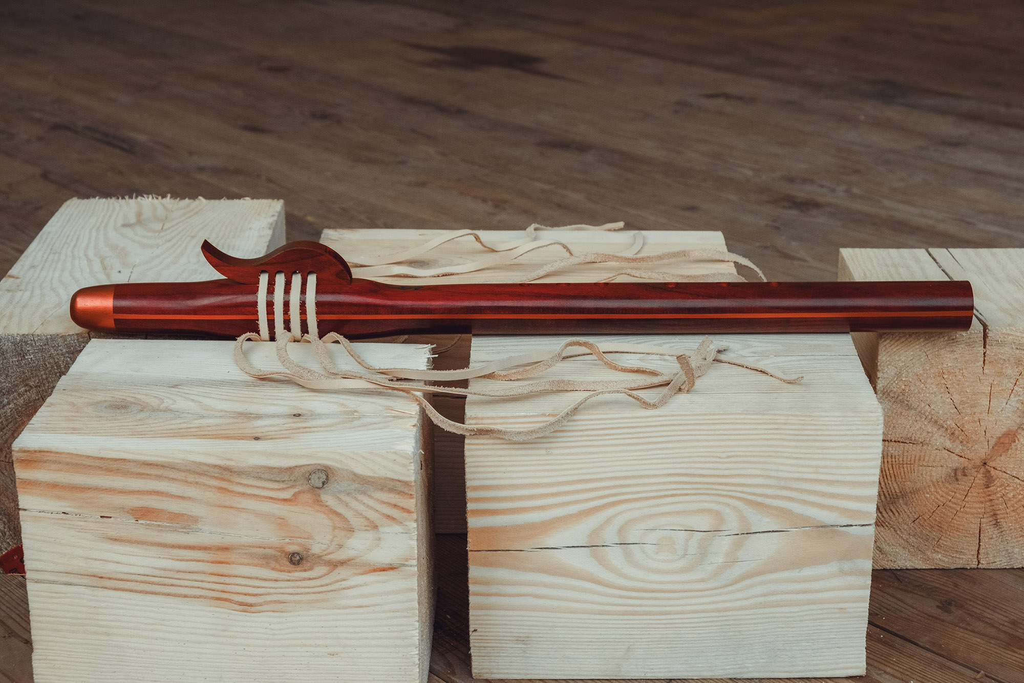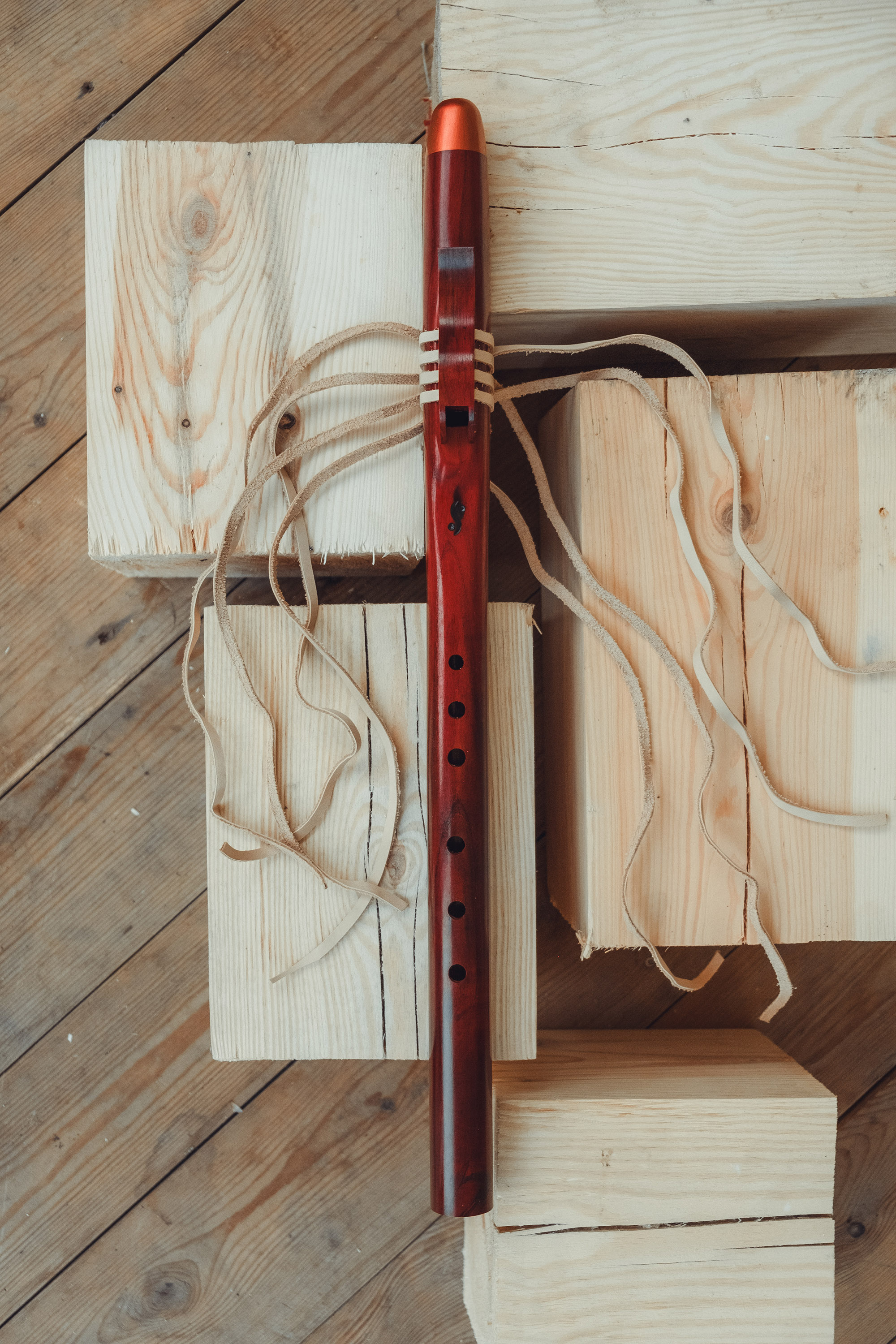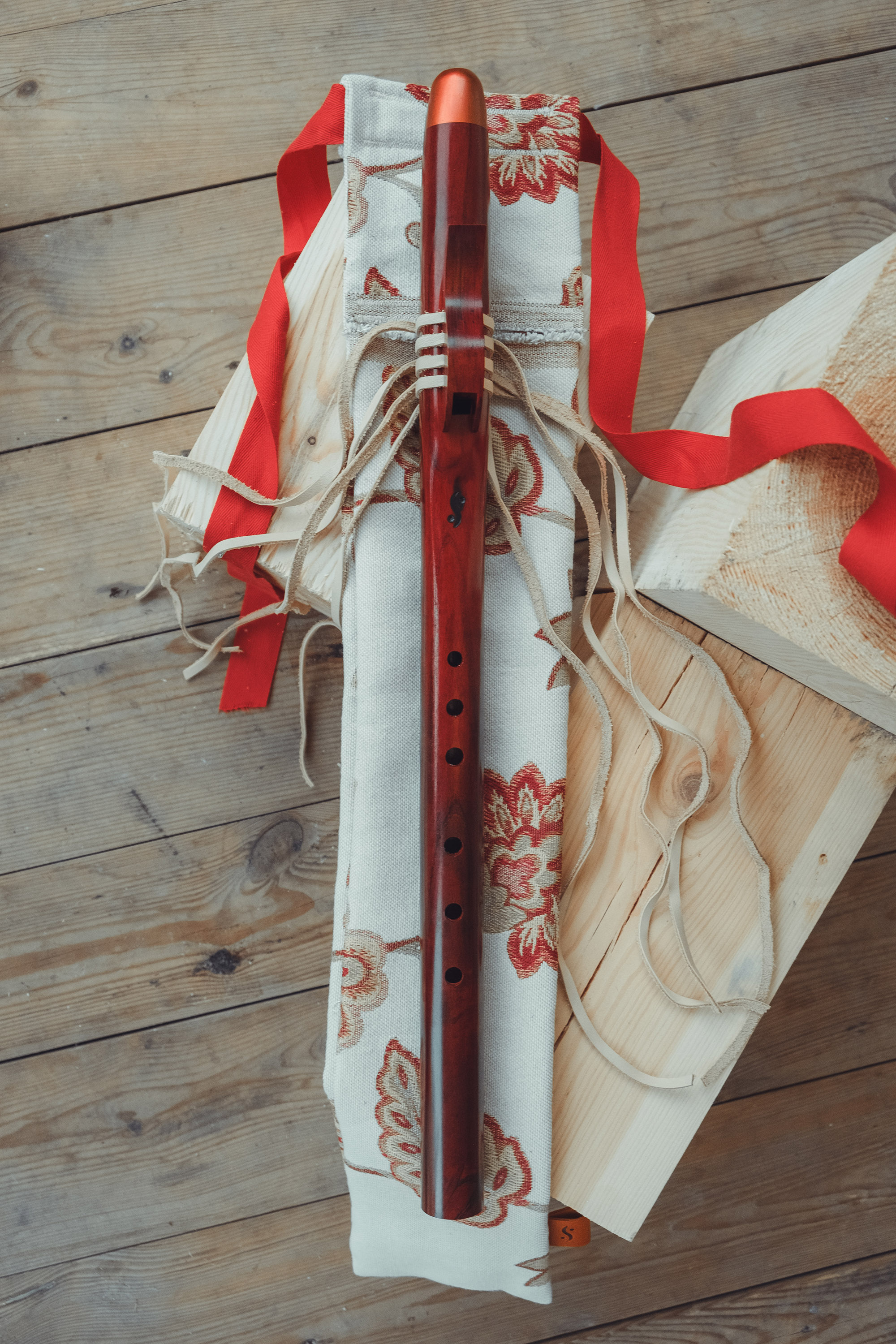 Ręcznie wykonany flet z drewna moreli pospolitej (Prunus armeniaca), pozyskanego z sadu owocowego. Flet prosty, 6-otworowy, w stylu rdzennych Amerykanów (Native American Style Flute), charakteryzuje się ciepłym brzmieniem. Skala pentatoniczna i heksatonika molowa umożliwiają szeroką ekspresję muzyczną. Flet został zabarwiony na rustykalny czerwony kolor, ozdobiony ornamentami w kolorze miedzianym, a ubytki w drewnie wypełniono żywicą epoksydową. Wykończenie typu French polishing zapewnia wysoką jakość i estetykę. Dokumentacja obejmuje konserwację, warunki przechowywania oraz certyfikat autentyczności.