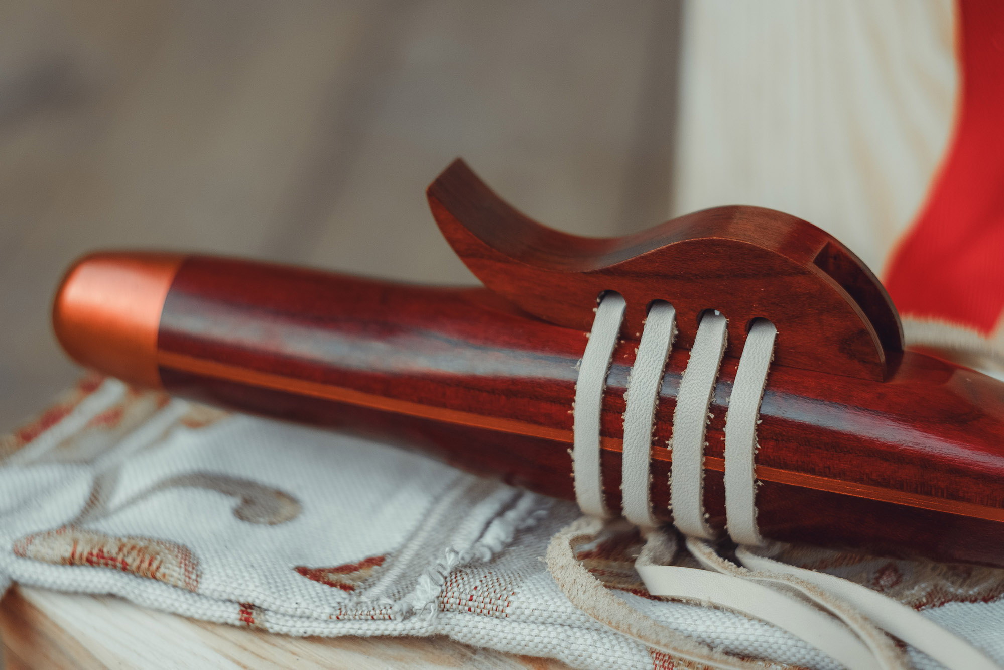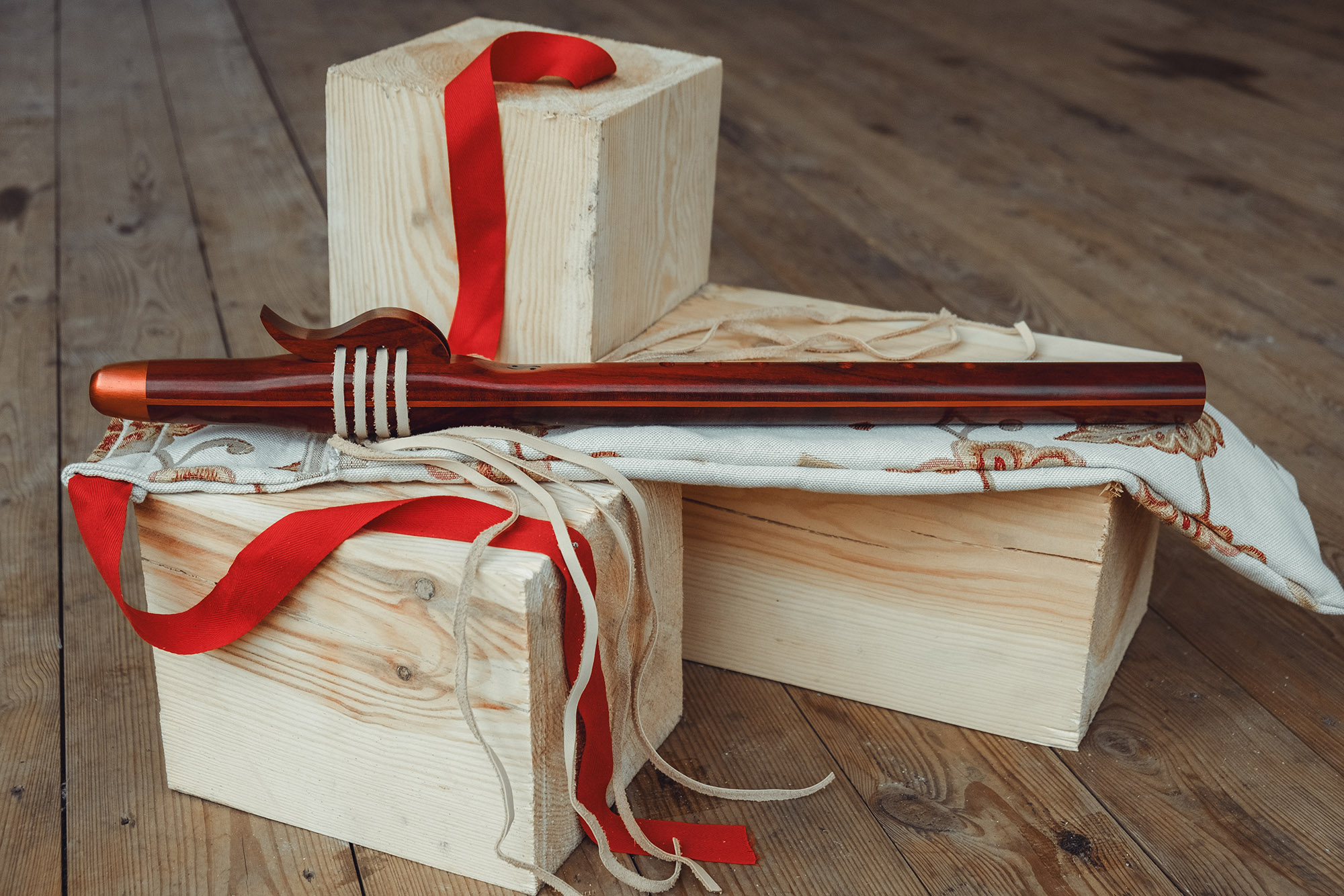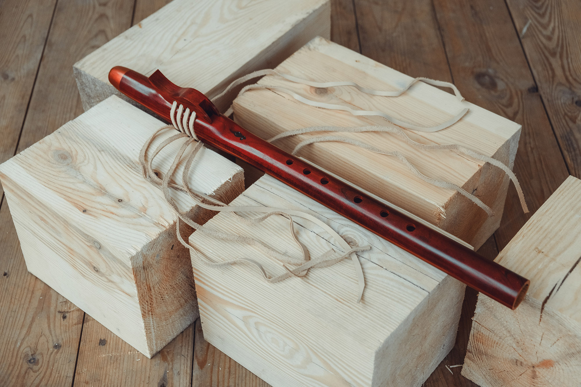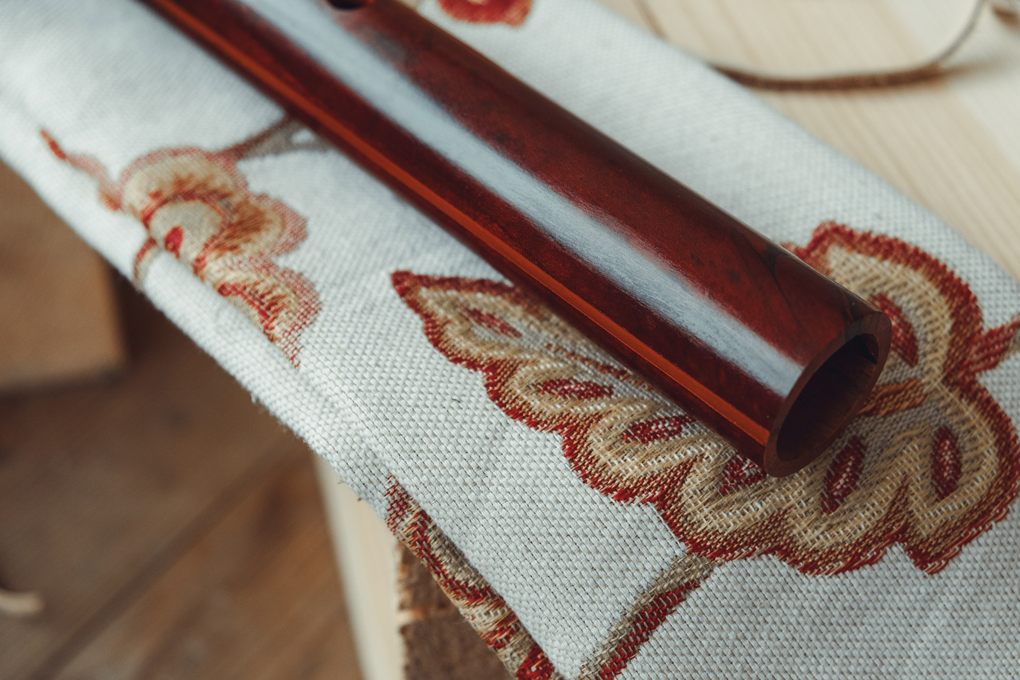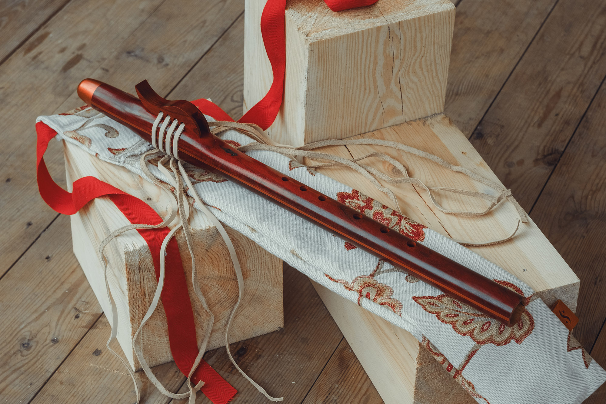 Ręcznie wykonany flet z drewna moreli pospolitej (Prunus armeniaca), pozyskanego z sadu owocowego. Flet prosty, 6-otworowy, w stylu rdzennych Amerykanów (Native American Style Flute), charakteryzuje się ciepłym brzmieniem. Skala pentatoniczna i heksatonika molowa umożliwiają szeroką ekspresję muzyczną. Flet został zabarwiony na rustykalny czerwony kolor, ozdobiony ornamentami w kolorze miedzianym, a ubytki w drewnie wypełniono żywicą epoksydową. Wykończenie typu French polishing zapewnia wysoką jakość i estetykę. Dokumentacja obejmuje konserwację, warunki przechowywania oraz certyfikat autentyczności.