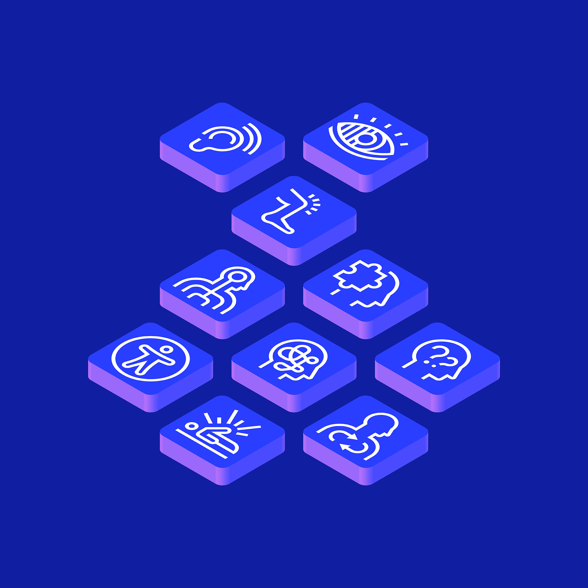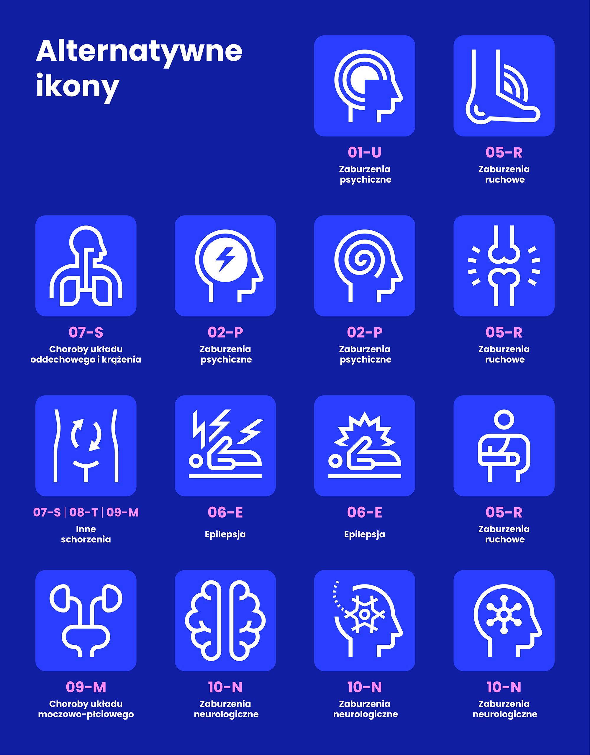 Ikony wspierają system identyfikacji wizualnej powiązany z podręcznikiem Dostępnościomierz, pomagając tworzyć bardziej inkluzywne ogłoszenia o pracę. Symbolizują różne przyczyny niepełnosprawności, takie jak upośledzenie umysłowe, choroby psychiczne, problemy ze słuchem i wzrokiem, epilepsję oraz upośledzenia ruchowe. Projekt spełnia standardy WCAG 2.1 i WCAG 2.2, co zapewnia ich dostępność. Stworzone w stylu Material You (Material Design 3 by Google) i Glyphicon, łączą nowoczesny wygląd z funkcjonalnością.