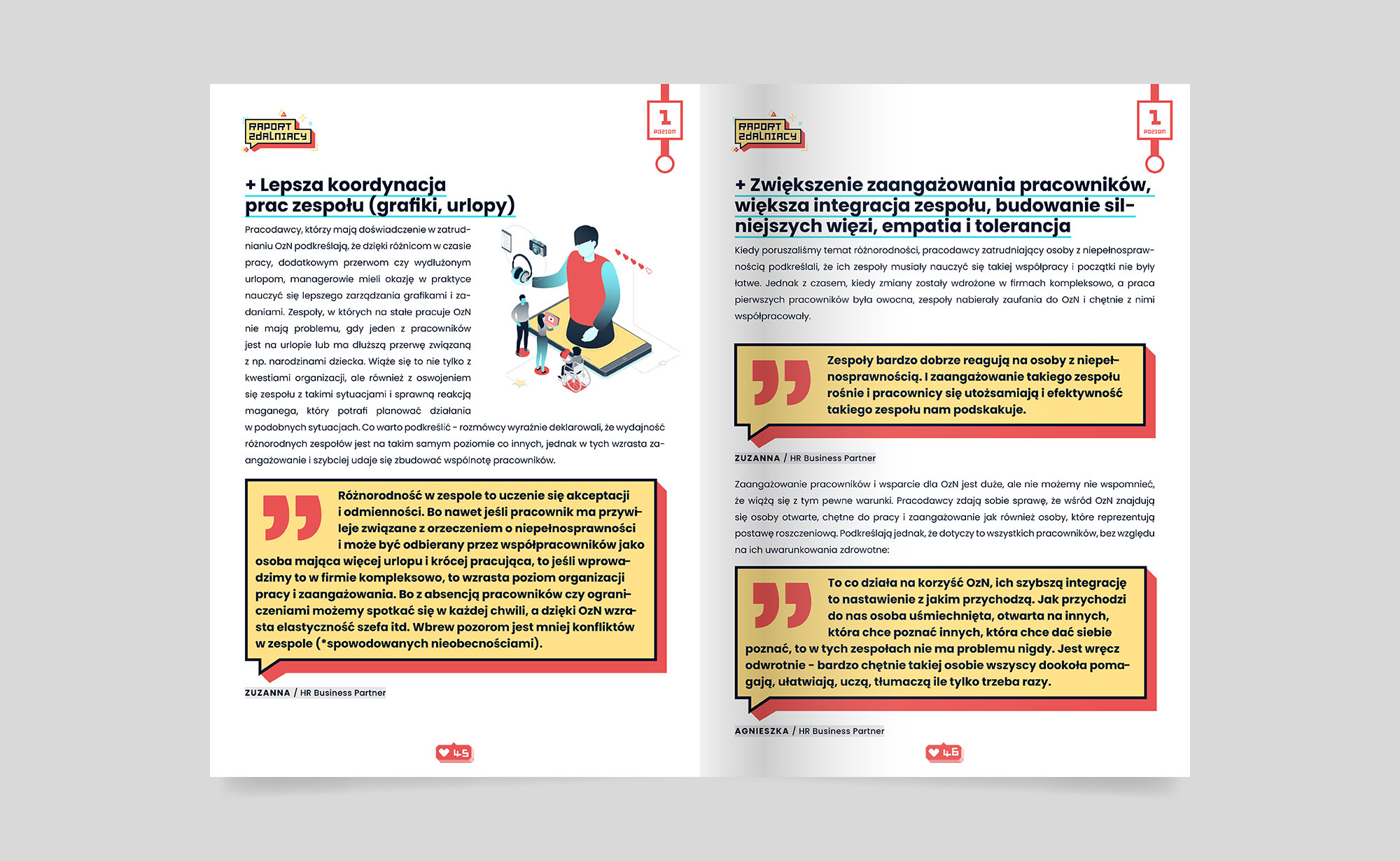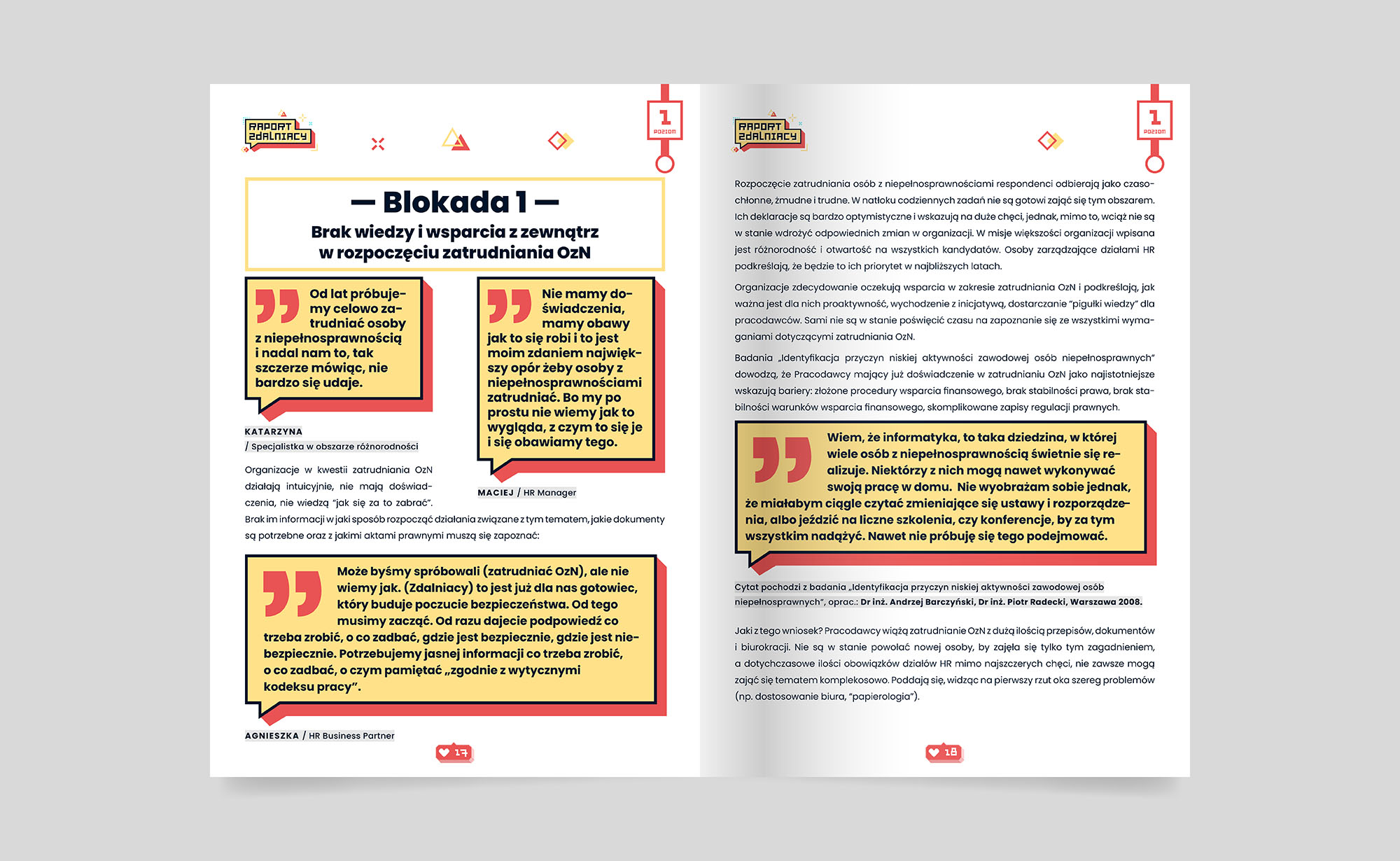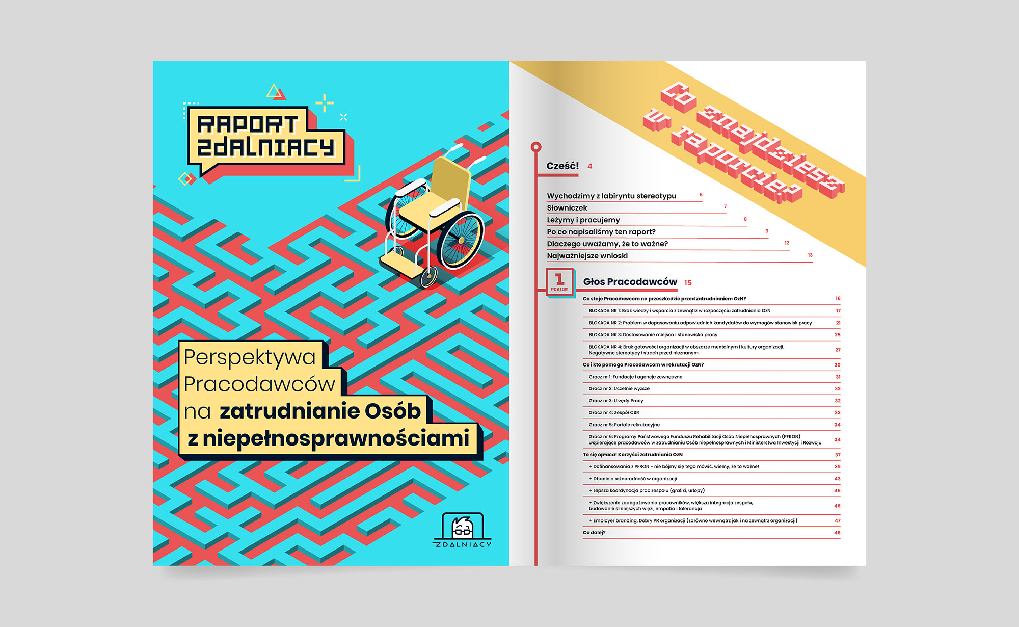 Raport „Zdalniacy” przedstawia perspektywę pracodawców na temat zatrudniania osób z niepełnosprawnościami. Omawia wyzwania i korzyści z tym związane. Analizuje bariery, które powstrzymują pracodawców, takie jak brak wiedzy, trudności w dopasowaniu stanowisk, konieczność dostosowania miejsc pracy oraz mentalne blokady i stereotypy. Raport opisuje wsparcie dostępne dla pracodawców, m.in. fundacje, urzędy pracy, programy PFRON i narzędzia technologiczne wspierające pracę zdalną. Sponsorem raportu jest Państwowy Fundusz Rehabilitacji Osób Niepełnosprawnych (PFRON).