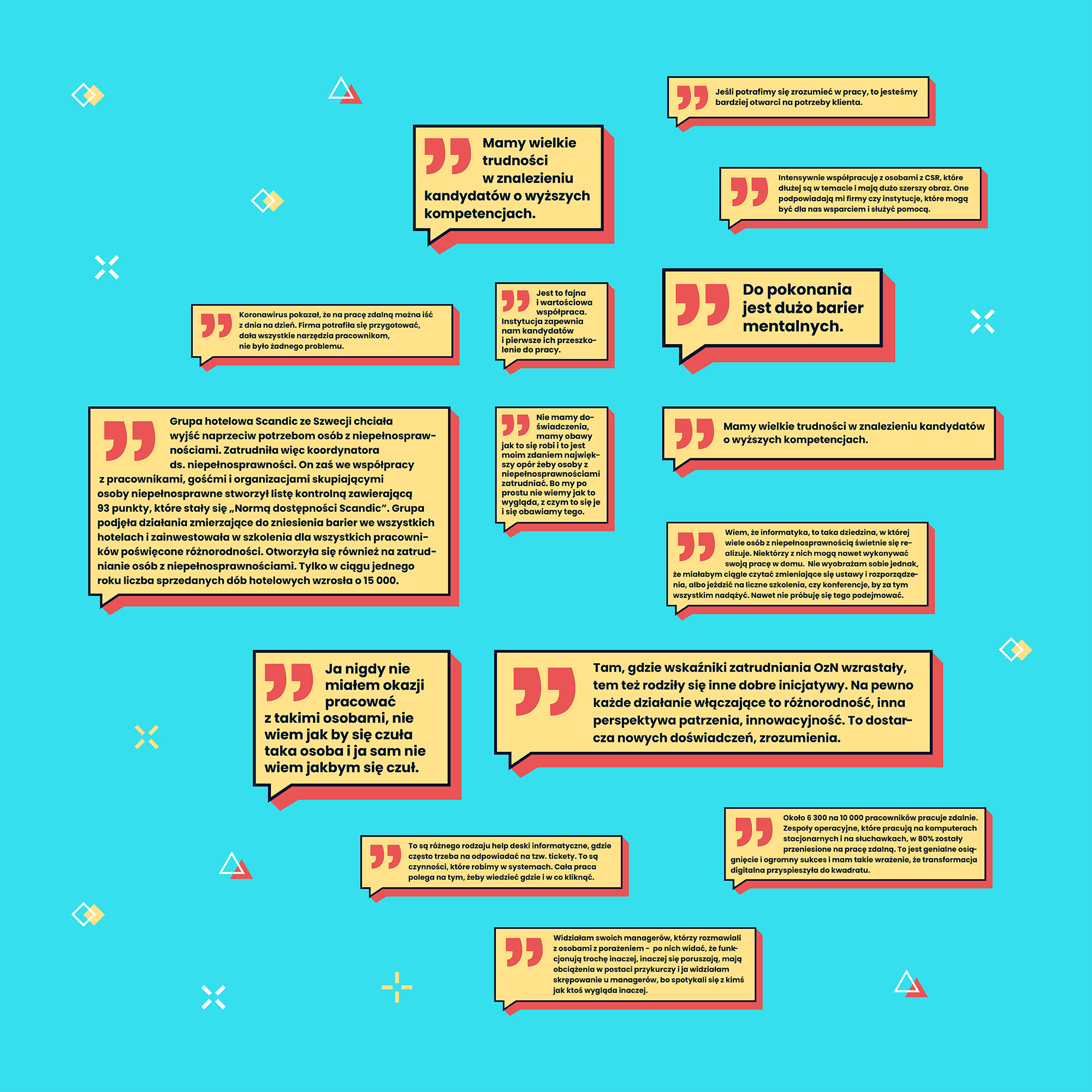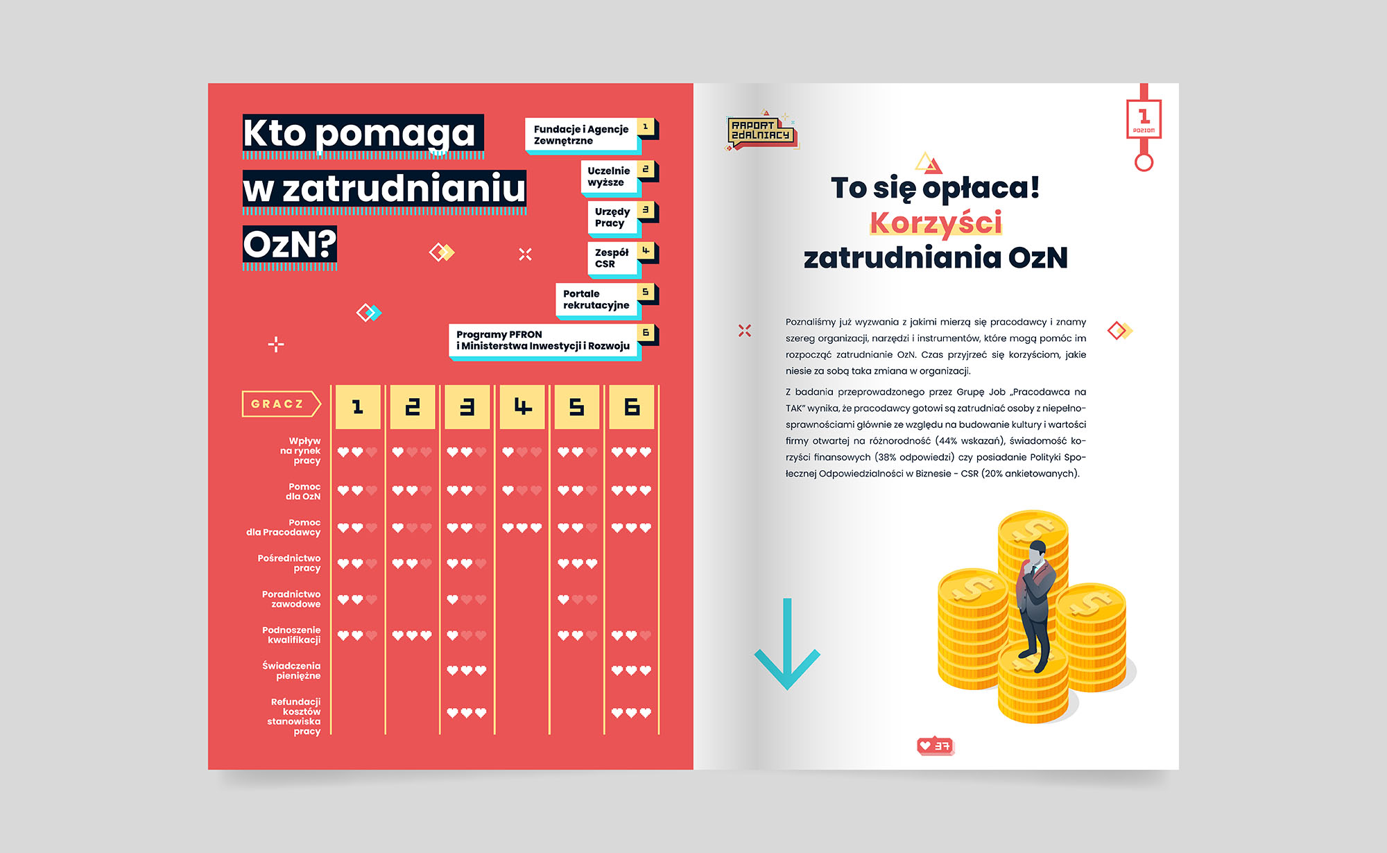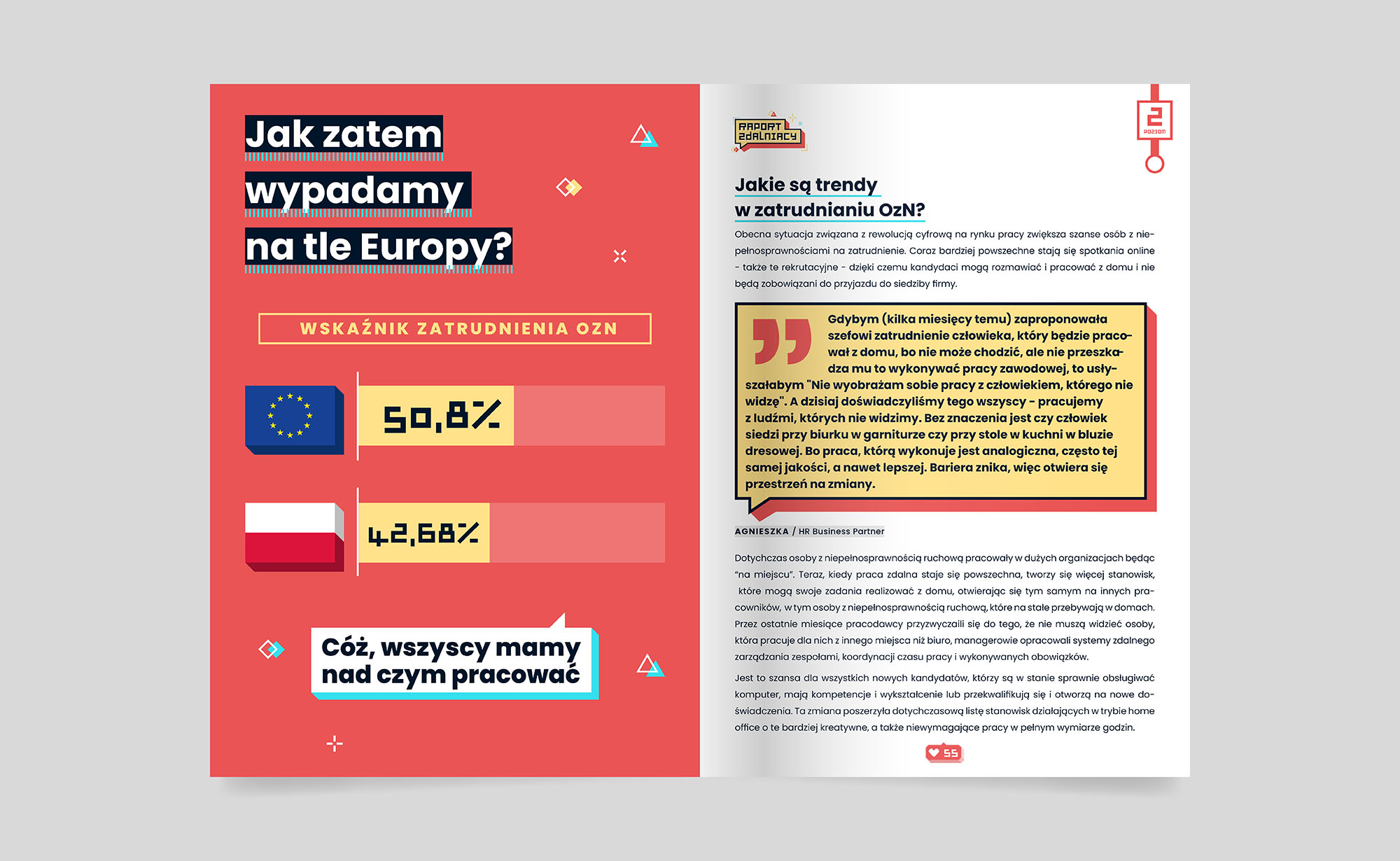 Raport „Zdalniacy” przedstawia perspektywę pracodawców na temat zatrudniania osób z niepełnosprawnościami. Omawia wyzwania i korzyści z tym związane. Analizuje bariery, które powstrzymują pracodawców, takie jak brak wiedzy, trudności w dopasowaniu stanowisk, konieczność dostosowania miejsc pracy oraz mentalne blokady i stereotypy. Raport opisuje wsparcie dostępne dla pracodawców, m.in. fundacje, urzędy pracy, programy PFRON i narzędzia technologiczne wspierające pracę zdalną. Sponsorem raportu jest Państwowy Fundusz Rehabilitacji Osób Niepełnosprawnych (PFRON).