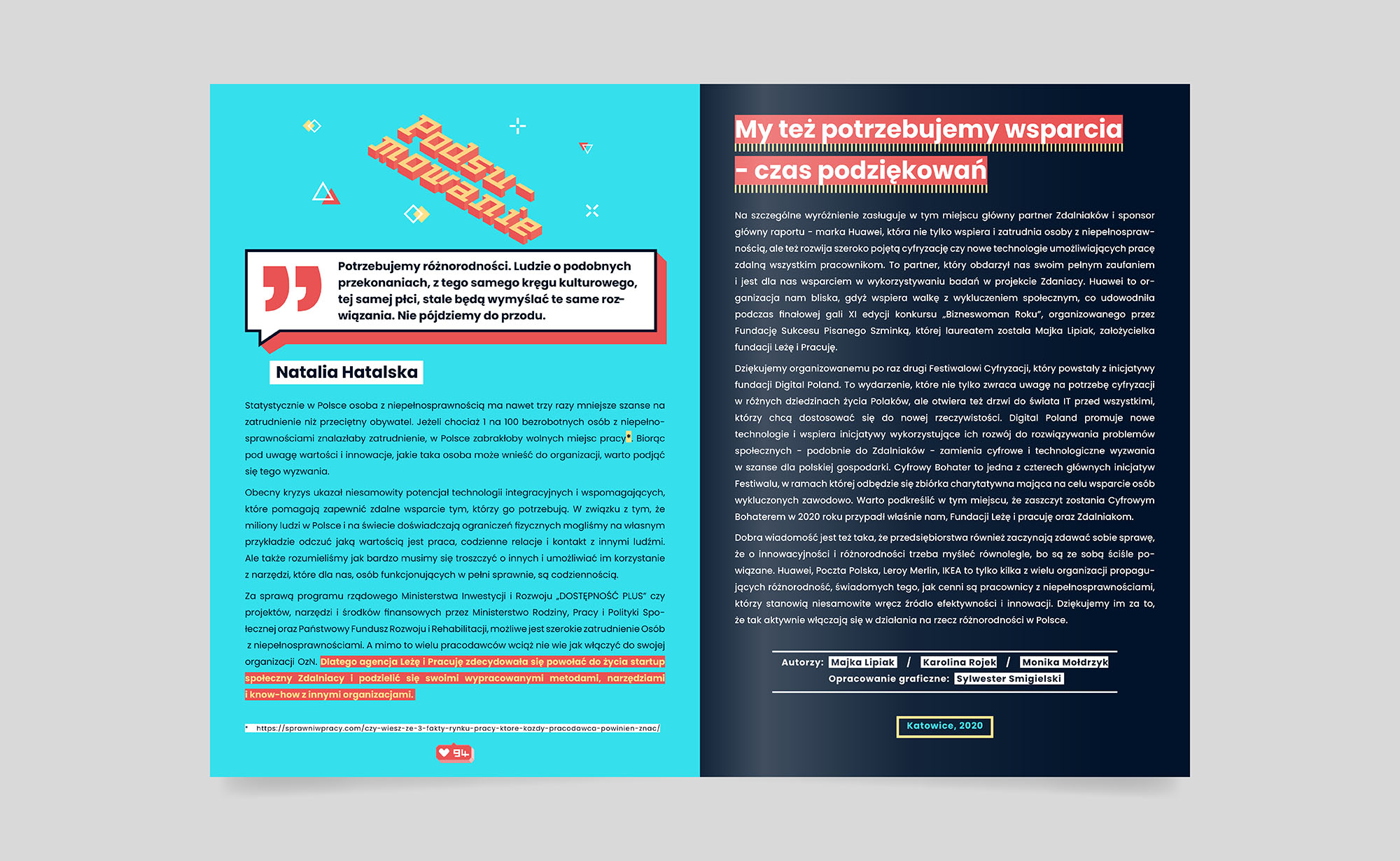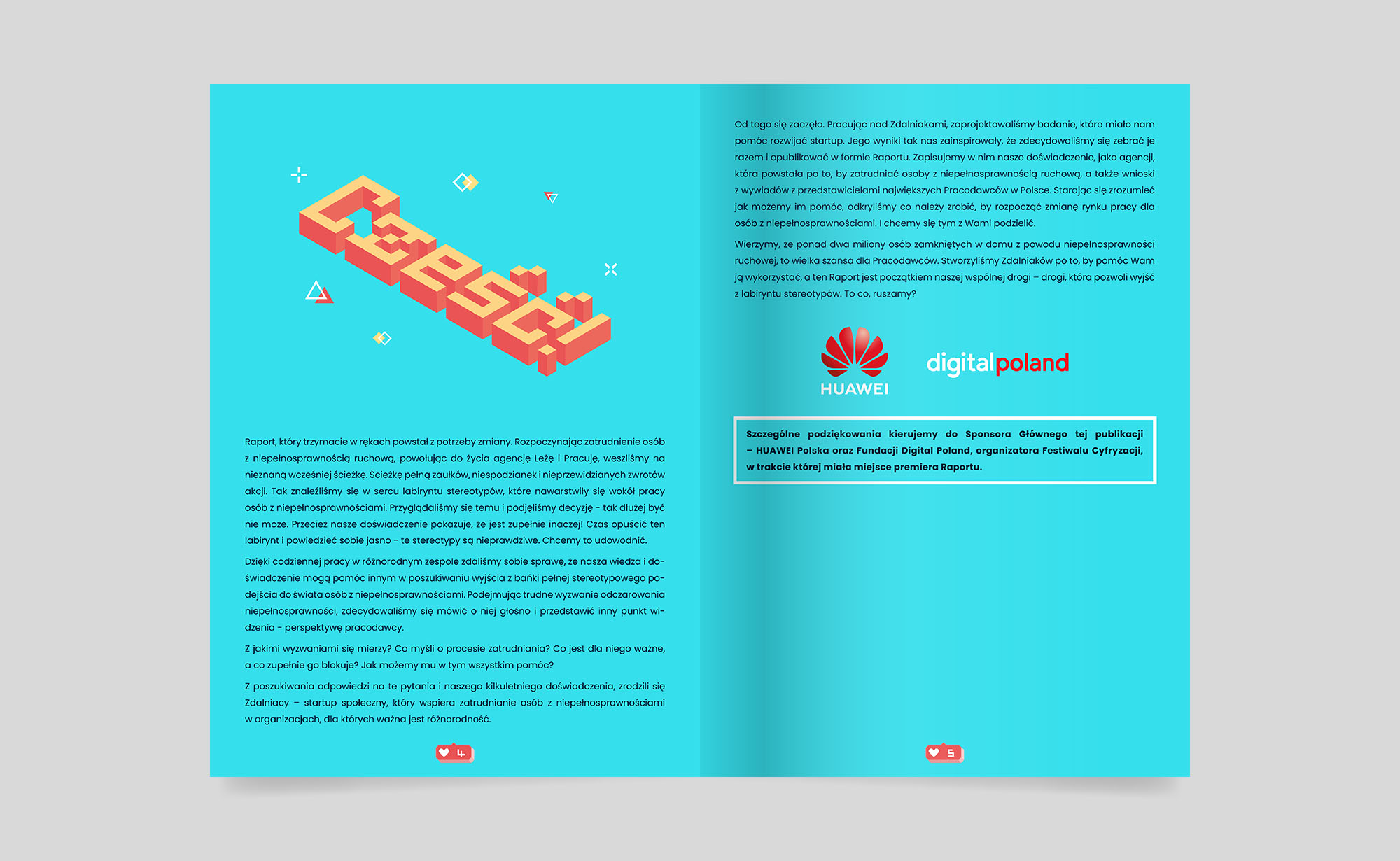 Fundacja Leżę i Pracuję, inicjator raportu, działa jako agencja marketingowa zatrudniająca osoby z niepełnosprawnością ruchową. Promuje integrację OzN na rynku pracy. Huawei Polska i Fundacja Digital Poland wspierają raport jako partnerzy. Pomagają szerzyć świadomość oraz promować dostępność cyfrową i technologiczną w zatrudnianiu osób z niepełnosprawnościami.