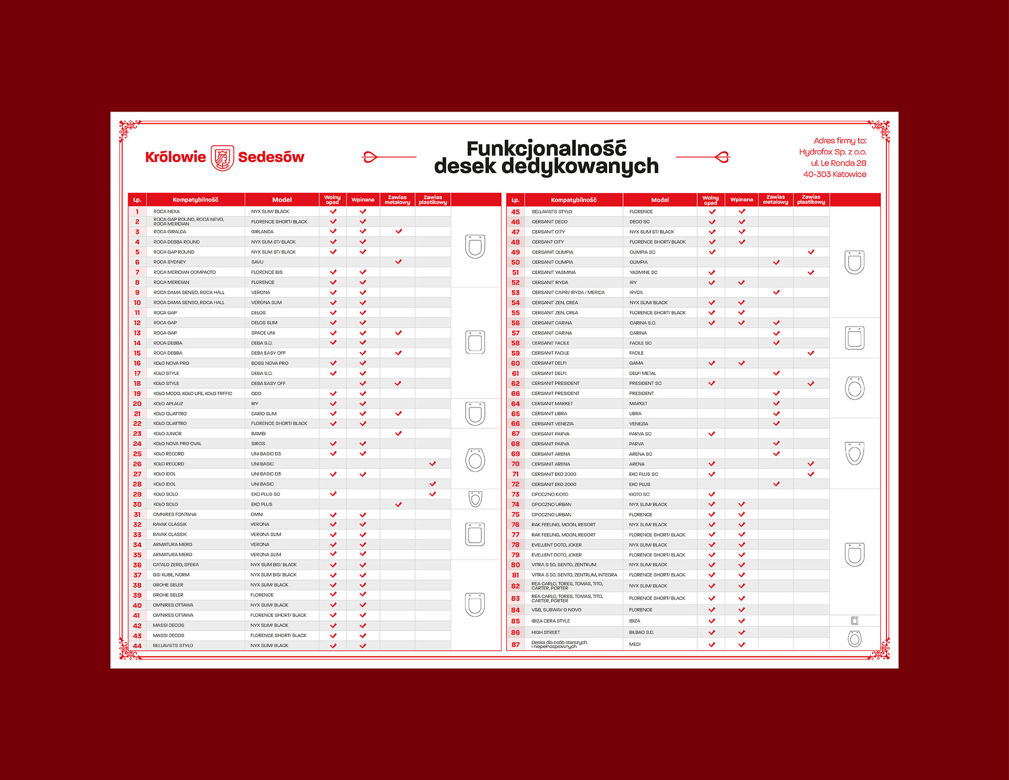 Królowie Sedesów to polska firma, która produkuje i sprzedaje wyposażenie łazienkowe, takie jak deski sedesowe, stelaże do toalet, pisuary, bidety oraz zawory. Ich produkty są uniwersalne, co pozwala na dopasowanie do wielu modeli misek toaletowych renomowanych producentów, takich jak KOŁO i Roca.