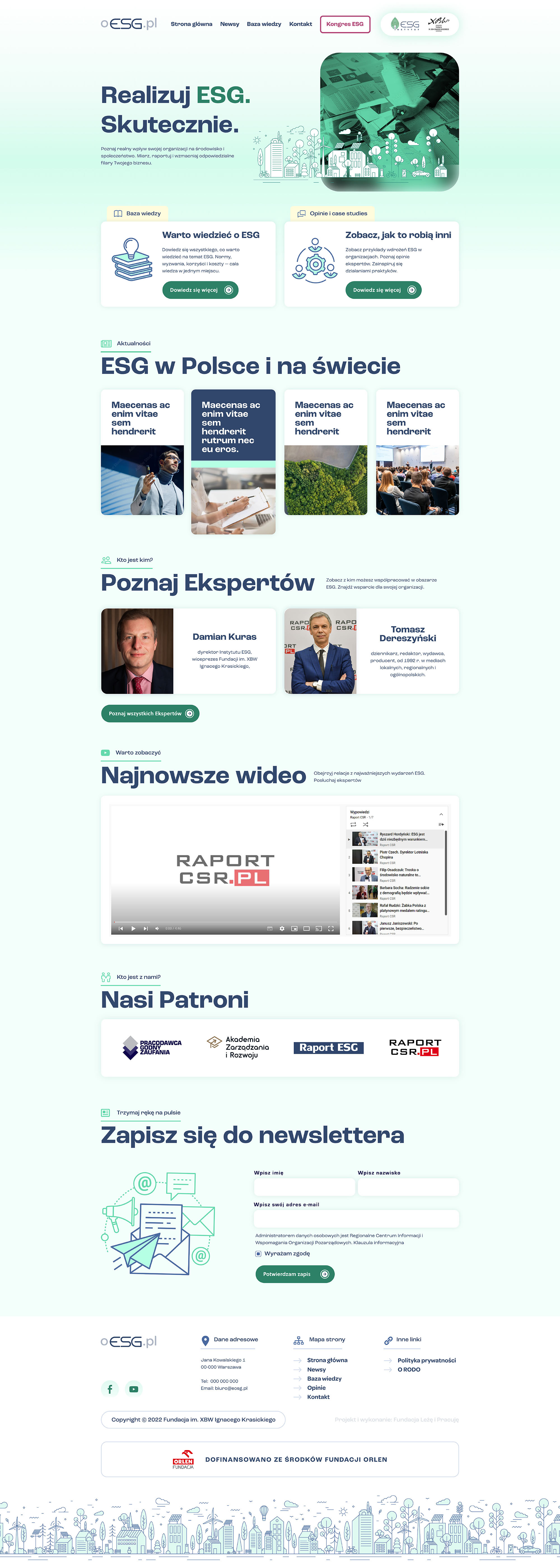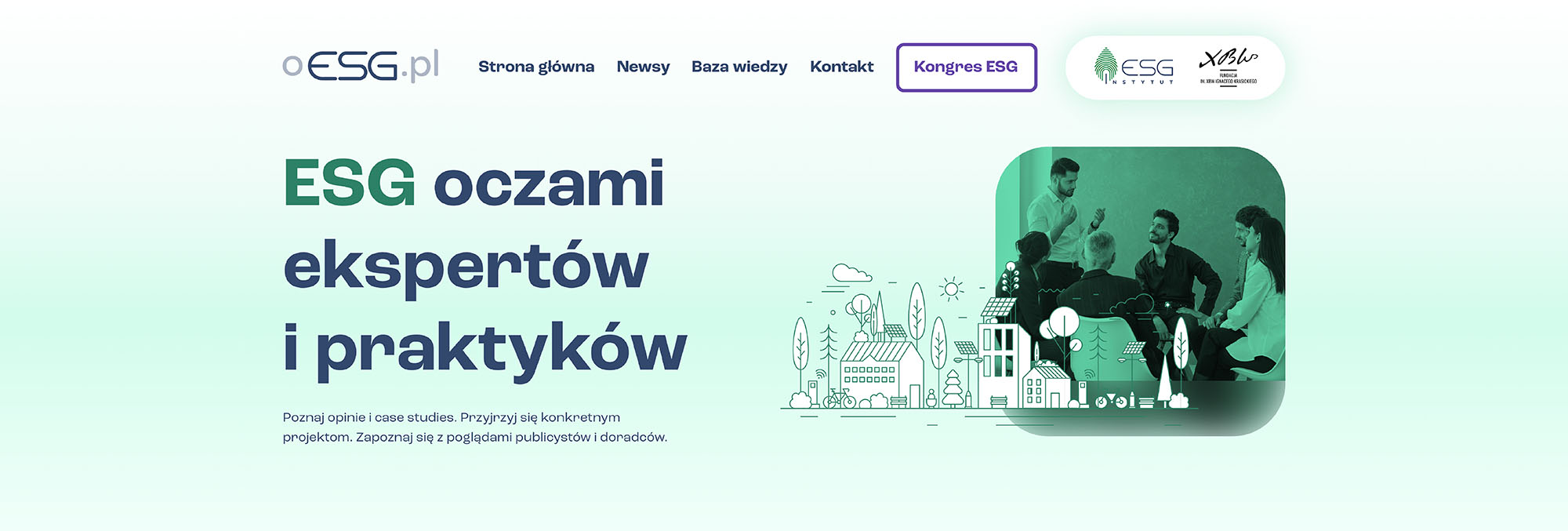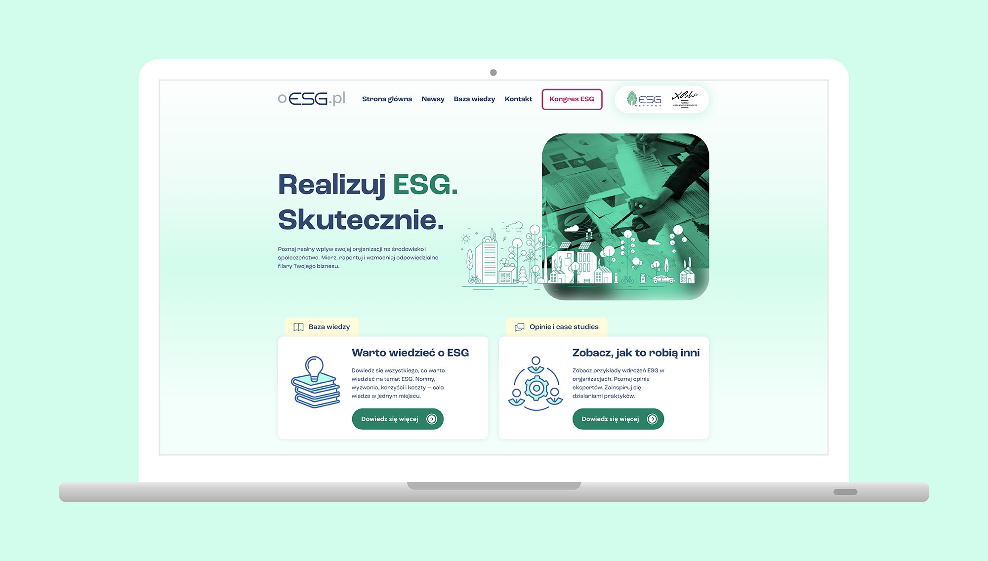 OESG.pl to strona organizacji promującej odpowiedzialność biznesu poprzez normy ESG (środowisko, społeczeństwo, zarządzanie). Serwis oferuje zasoby edukacyjne, raporty, oraz relacje z wydarzeń i kongresów na temat zrównoważonego rozwoju. W projekcie strony, wykonanym w Adobe XD, wykorzystano ilustracje z Adobe iStock, które zostały dodatkowo zmodyfikowane w Adobe Illustrator, nadając stronie nowoczesny i profesjonalny charakter.