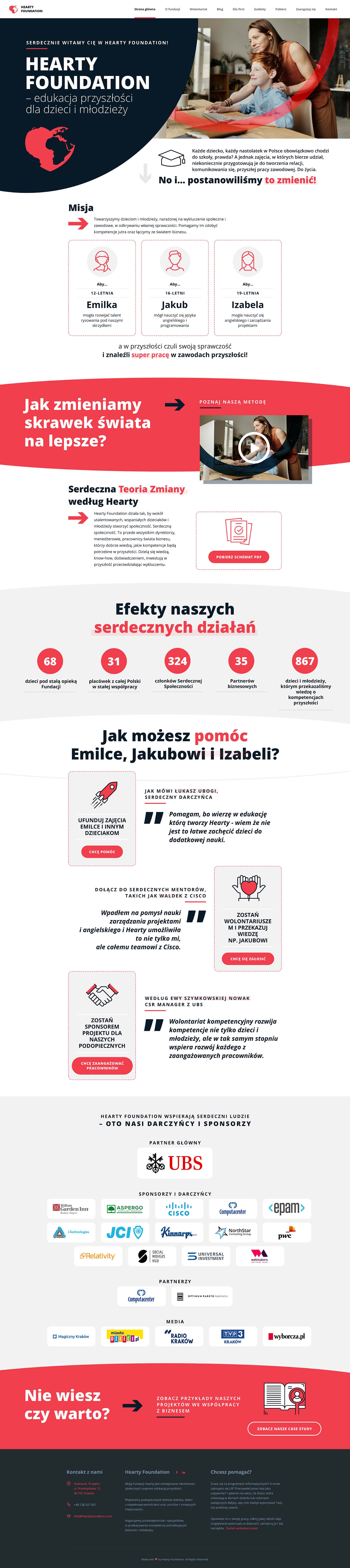 Hearty Foundation wspiera młodzież zagrożoną wykluczeniem społecznym, oferując programy edukacyjne rozwijające kompetencje cyfrowe, społeczne i zawodowe. Fundacja realizuje warsztaty, mentoring i wsparcie psychologiczne, koncentrując się na długofalowym rozwoju młodzieży. Projekt strony internetowej został wykonany w Adobe XD, z wykorzystaniem zasobów z Adobe Stock, co nadaje stronie profesjonalny i nowoczesny charakter wspierający misję fundacji.