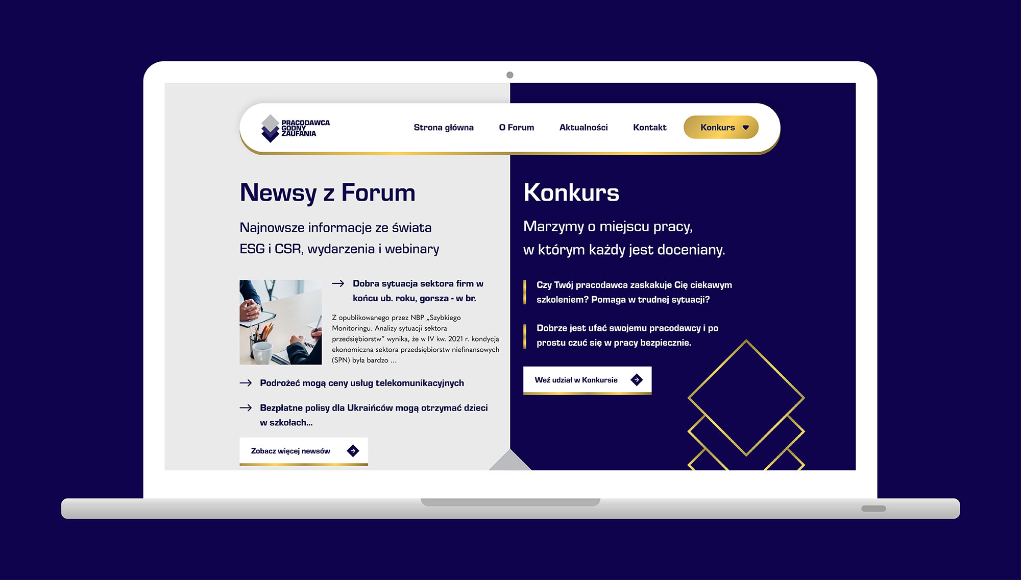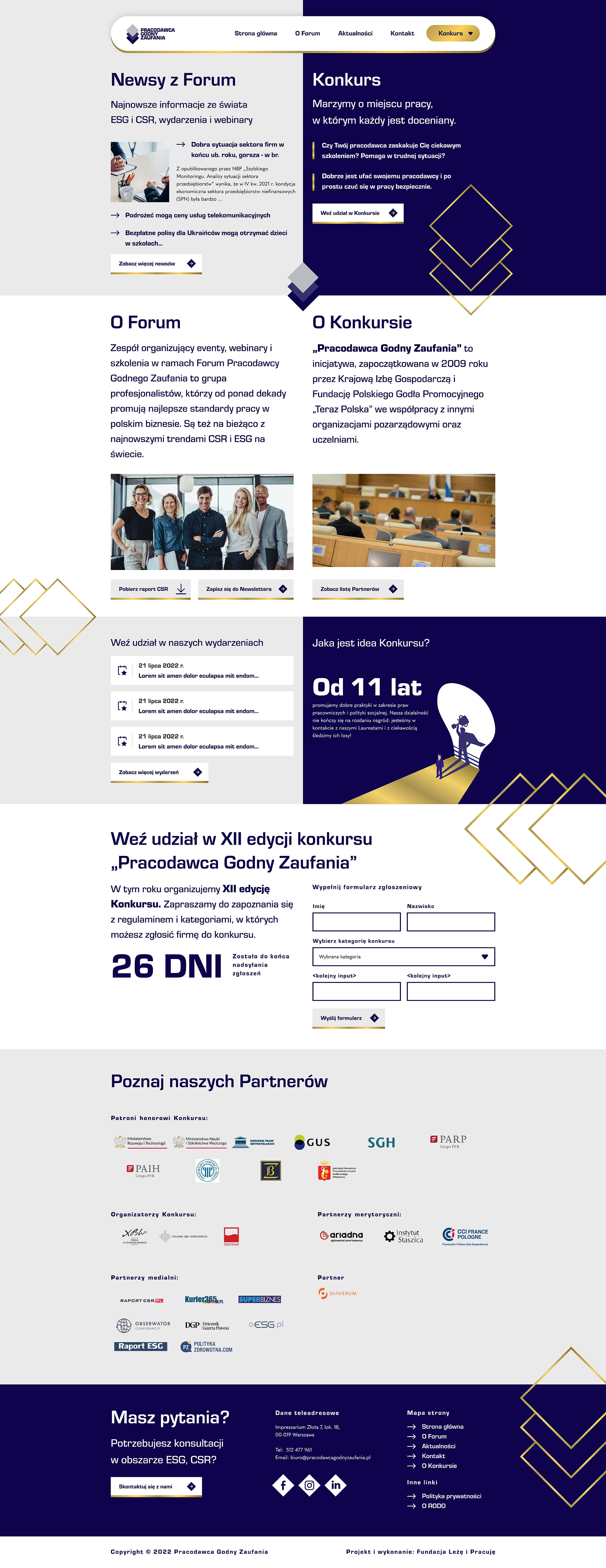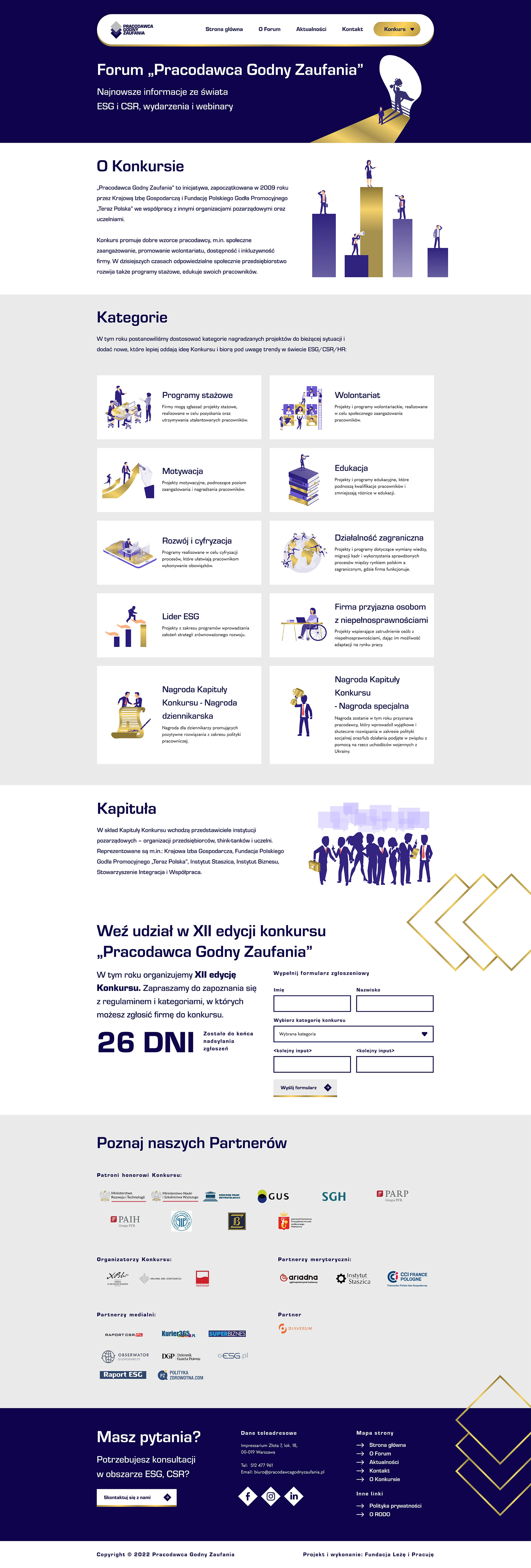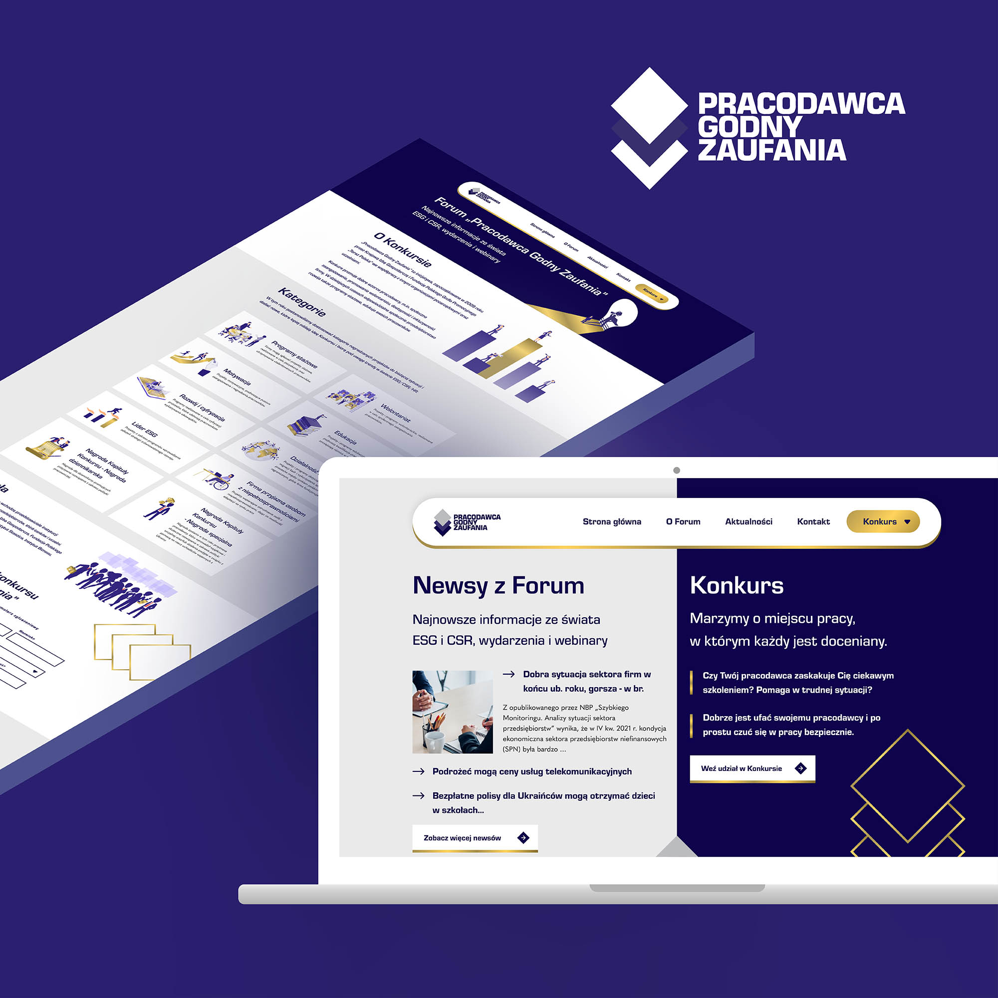 Pracodawca Godny Zaufania to inicjatywa promująca odpowiedzialnych pracodawców poprzez doroczny konkurs. Strona skupia się na wspieraniu standardów pracowniczych, takich jak CSR i ESG, w polskim biznesie. Prezentuje aktualności i kampanie edukacyjne oraz umożliwia udział w konkursie wyróżniającym firmy za innowacyjne praktyki pracownicze. Projekt strony wykonano w Adobe XD, z użyciem ilustracji z Adobe iStock, dodatkowo zmodyfikowanych w Adobe Illustrator, co nadaje jej profesjonalny i estetyczny charakter.