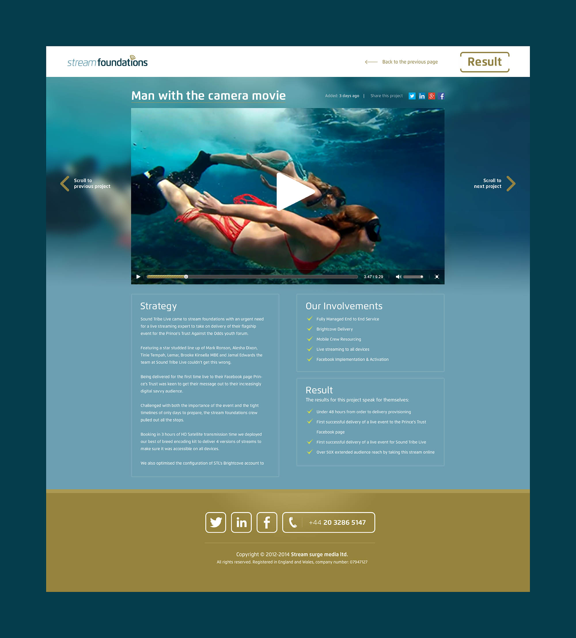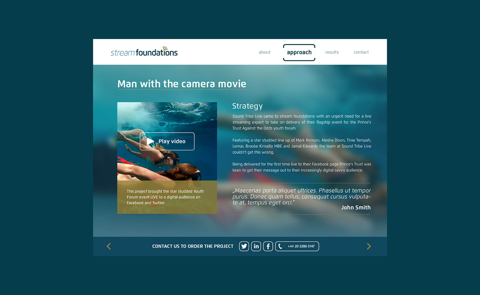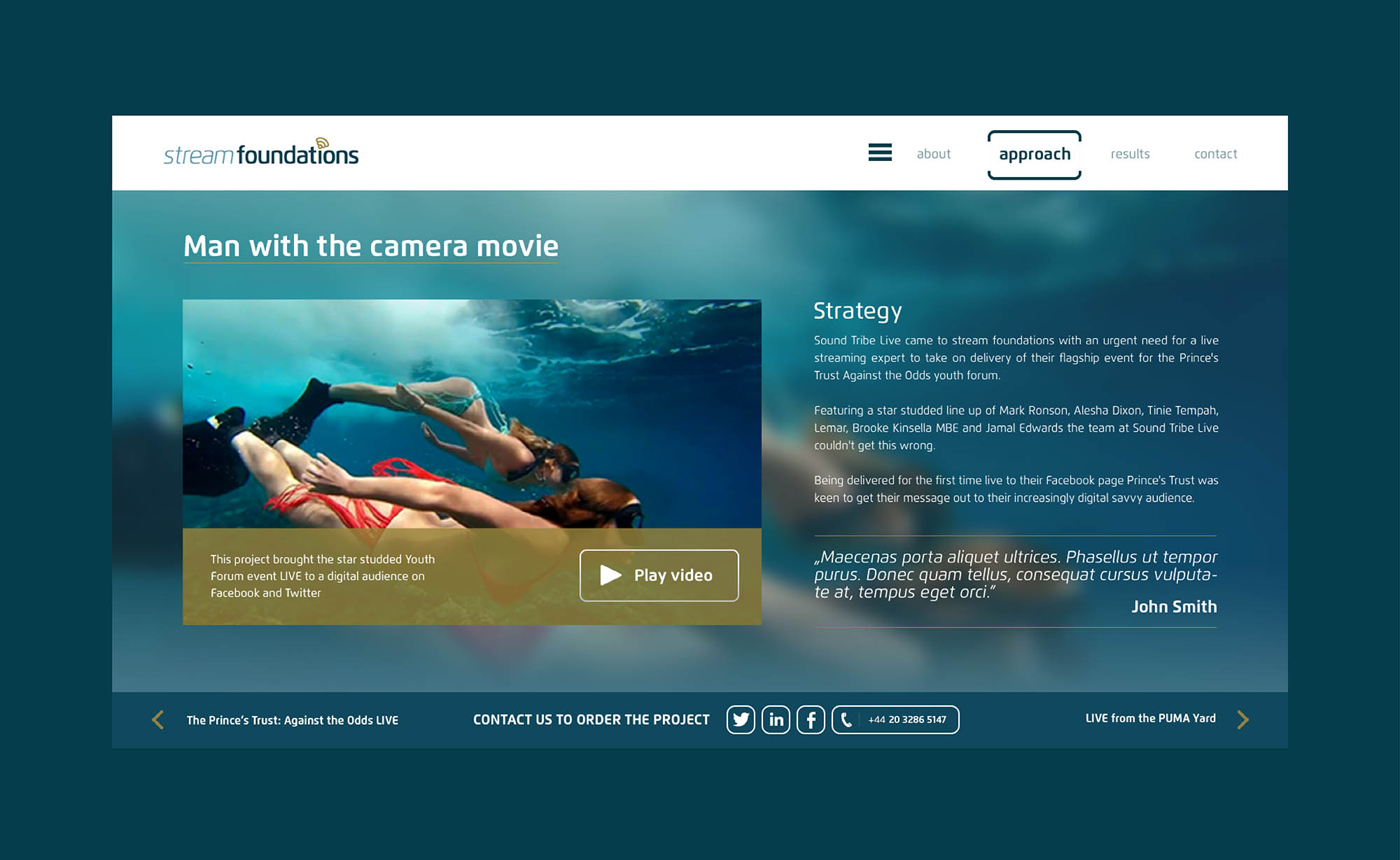 Stream Foundations, założona w 2012 roku, koncentruje się na tworzeniu zapotrzebowania na inicjatywy wideo cyfrowego. Firma wspiera klientów z branży mediów, wydawnictw, marek i korporacji, pomagając im wykorzystać potencjał wideo cyfrowego do zwiększenia ich wyników biznesowych.