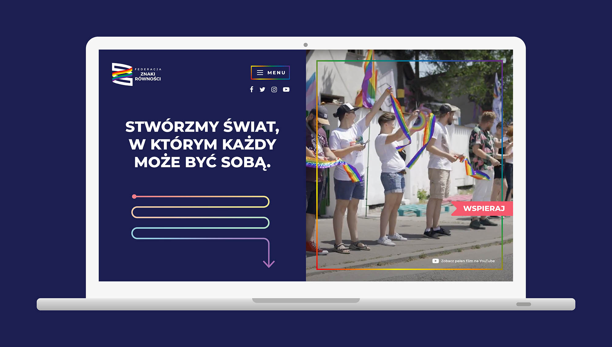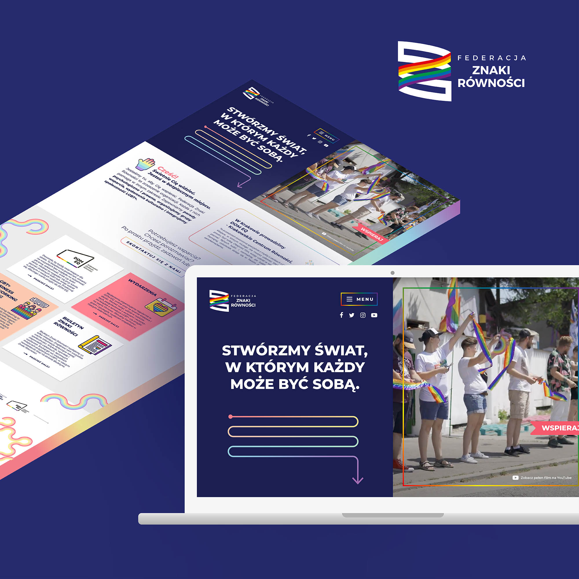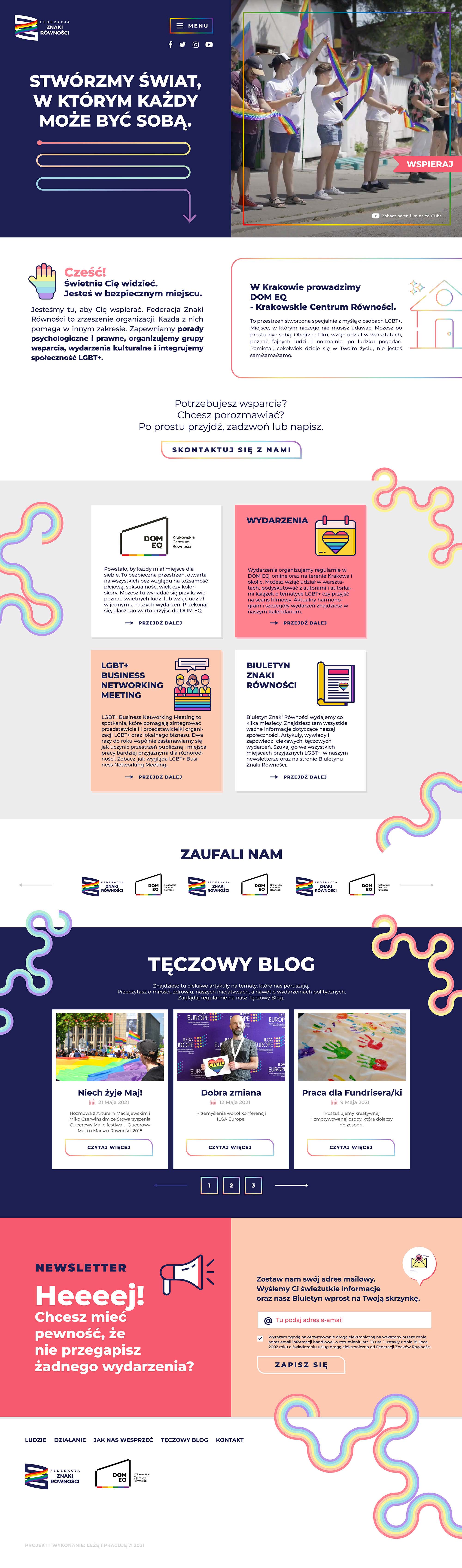 Federacja Znaki Równości działa na rzecz społeczności LGBT+ w Polsce, oferując wsparcie prawne, psychologiczne oraz organizując wydarzenia kulturalne i integracyjne. Prowadzi także DOM EQ – Krakowskie Centrum Równości. Strona internetowa, wykonana w Adobe Illustrator, wykorzystuje ilustracje z Adobe iStock, które zostały dodatkowo zmodyfikowane w Adobe Illustrator, nadając jej wyrazisty, profesjonalny charakter wspierający misję organizacji.